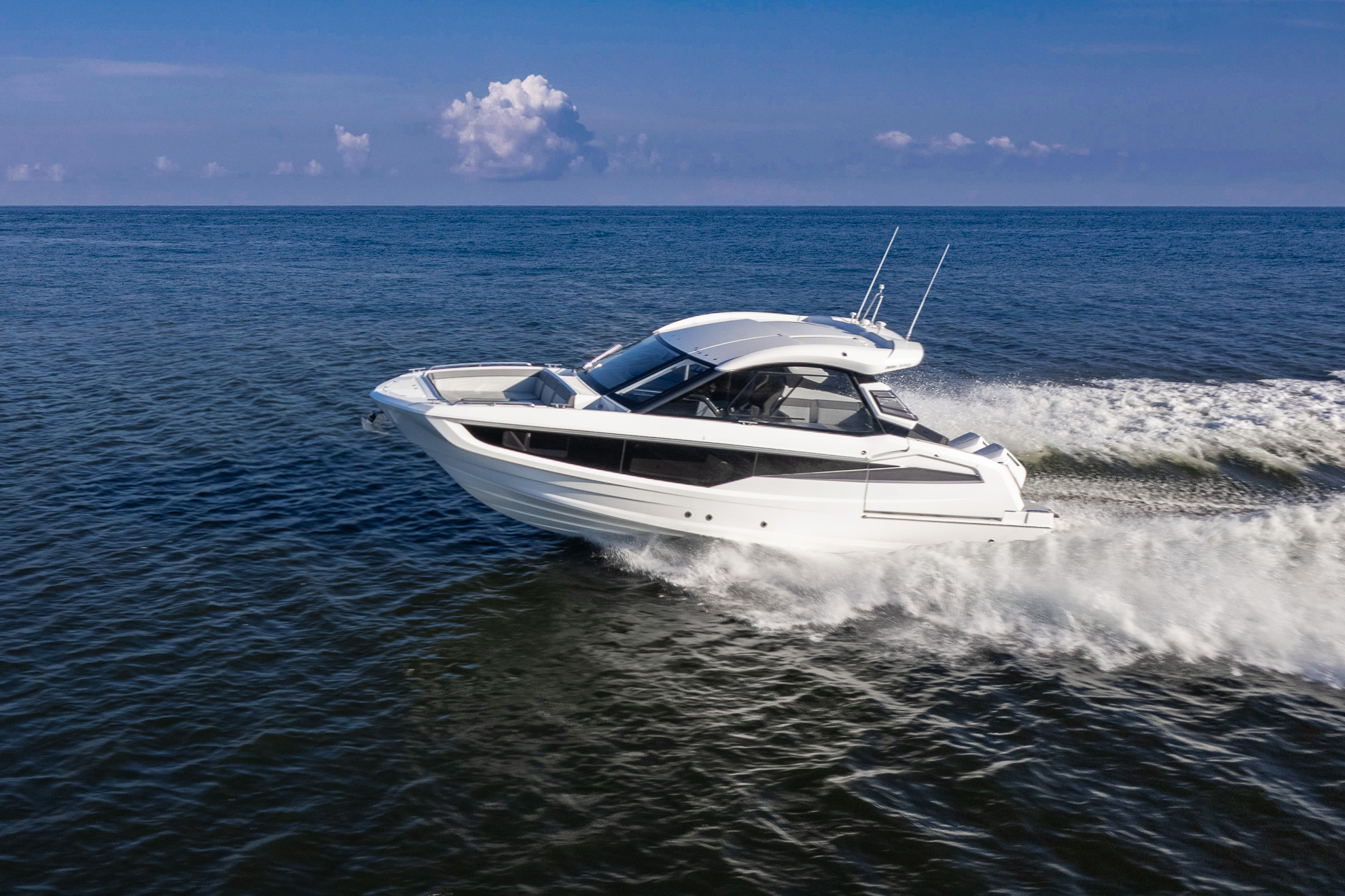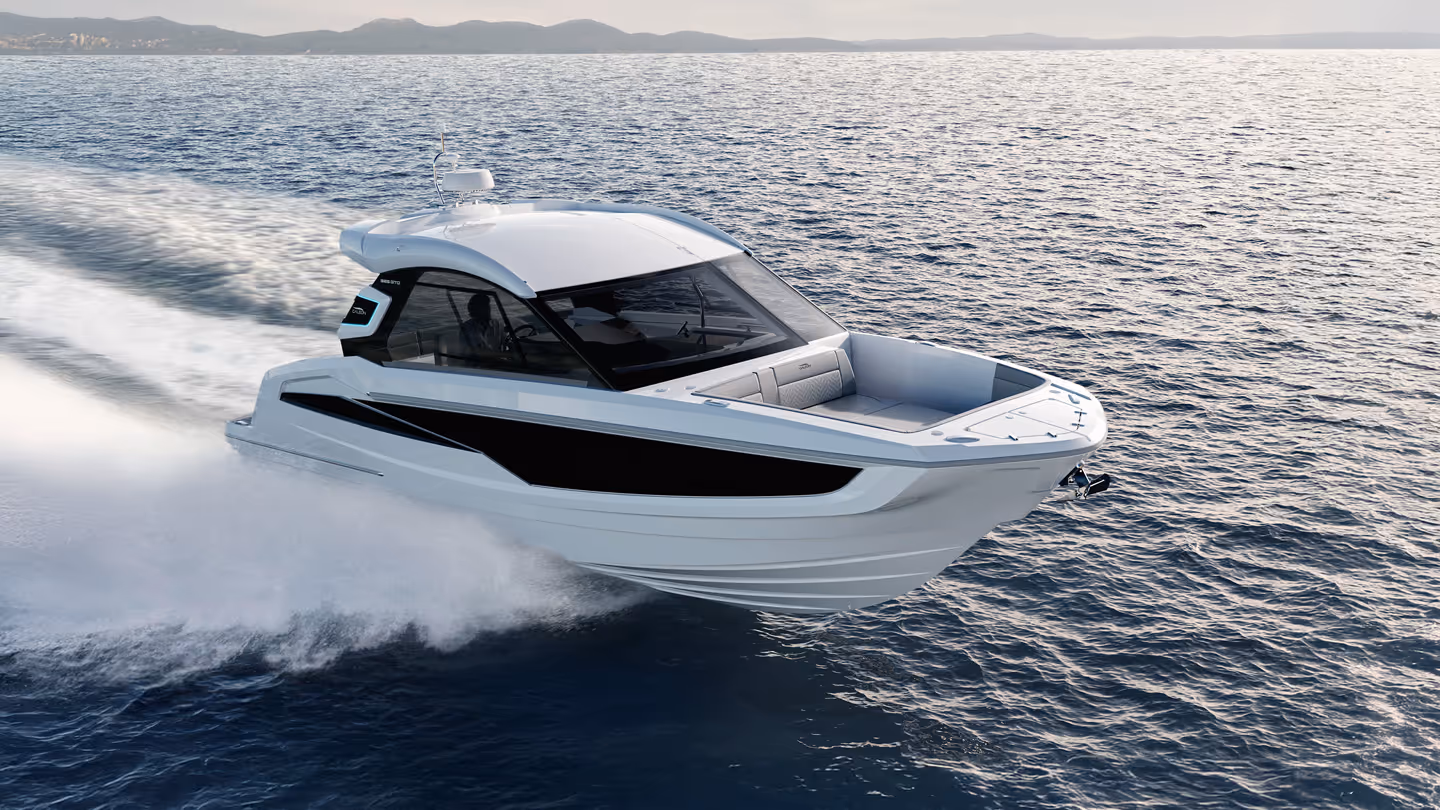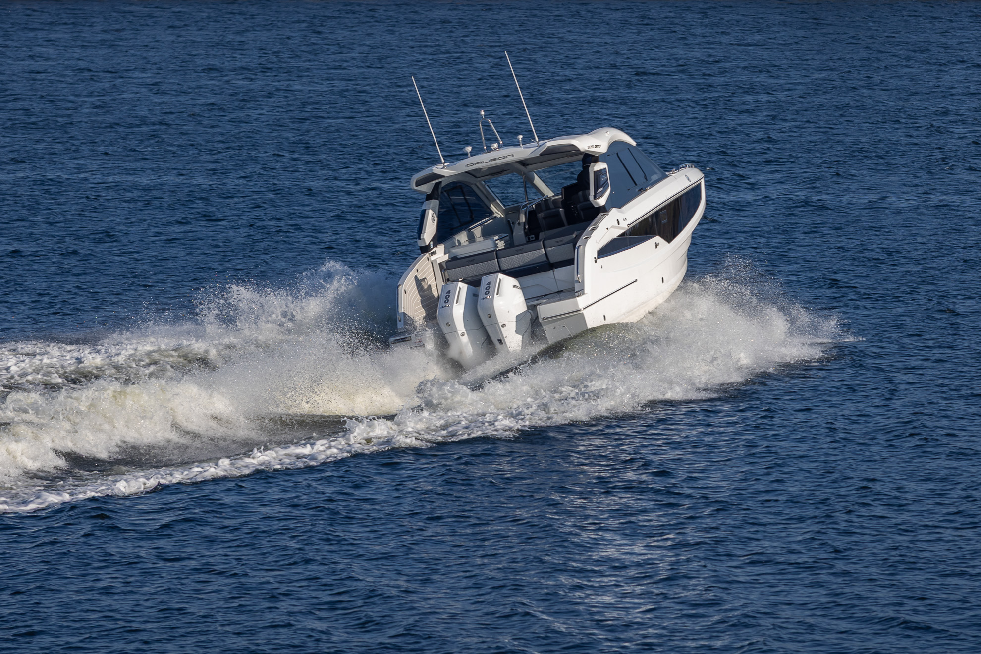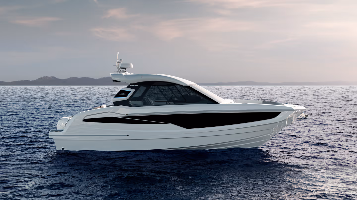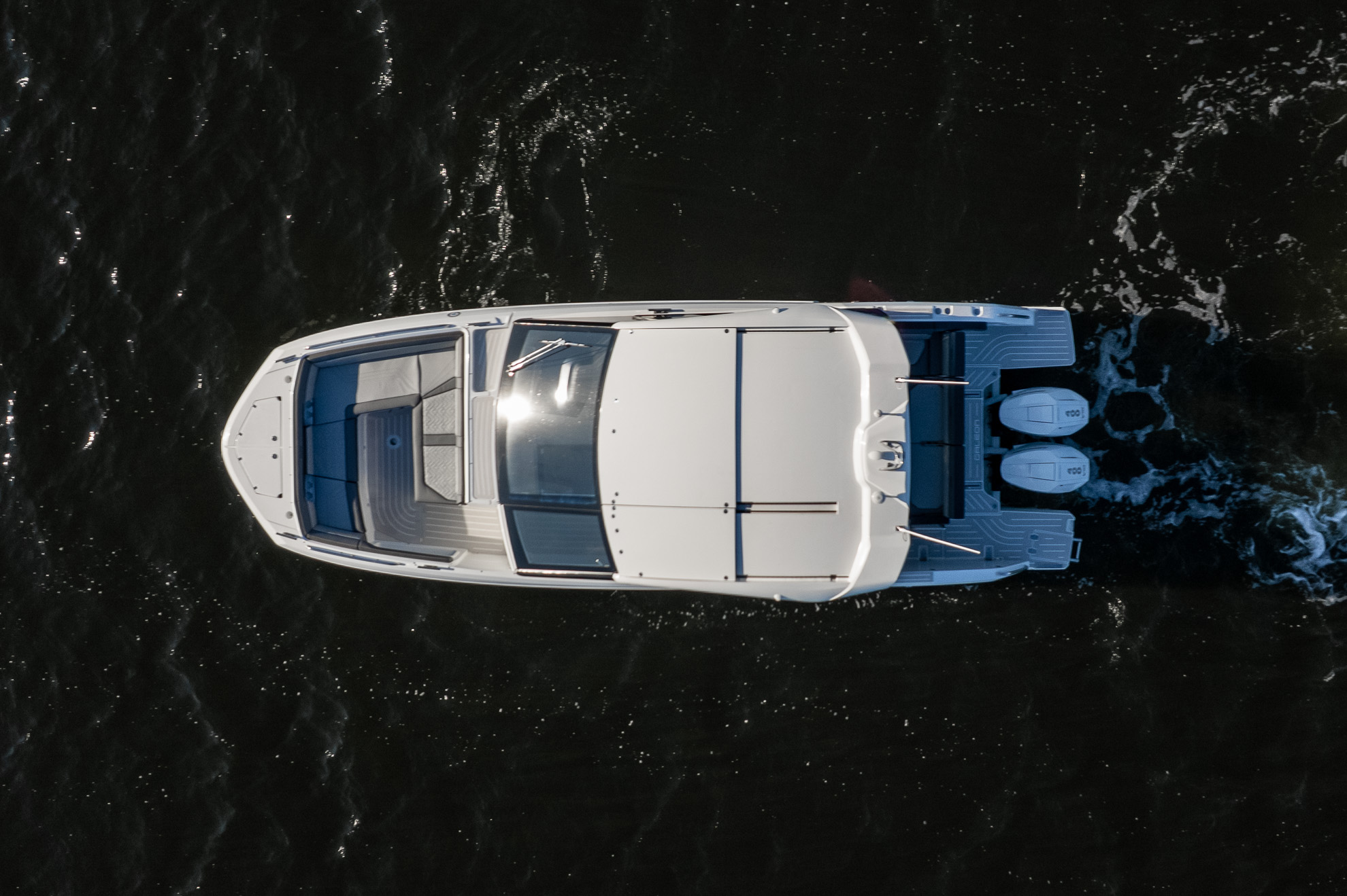 Powered by twin outboards and crowned with a lightweight carbon fiber hardtop, this sleek powerhouse delivers thrilling speed with refined elegance. The expansive bow features a fold-down balcony for effortless connection with the water, while the open-concept layout offers a central lounge with reversible seating – perfect for entertaining or relaxing in style. Enjoy a fully equipped wet galley, extendable SureShade® awning for sun protection, and a state-of-the-art helm with adjustable sport seats, intuitive joystick docking, and DPS digital anchoring. Every detail is engineered for adventure, comfort, and commanding presence on the water.