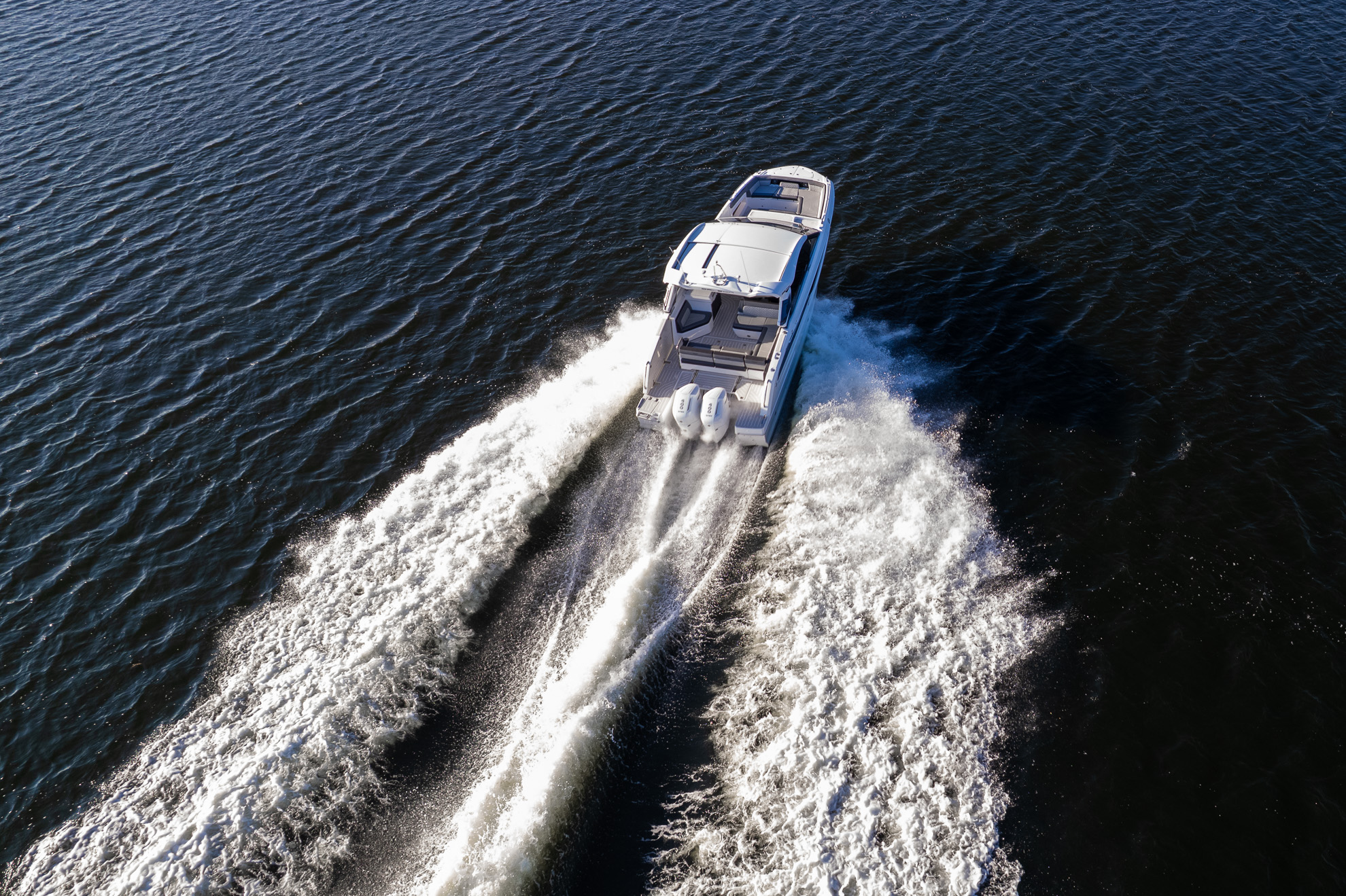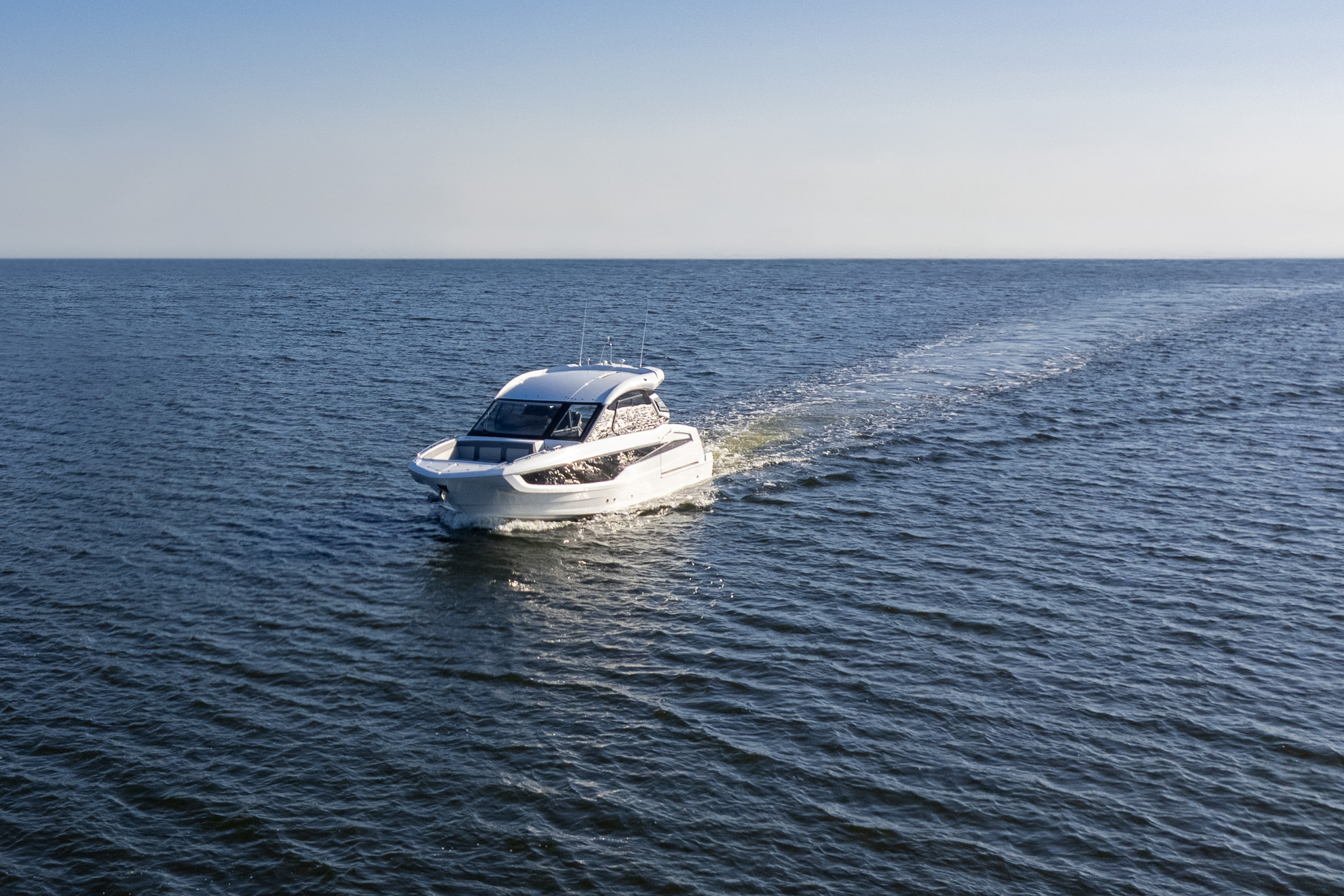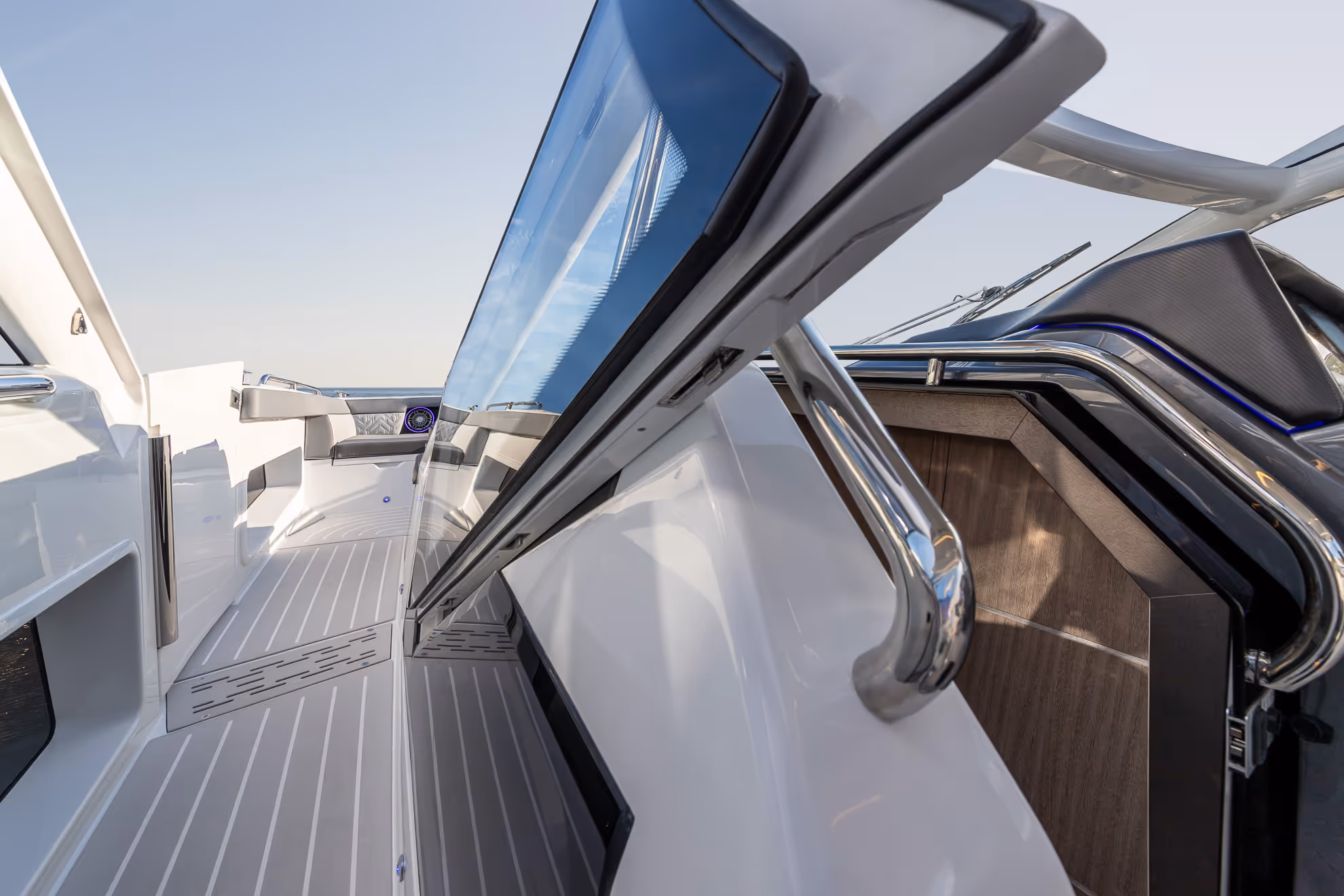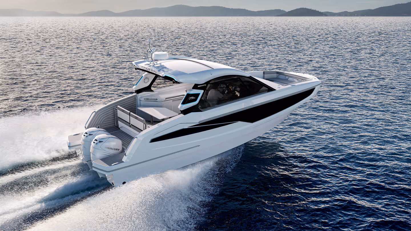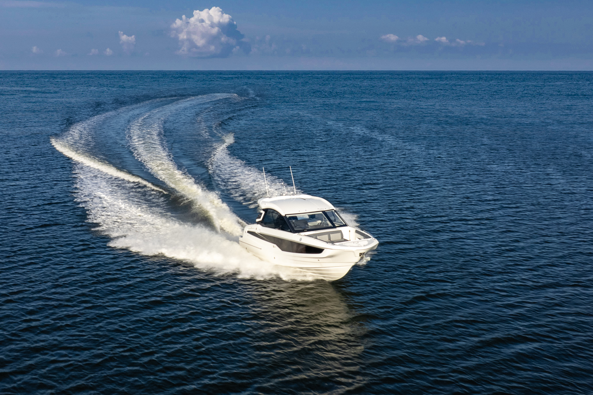 Powered by twin outboards and crowned with a lightweight carbon fiber hardtop, this sleek powerhouse delivers thrilling speed with refined elegance. The expansive bow features a fold-down balcony for effortless connection with the water, while the open-concept layout offers a central lounge with reversible seating – perfect for entertaining or relaxing in style. Enjoy a fully equipped wet galley, extendable SureShade® awning for sun protection, and a state-of-the-art helm with adjustable sport seats, intuitive joystick docking, and DPS digital anchoring. Every detail is engineered for adventure, comfort, and commanding presence on the water.