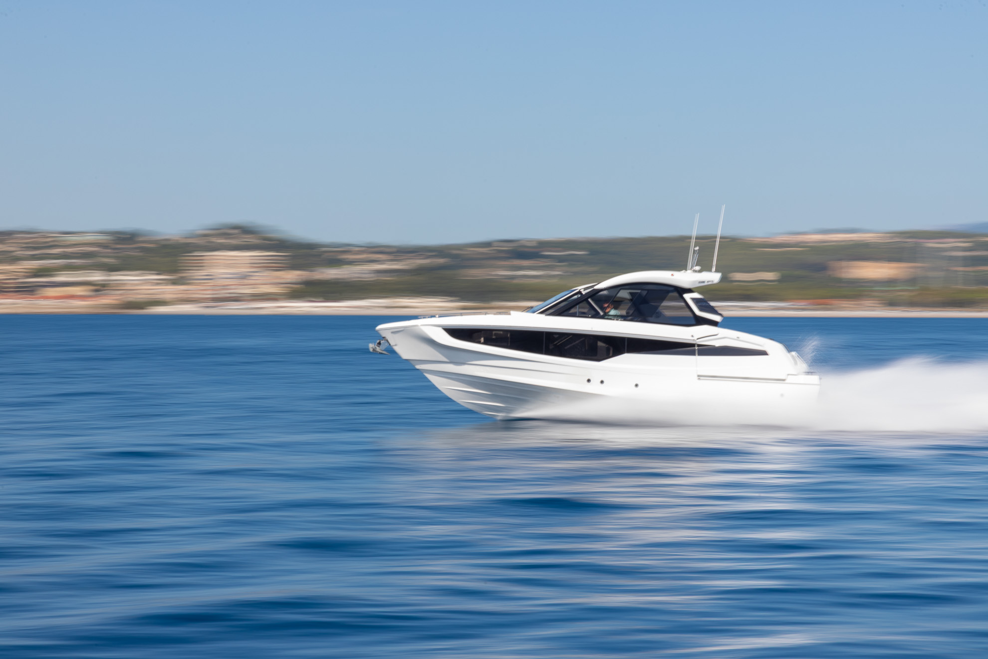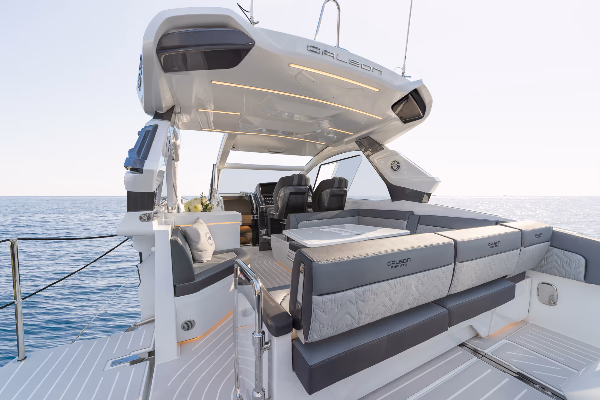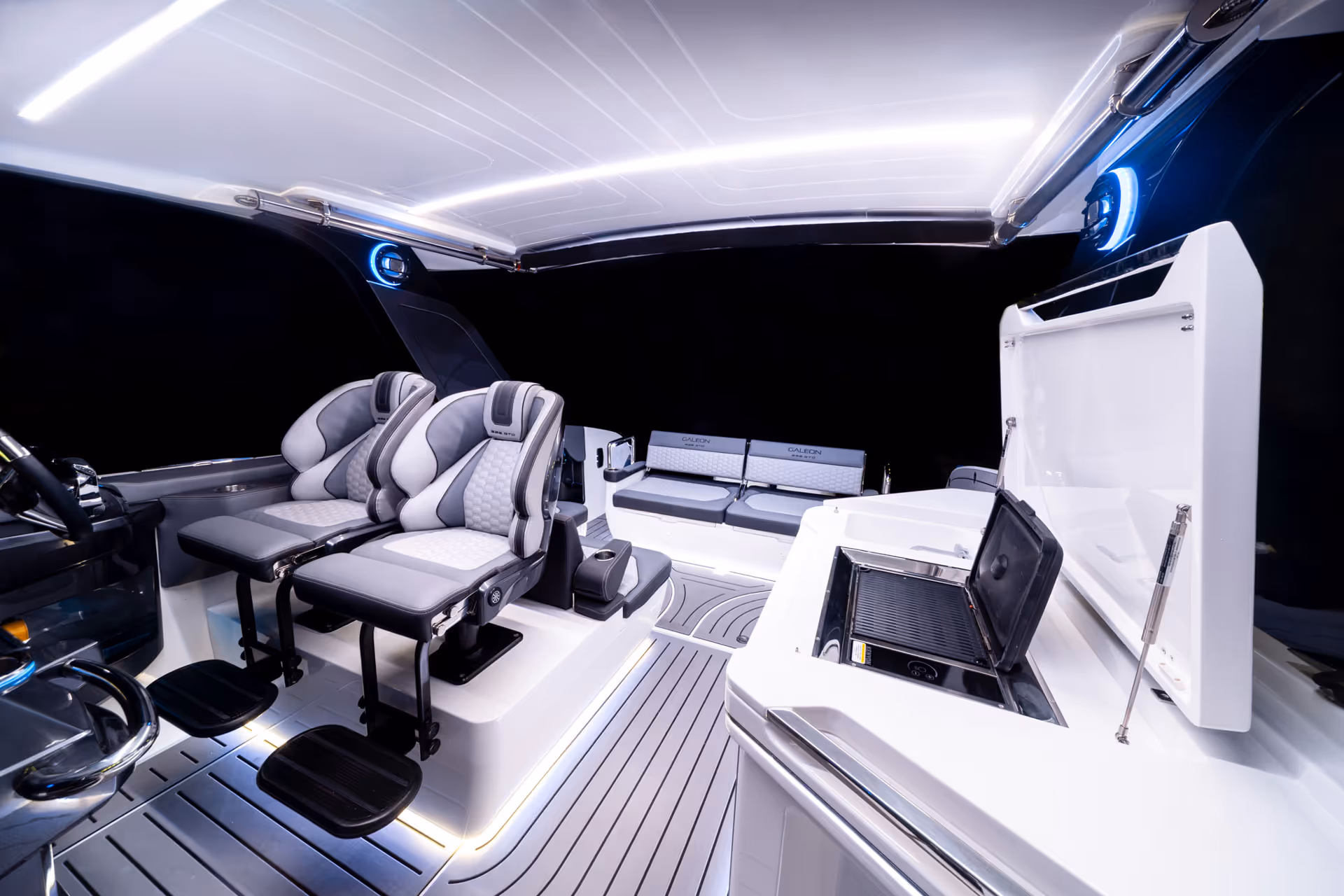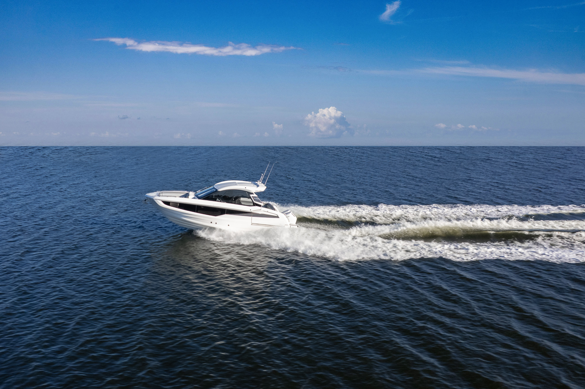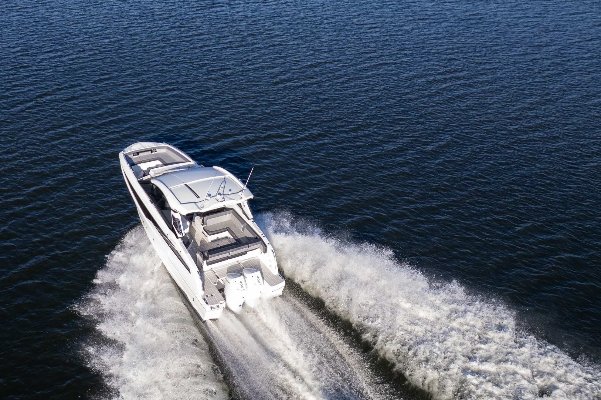 Powered by twin outboards and crowned with a lightweight carbon fiber hardtop, this sleek powerhouse delivers thrilling speed with refined elegance. The expansive bow features a fold-down balcony for effortless connection with the water, while the open-concept layout offers a central lounge with reversible seating – perfect for entertaining or relaxing in style. Enjoy a fully equipped wet galley, extendable SureShade® awning for sun protection, and a state-of-the-art helm with adjustable sport seats, intuitive joystick docking, and DPS digital anchoring. Every detail is engineered for adventure, comfort, and commanding presence on the water.
