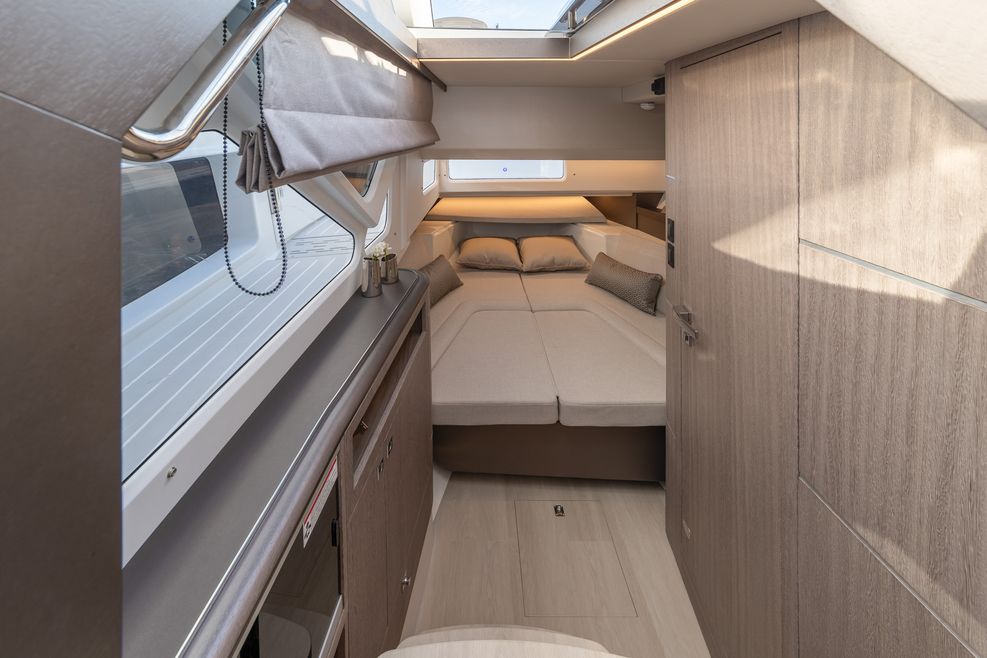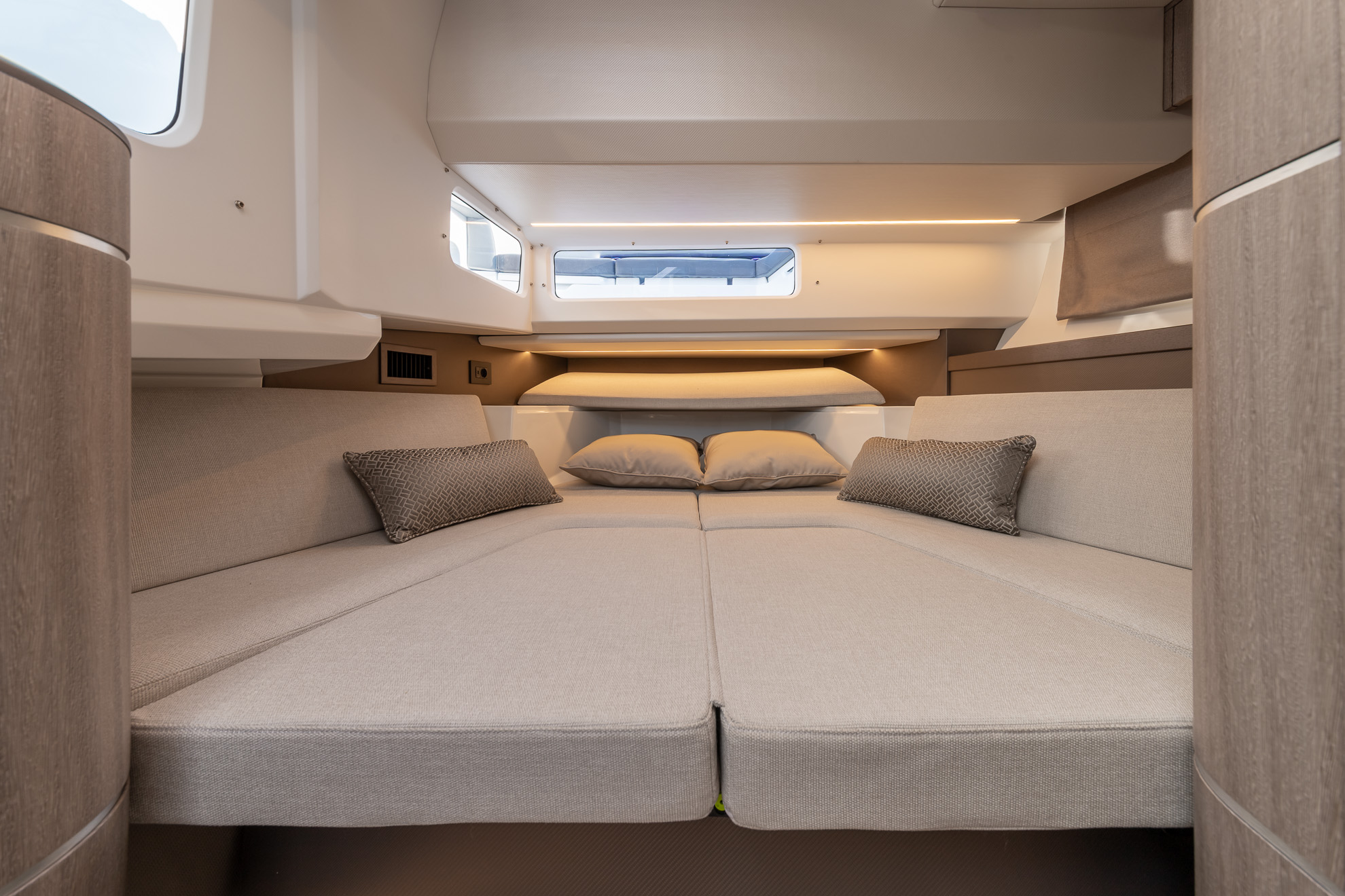 - The versatile salon area easily converts from a social daytime lounge into a cozy sleeping space, offering a practical solution for extended trips. With just a few simple adjustments, the bow dinette transforms into a comfortable double berth—perfect for relaxing after a day on the water.