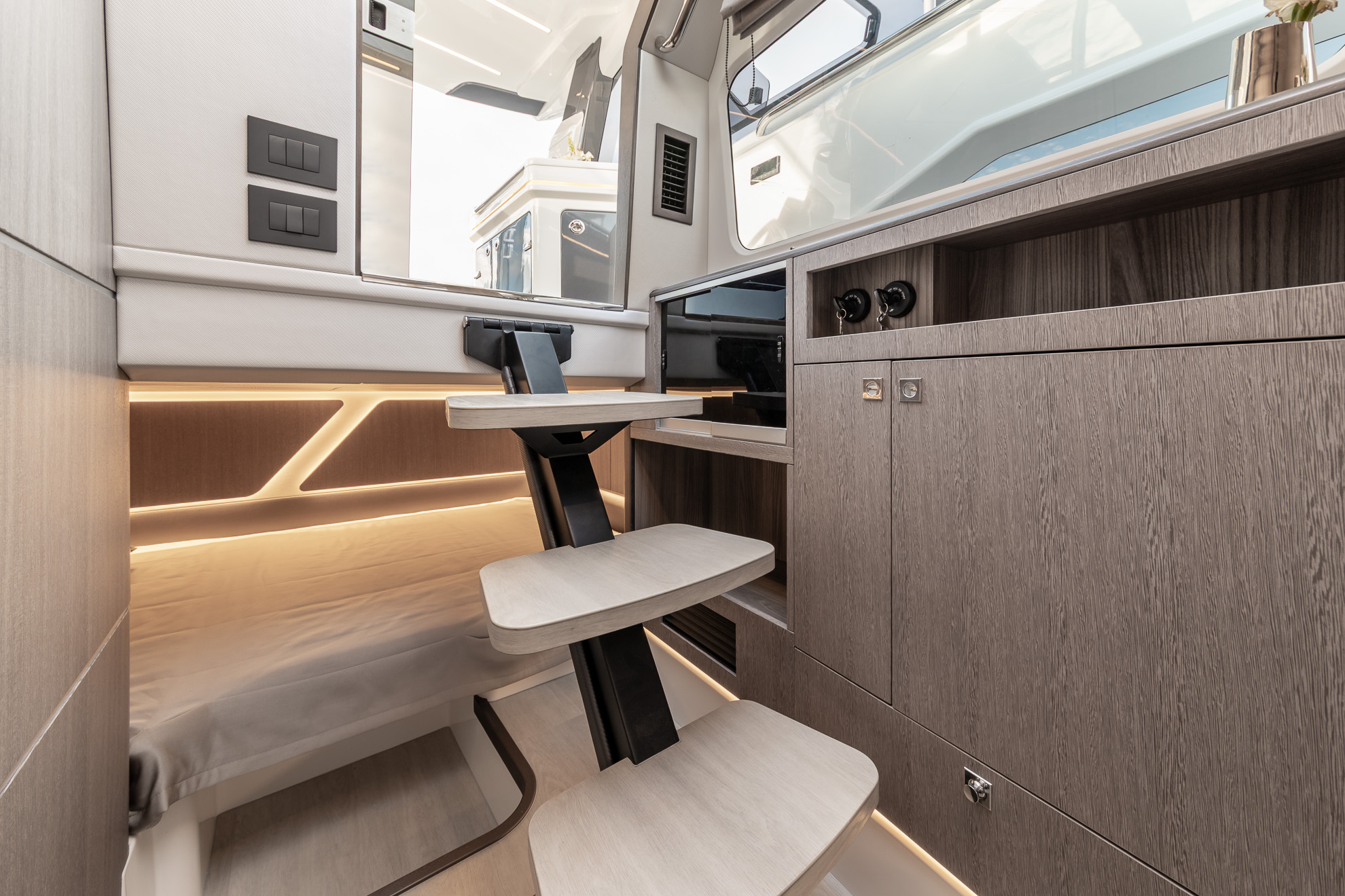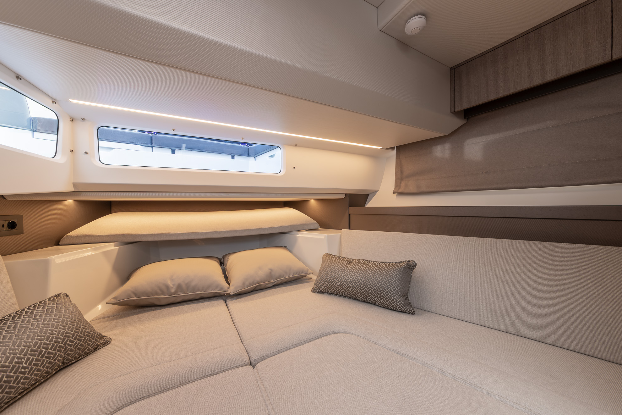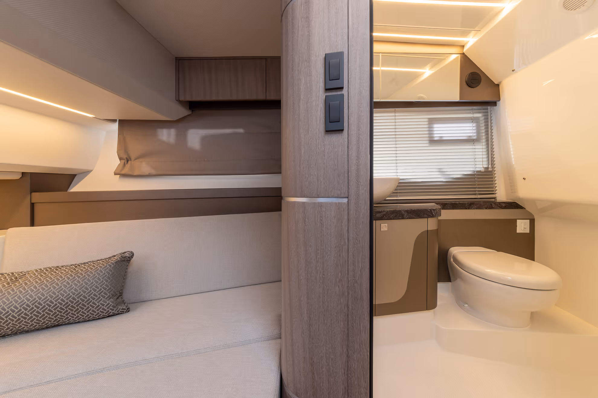 Redefines compact luxury with two separate sleeping areas and a full-featured bathroom complete with head and shower. The forward dinette easily converts into a spacious double berth, while the midship cabin offers a generous second bed—ideal for family getaways or hosting friends. Every inch of the layout is thoughtfully designed, blending smart space solutions with integrated technology to deliver exceptional comfort, style, and flexibility on the water.