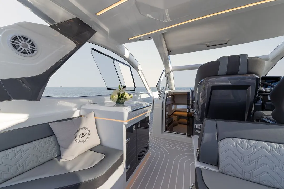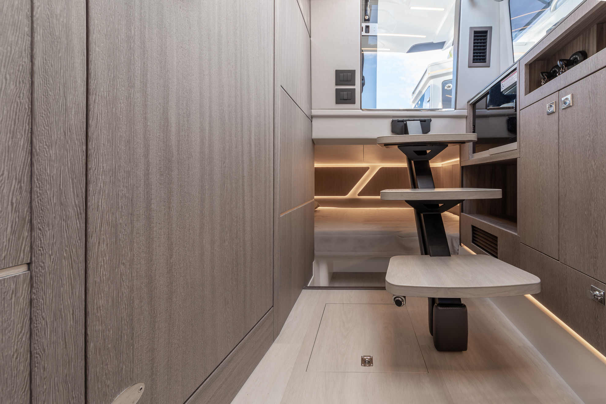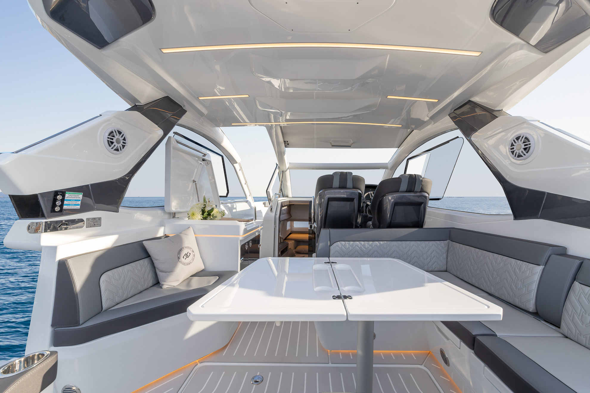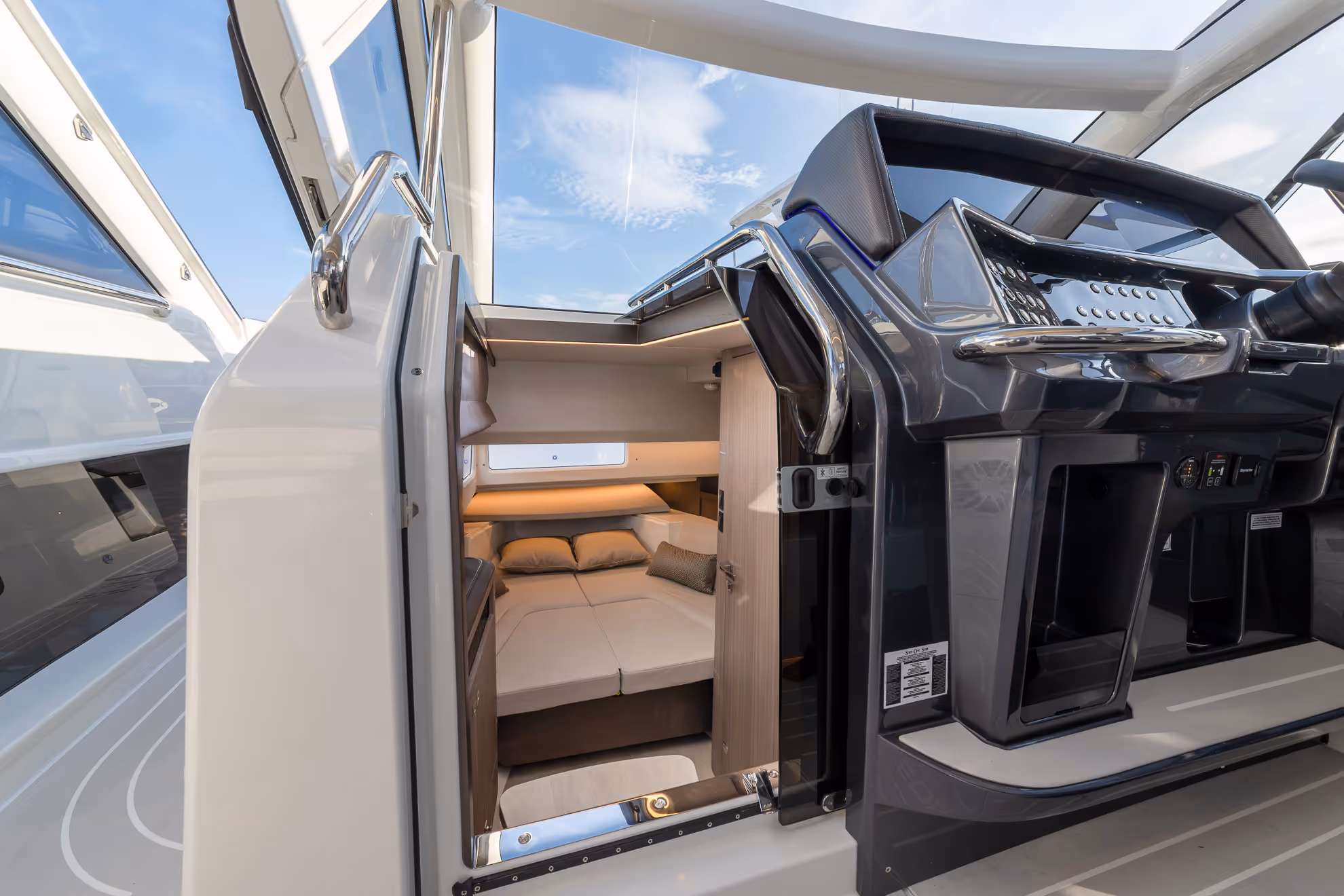 Redefines compact luxury with two separate sleeping areas and a full-featured bathroom complete with head and shower. The forward dinette easily converts into a spacious double berth, while the midship cabin offers a generous second bed—ideal for family getaways or hosting friends. Every inch of the layout is thoughtfully designed, blending smart space solutions with integrated technology to deliver exceptional comfort, style, and flexibility on the water.