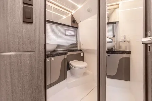 - Thoughtfully arranged, it features a toilet, sink, and full shower, providing everyday comfort while on the water. A window adds natural light and ventilation, making the space feel more open and inviting—proving that even a small yacht can offer big convenience.