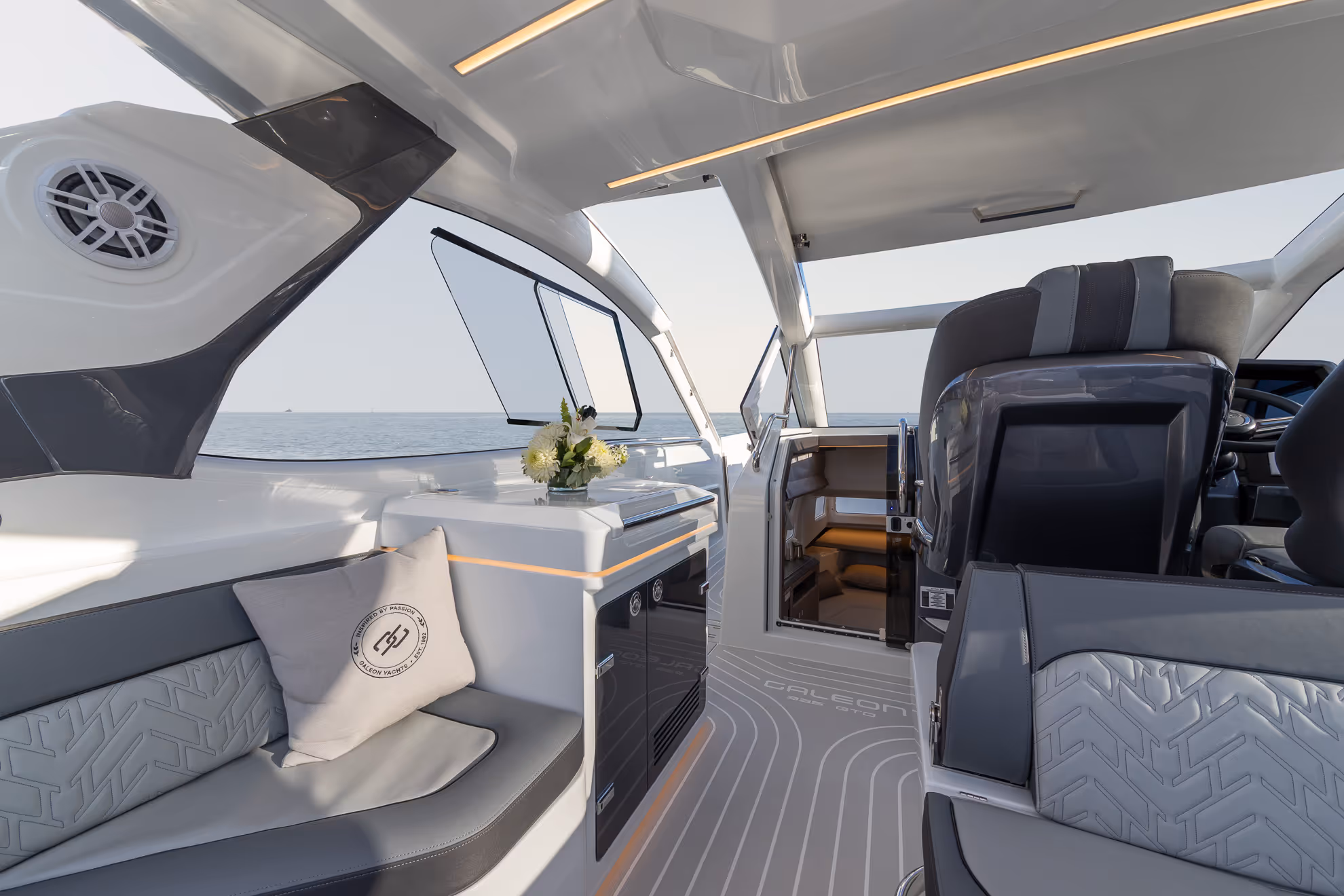 - The compact yet highly functional helm station features an adjustable captain’s seat, steering wheel, and essential instruments like GPS and engine controls, all positioned for optimal visibility to ensure easy navigation and confident maneuvering of the yacht.