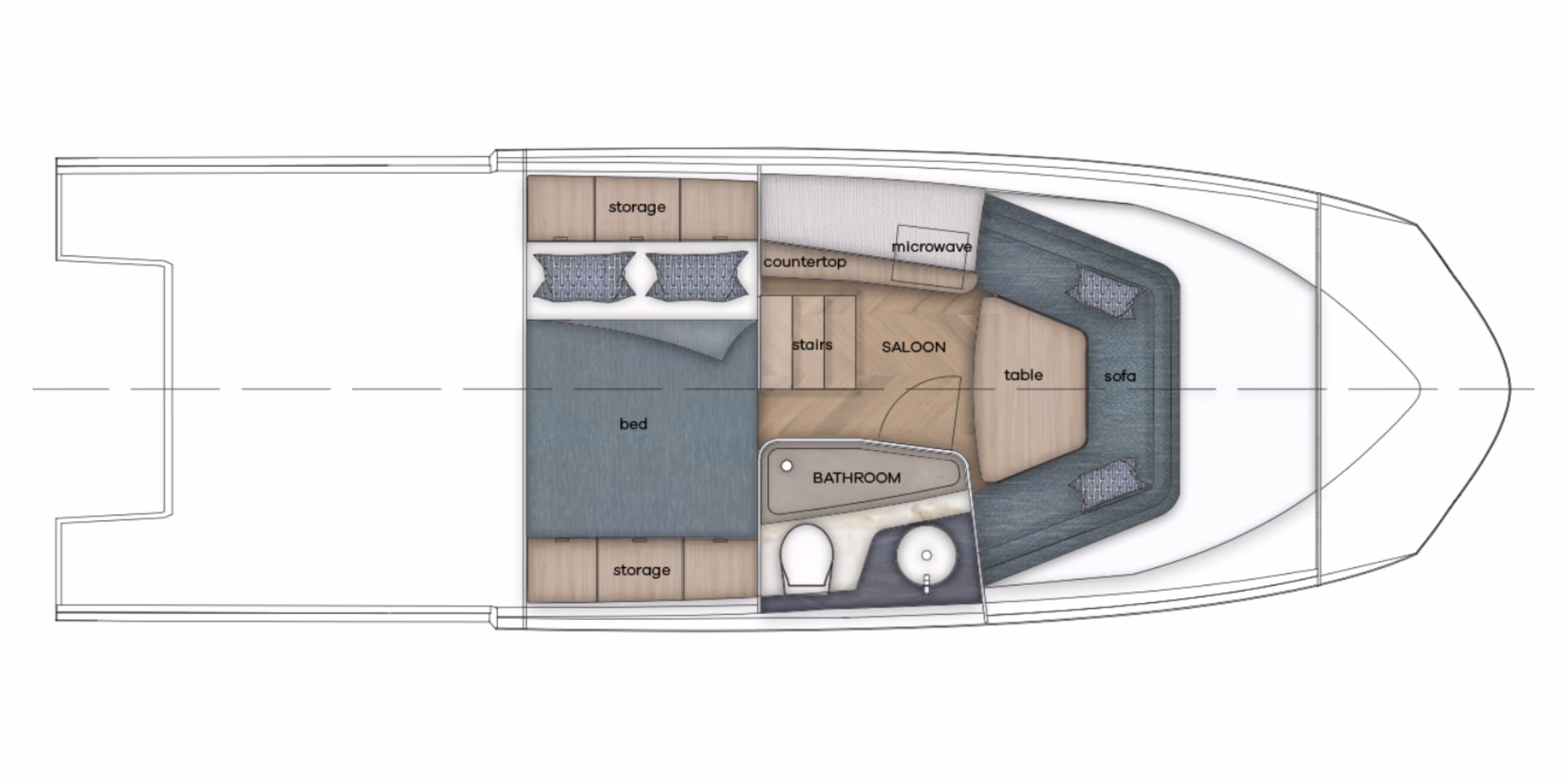 - Asymmetrical design with a wide bow and central console creates a unique and efficient layout, maximizing usable space on board. The wide bow enhances stability and offers ample seating or lounging areas, while the central console provides easy access and optimal visibility for the helm, improving both comfort and safety during navigation.