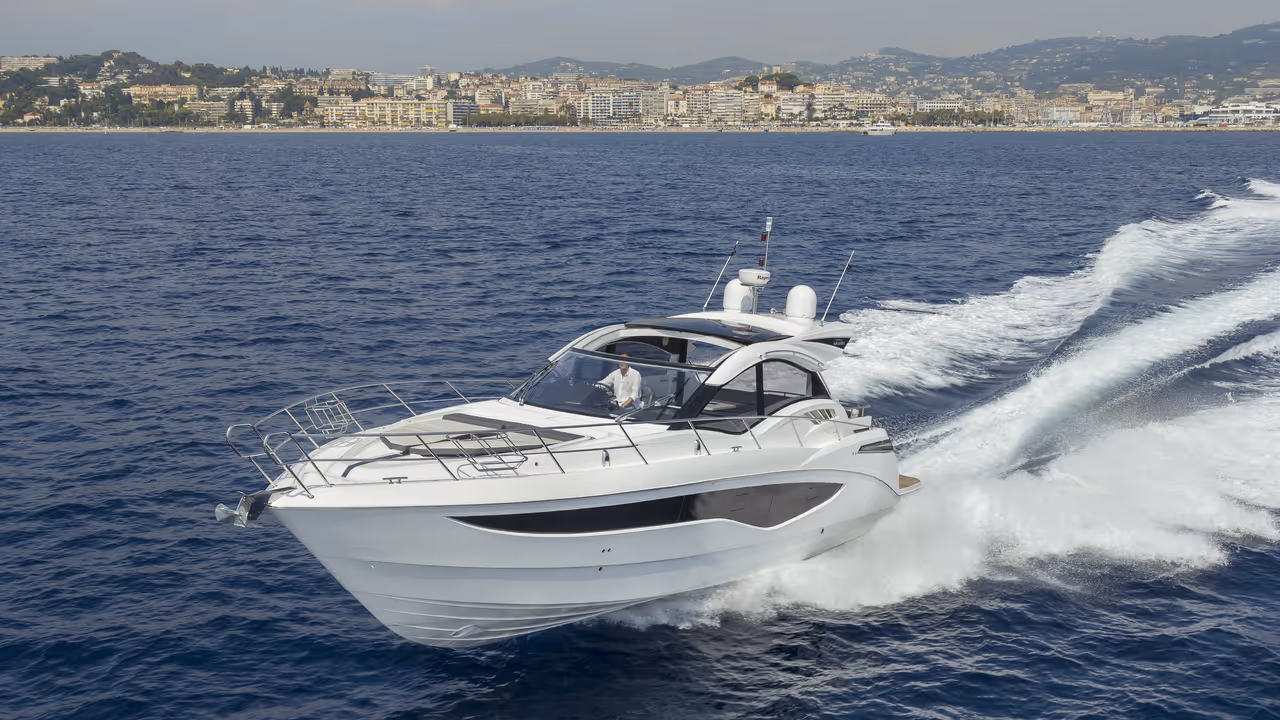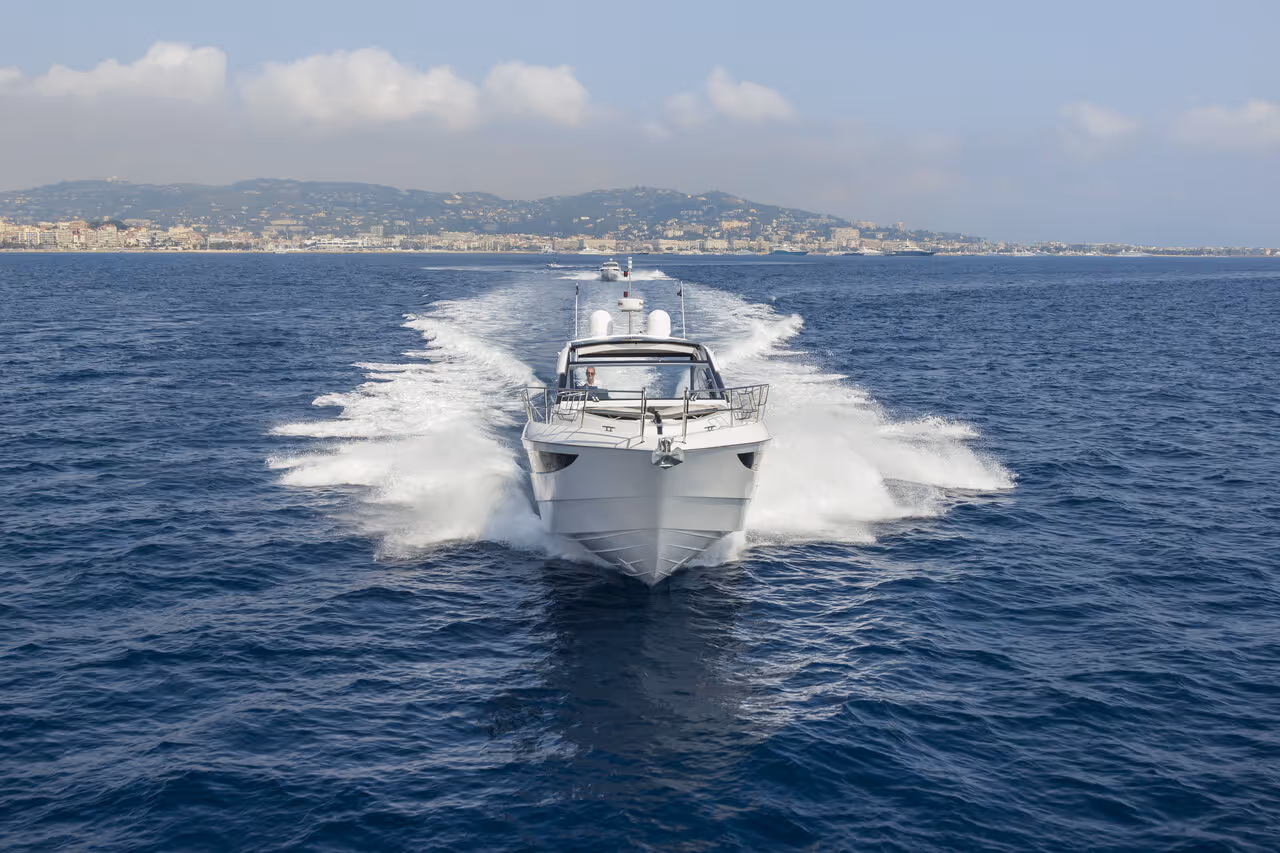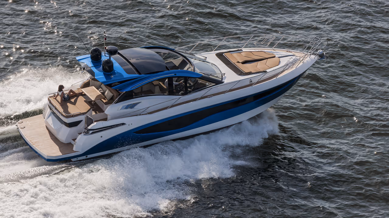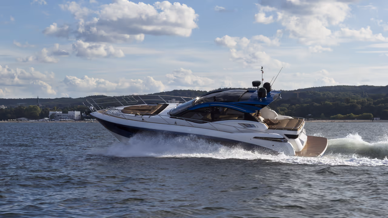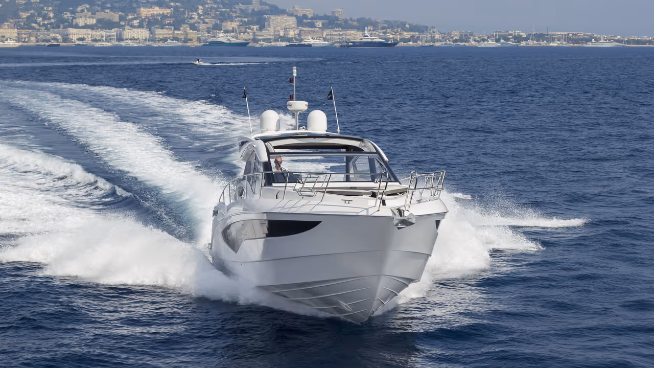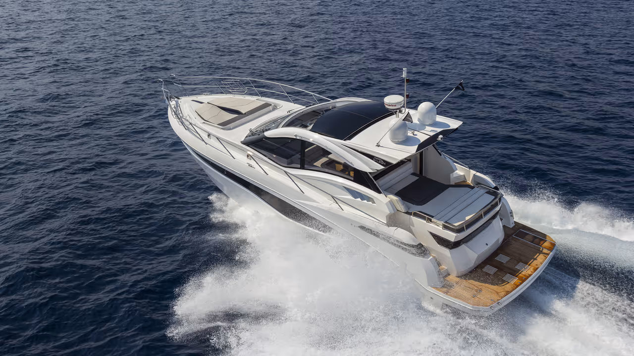- A sleek hull line and sporty superstructure give the yacht a bold, modern look that turns heads in any marina.