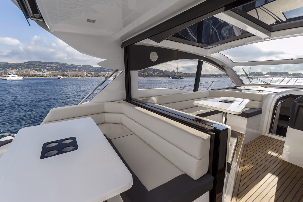 - Large sliding doors seamlessly connect the salon with the cockpit, creating one unified, open space — perfect for relaxing or entertaining.