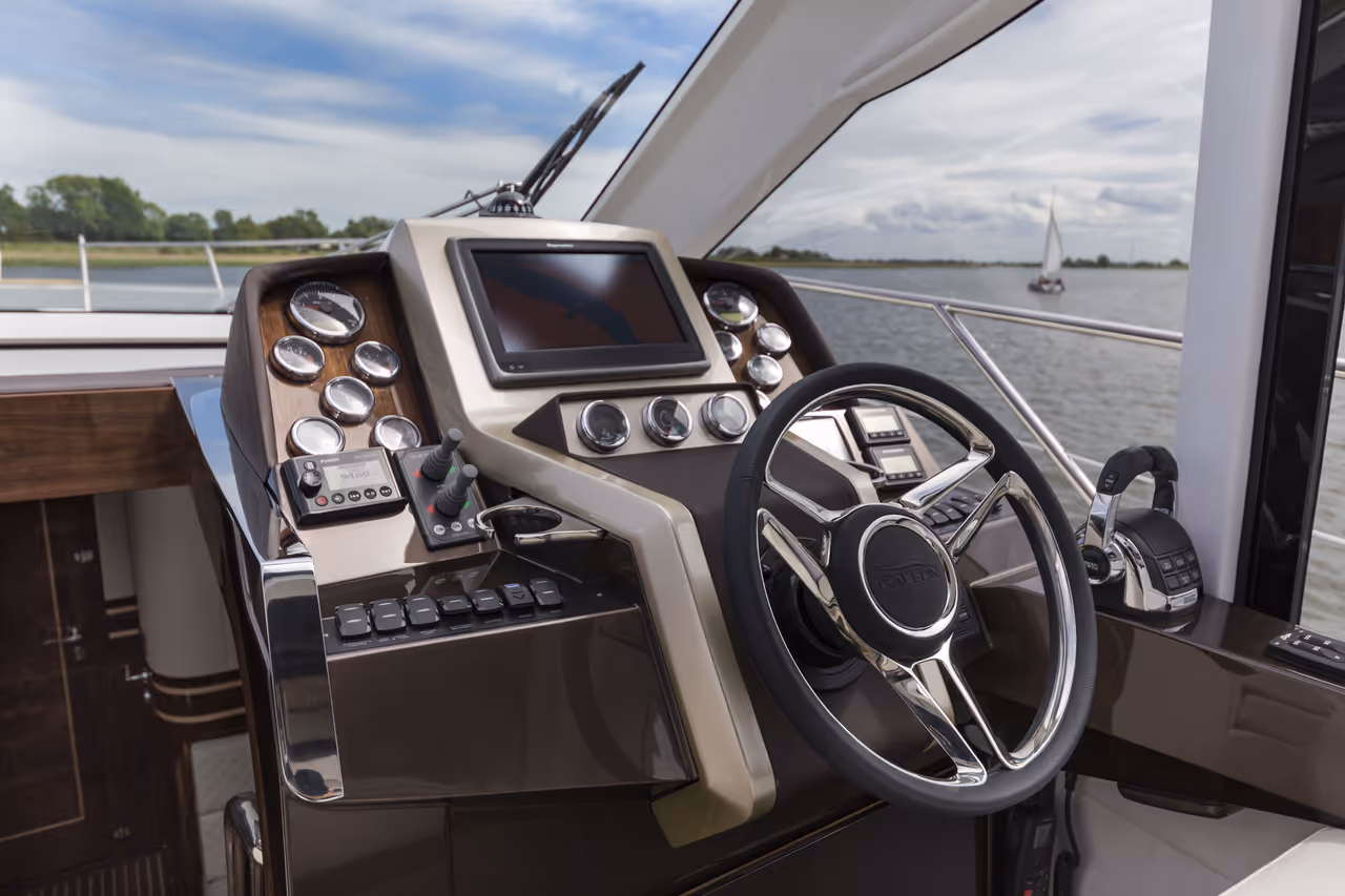 The 485 HTS delivers the flybridge feeling without the height. A retractable sunroof above the helm lets in light and fresh sea breeze at the touch of a button. The saloon opens fully to the cockpit through a sliding glass panel, creating a seamless indoor-outdoor space.