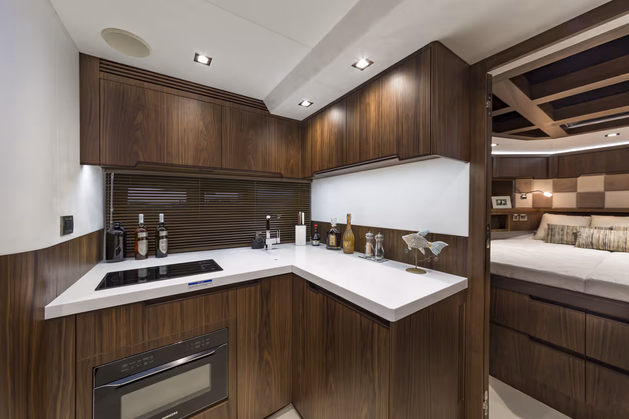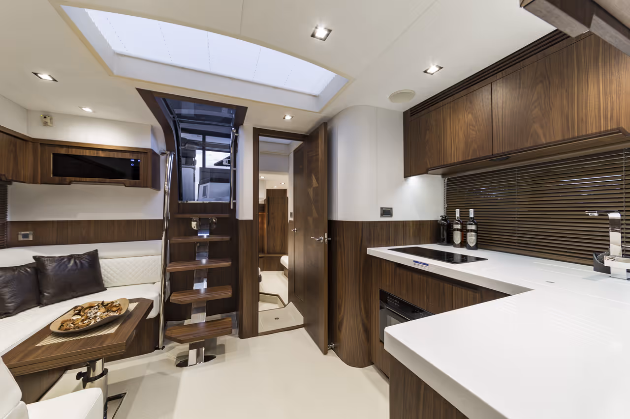 The galley is fully equipped for extended cruising, while the main lounge area invites guests to relax, dine, or socialize in elegant surroundings. Premium materials, ambient lighting, and clever use of space make every detail feel purposeful and beautifully executed.