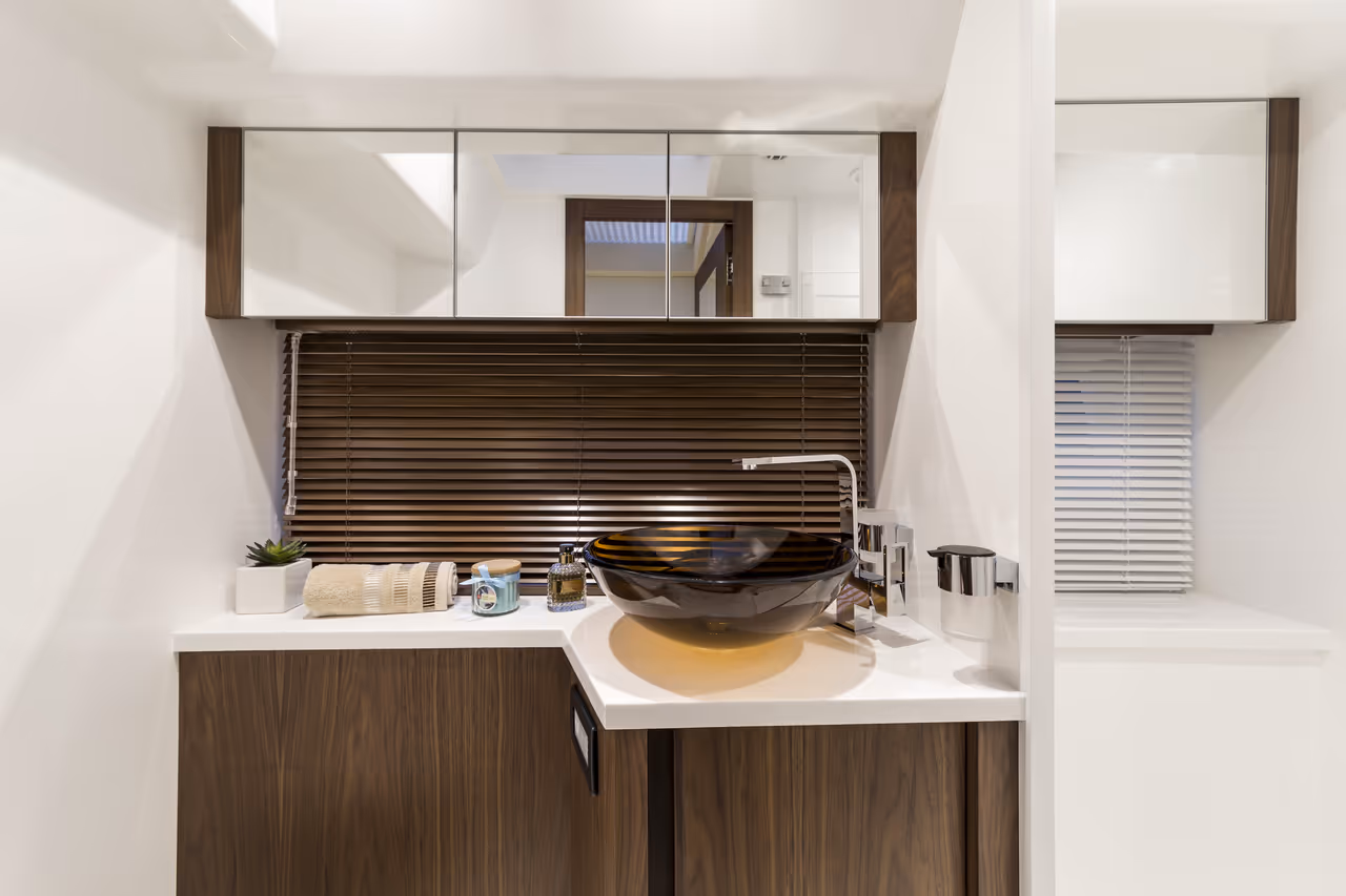 Step below deck and discover a refined, light-filled interior designed for longer journeys and elevated onboard living. The full-beam master cabin amidships offers a luxurious retreat, complete with a private en-suite bathroom, generous headroom, and ample storage.