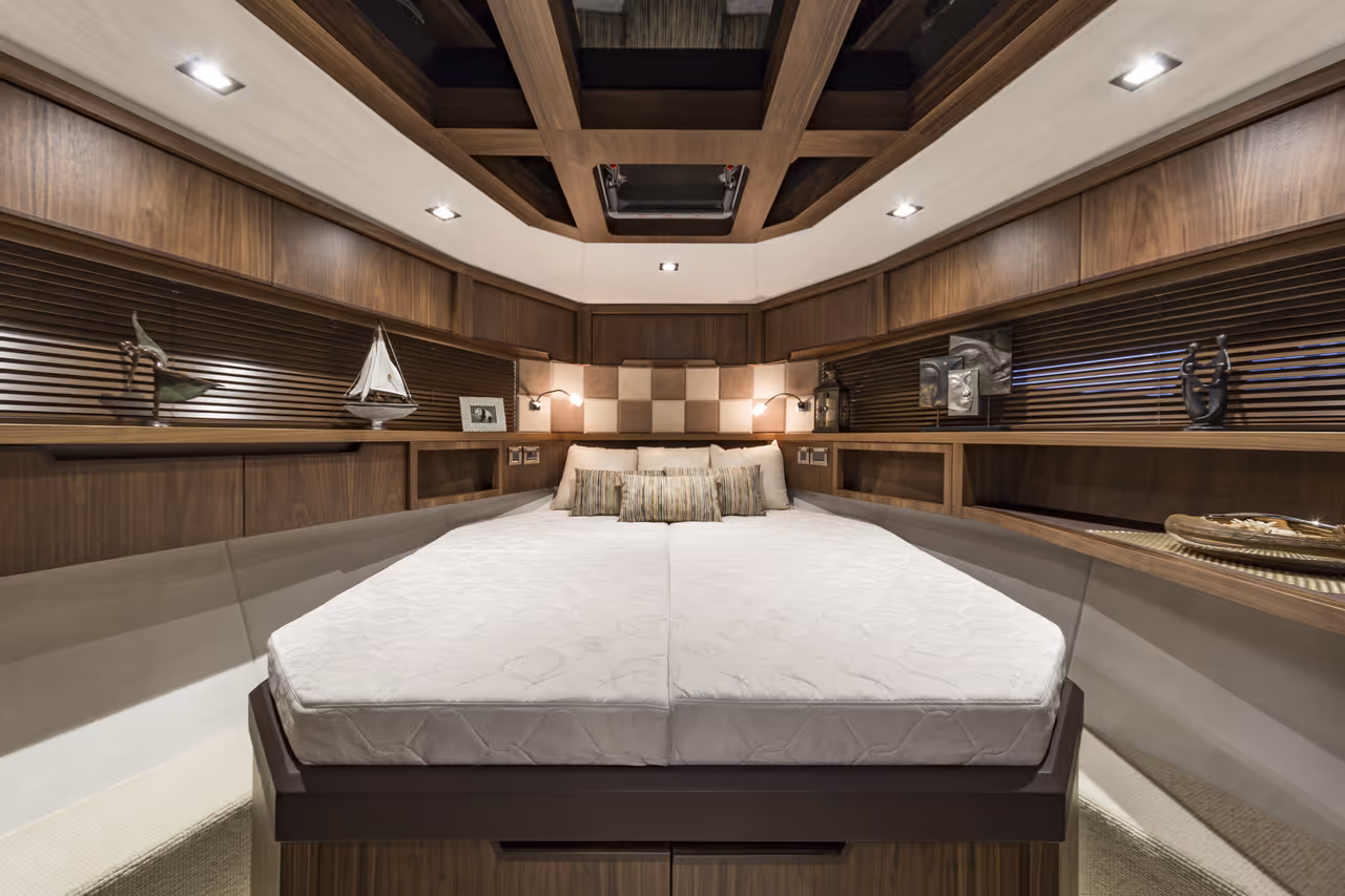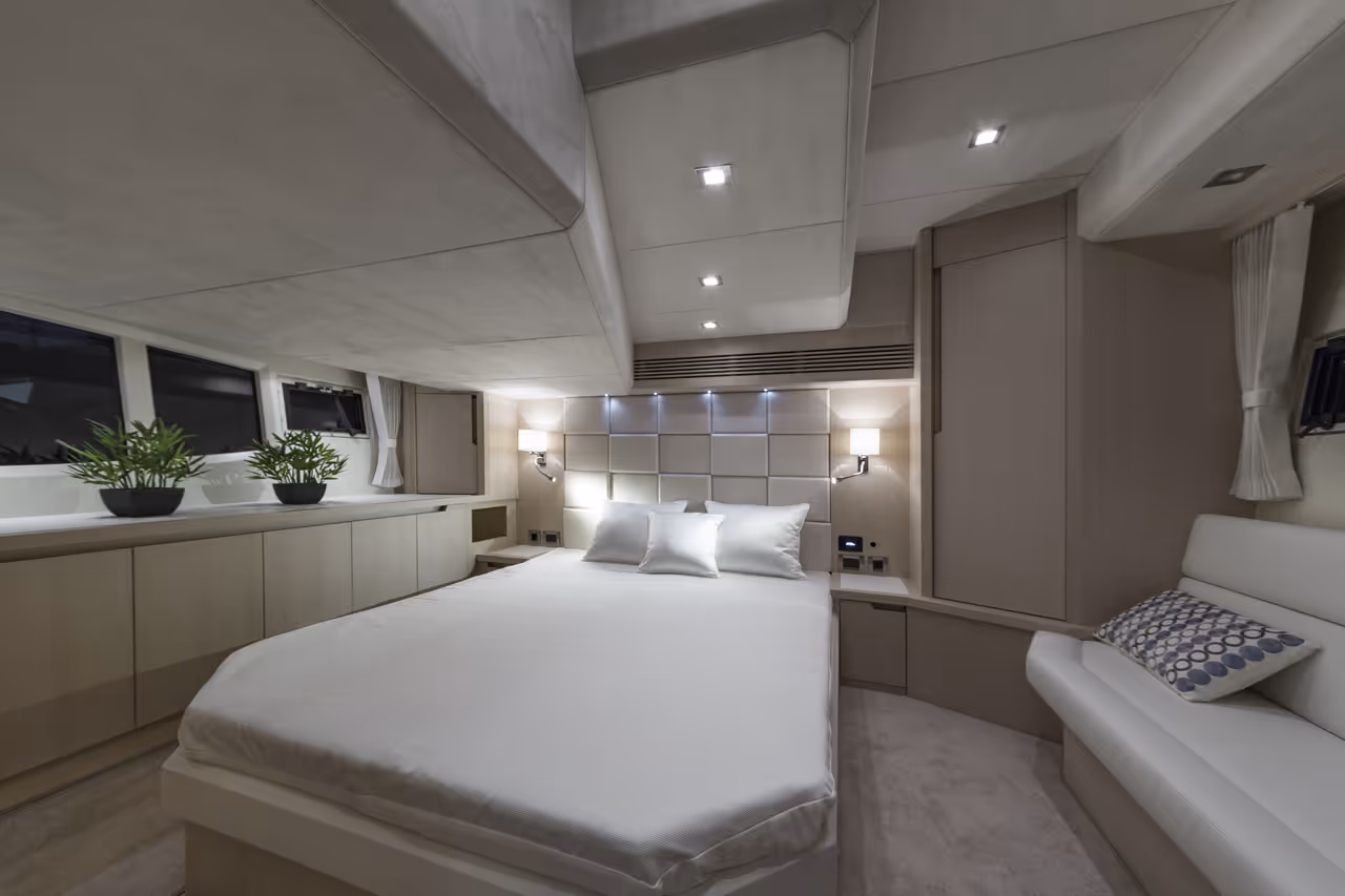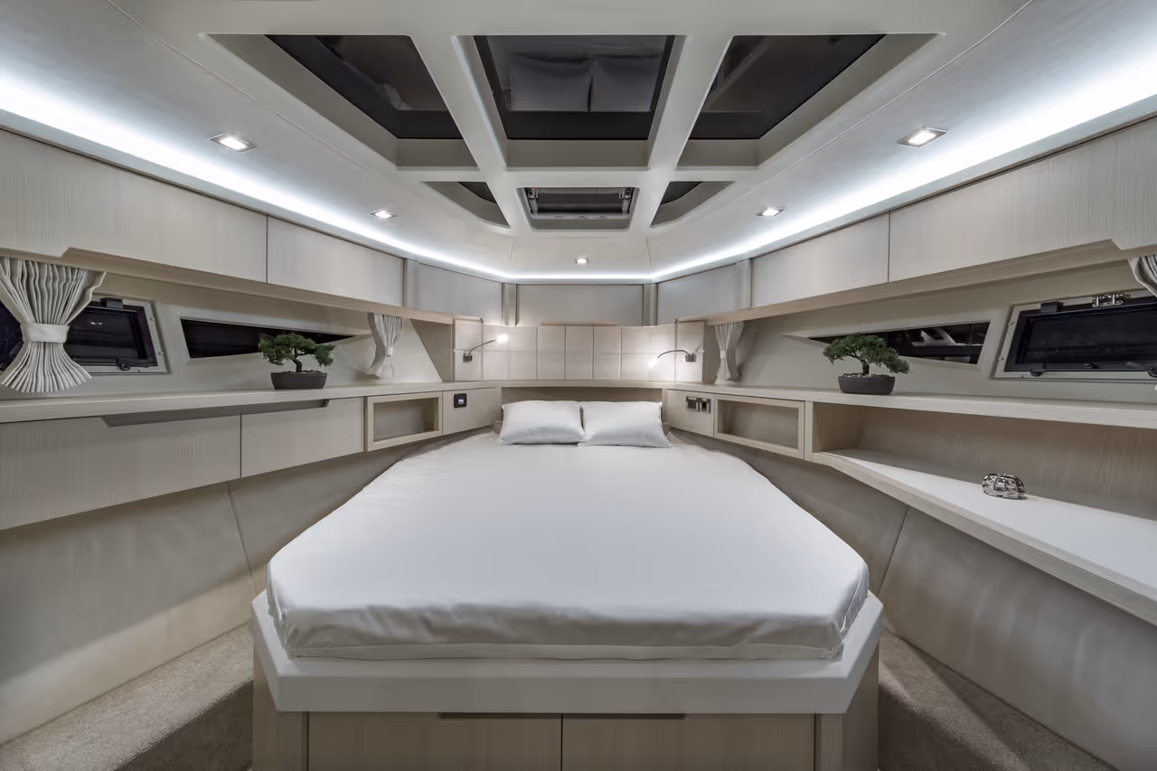 At the bow, the VIP guest cabin features a smart layout with direct access to the day head, ensuring comfort and privacy for all on board.