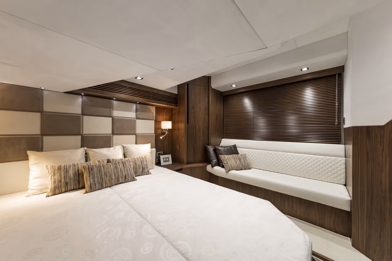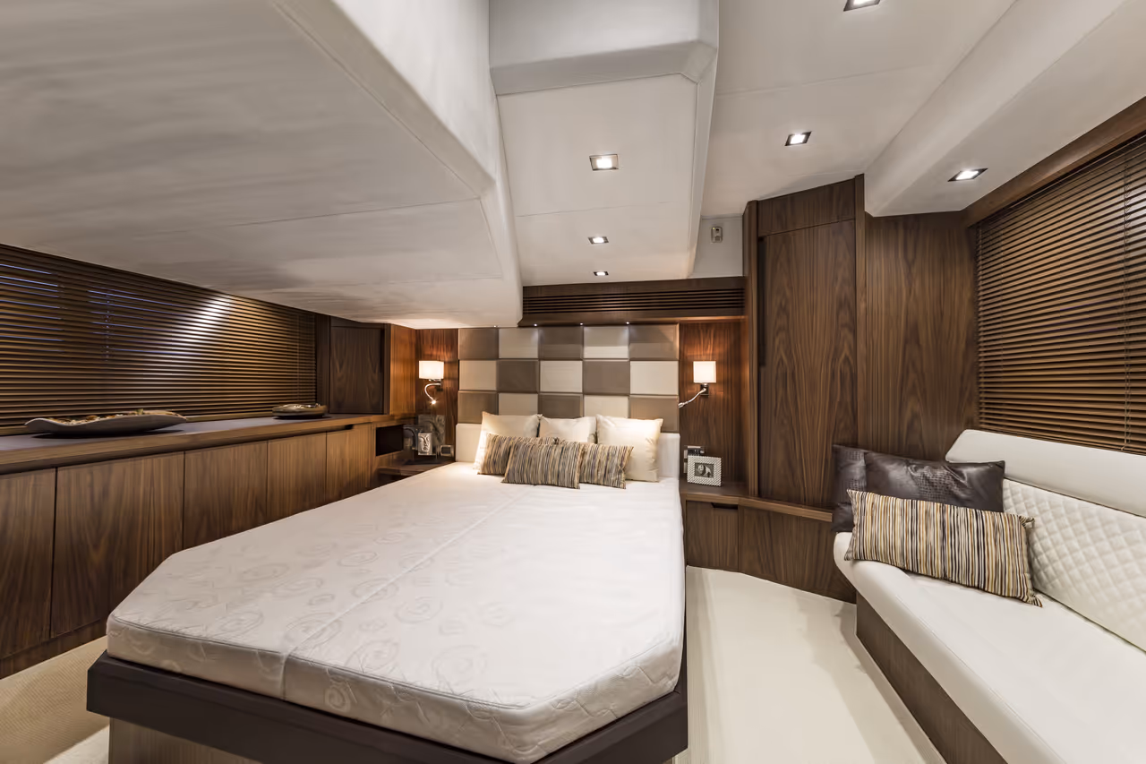 - Positioned forward with convertible V-berth and direct access to the day head — perfect for guests or family.