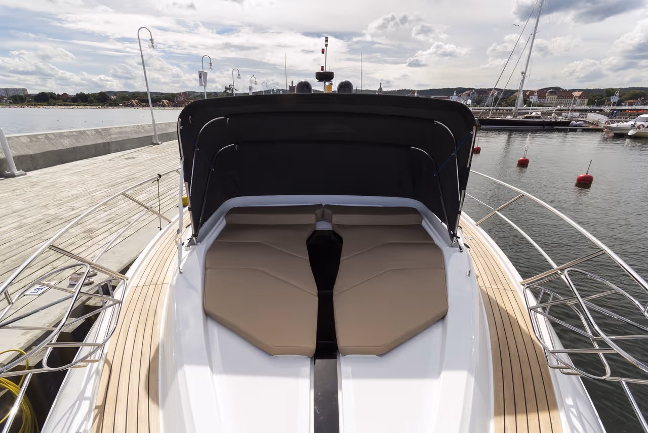 - Forward sunpad with adjustable backrests offers a private space for sunbathing or enjoying panoramic views underway — and can be conveniently covered or stowed away when the weather turns.