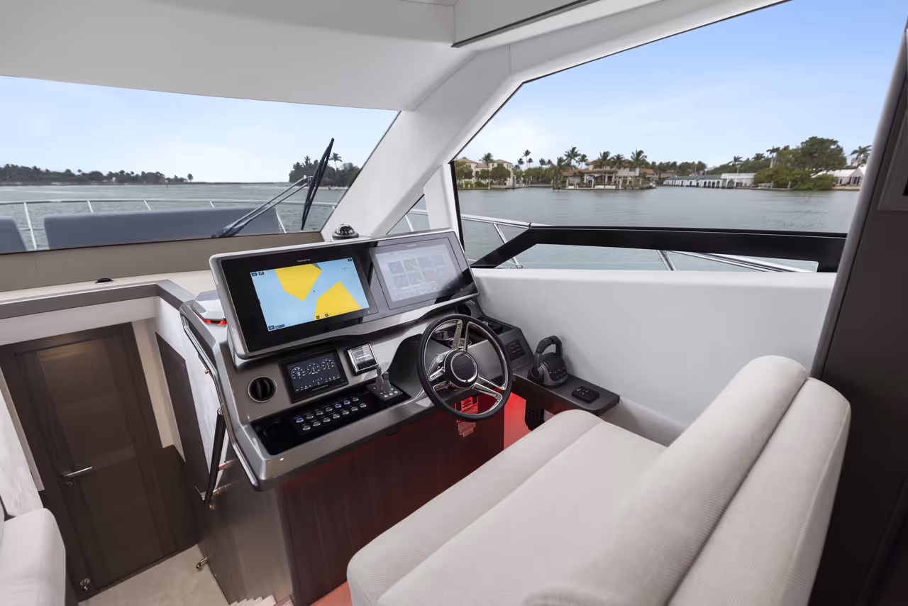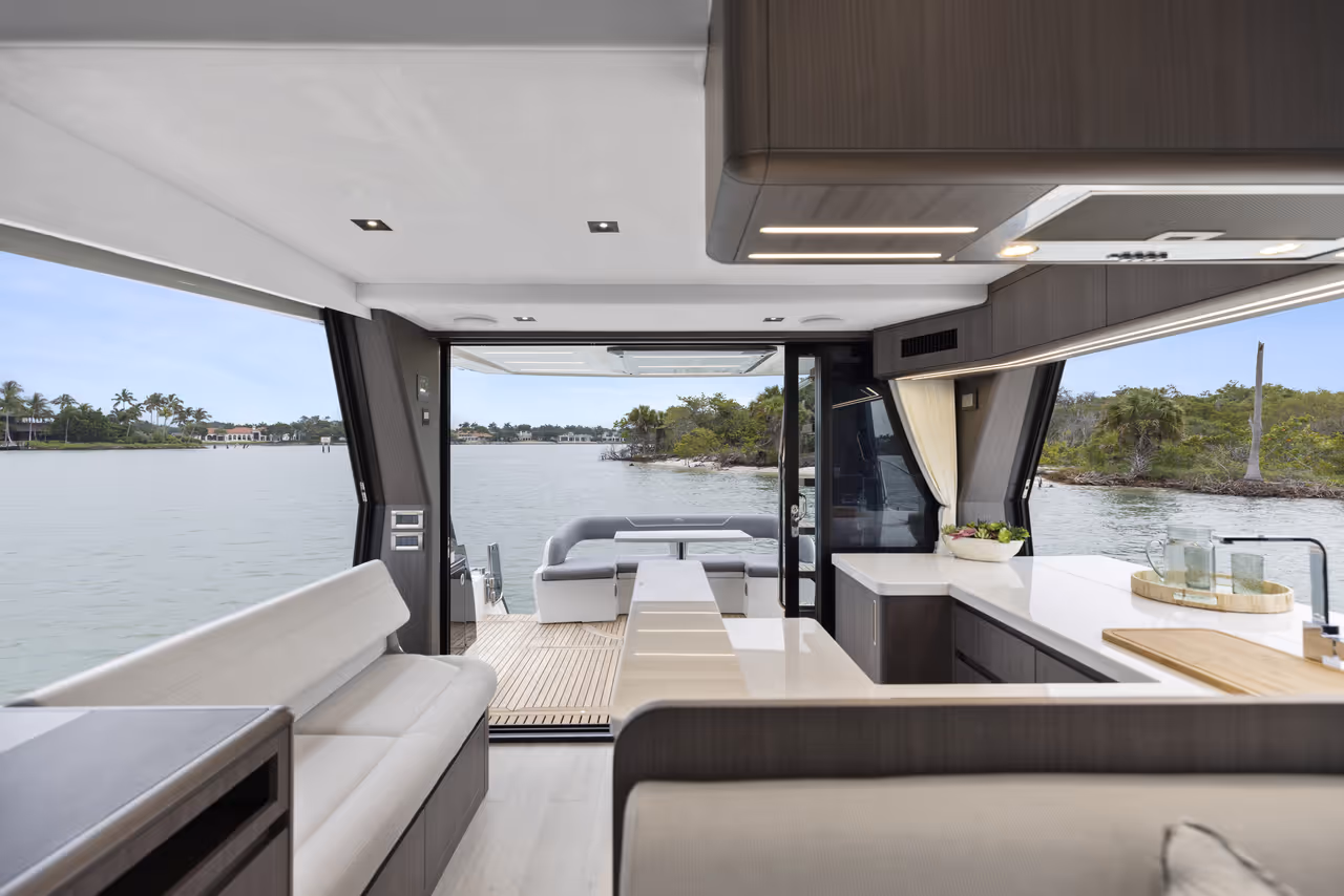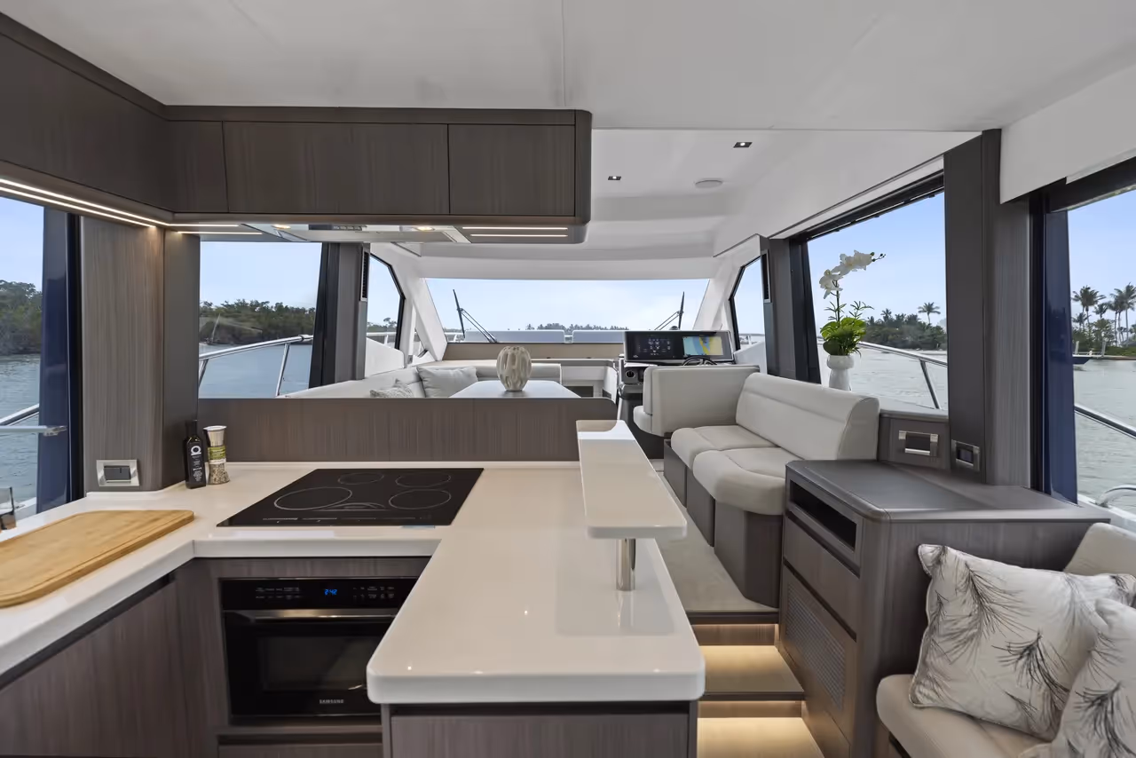 - Spacious salon with panoramic windows, direct cockpit access, and a seamless connection between the galley, dining, and lounging areas.