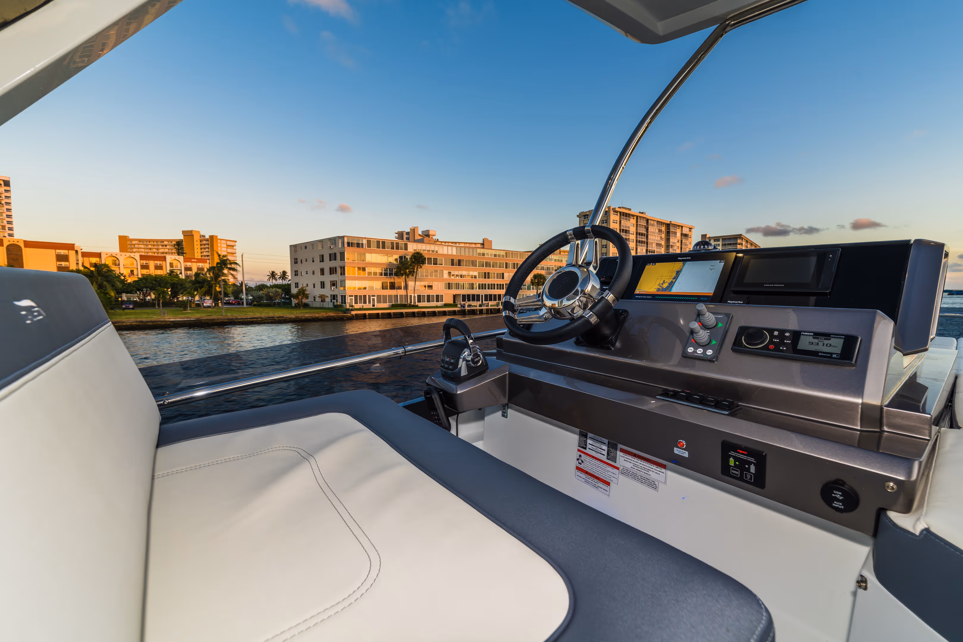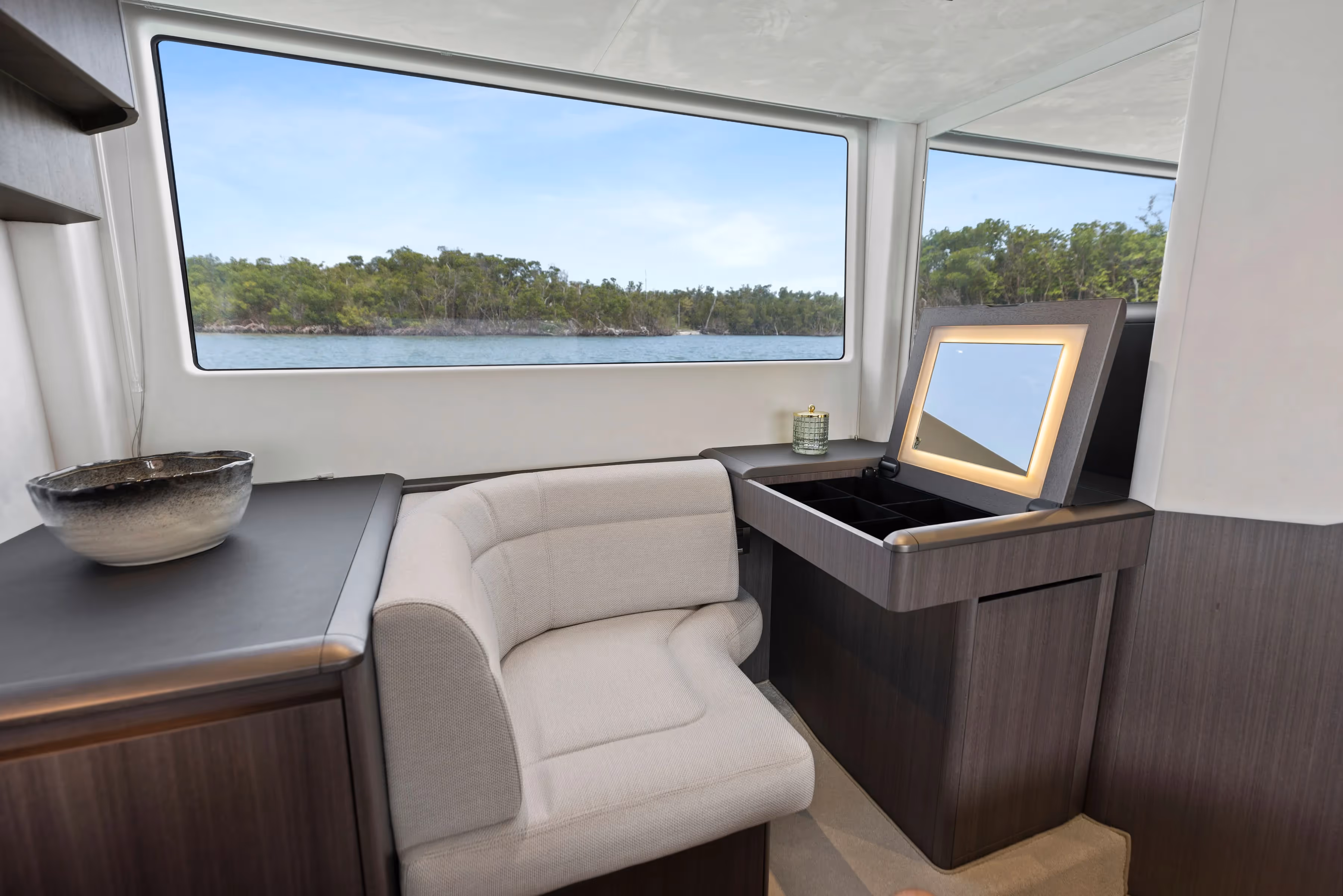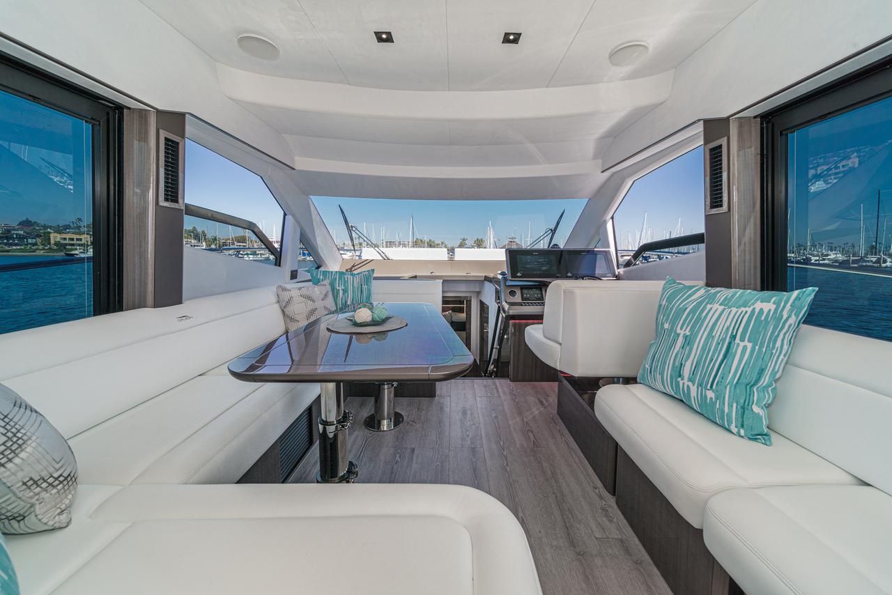 - Spacious salon with panoramic windows, direct cockpit access, and a seamless connection between the galley, dining, and lounging areas.