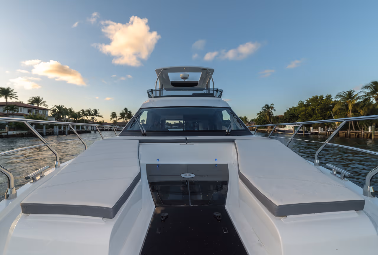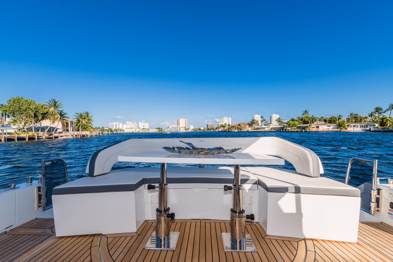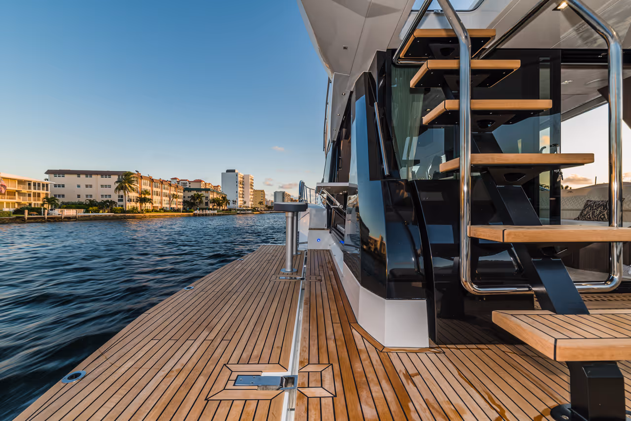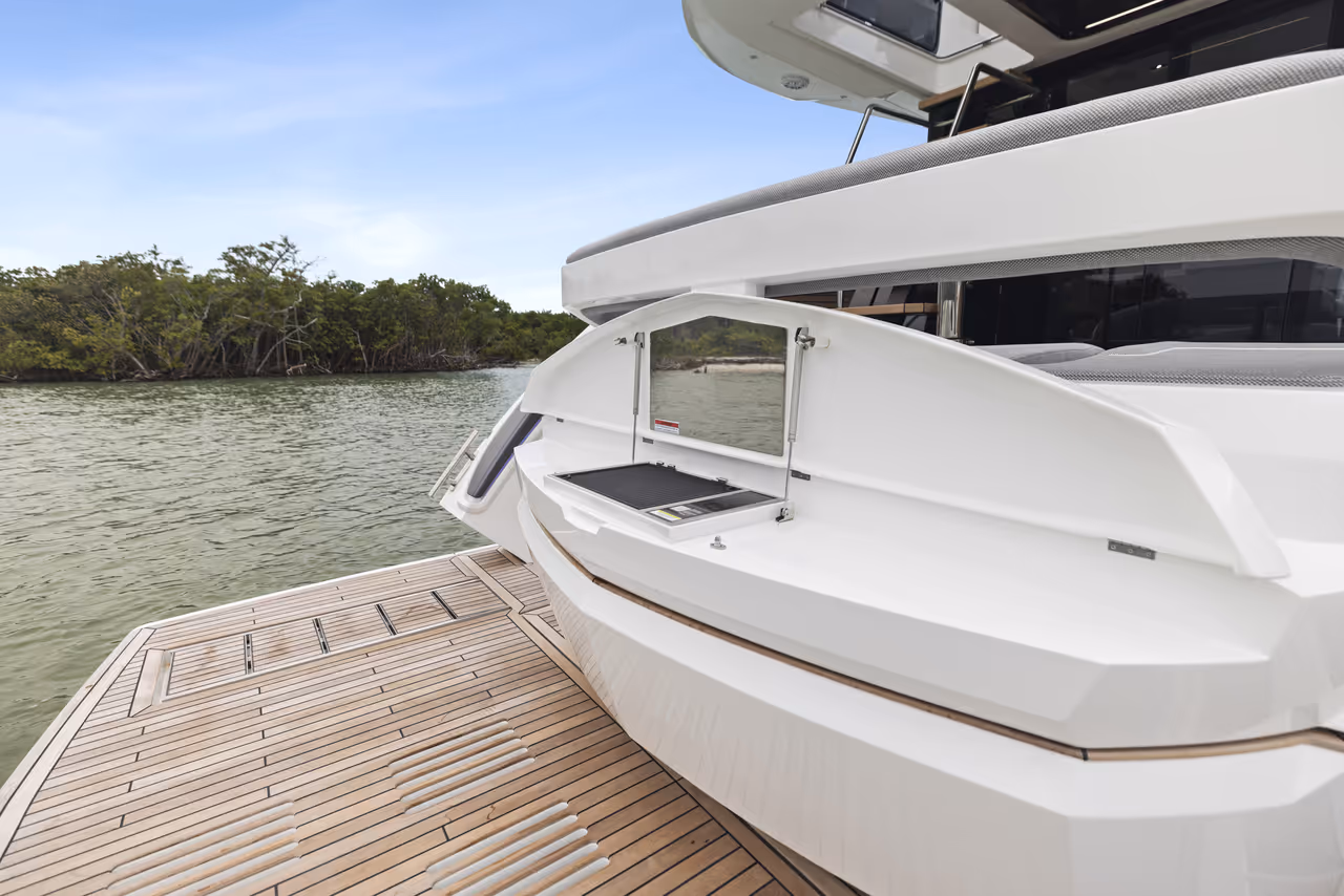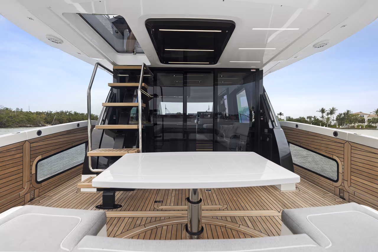 Standout features include the patented Beach Mode with fold-down balconies that dramatically expand the cockpit space, creating an unmatched connection to the sea. The rotating aft lounge adds flexibility for entertaining, dining, or sunbathing – facing the cockpit, the water, or even turned sideways.