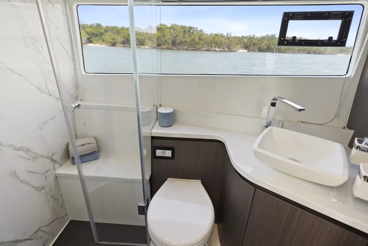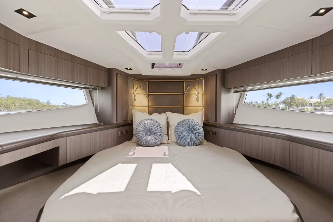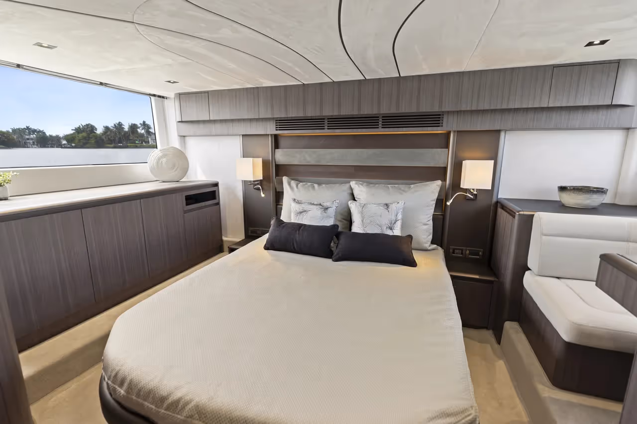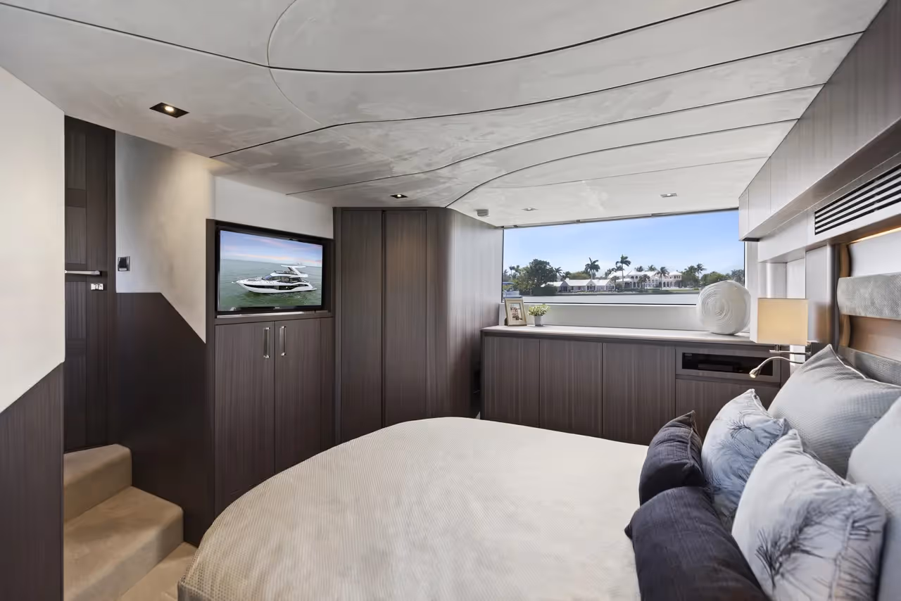 - Luxurious owner’s stateroom with private bathroom, large hull windows, and refined finishes for maximum comfort and privacy.