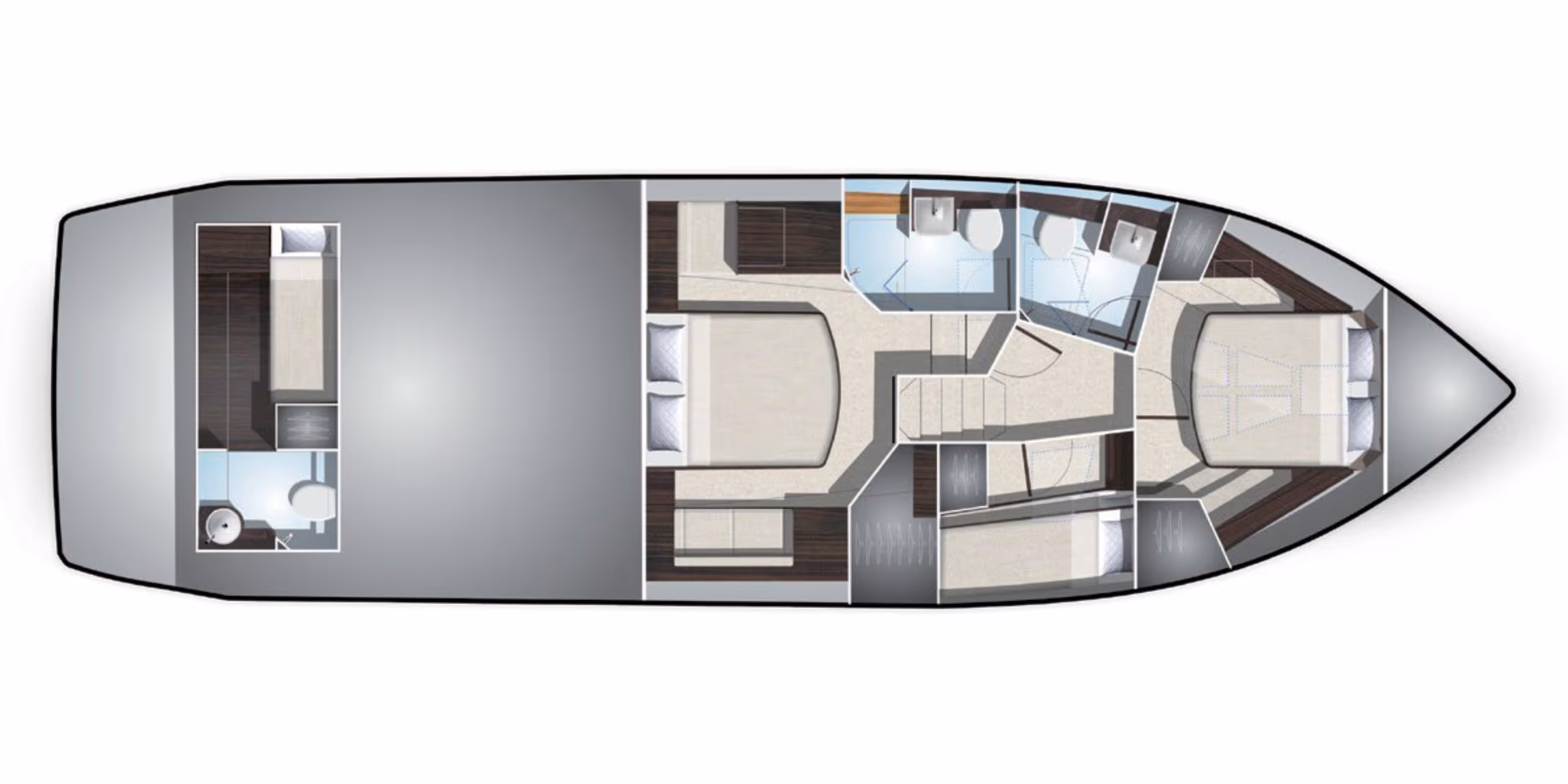 Designed with flexibility and comfort in mind, the Galeon 500 FLY offers a smart, spacious layout that adapts to every lifestyle on the water. From the innovative open-plan main deck to the well-appointed three-cabin lower deck, every area has been carefully planned to maximize usability, natural light,and privacy. Multiple configuration options and interior finish choices allow each owner to create a yacht that truly reflects their needs and taste.