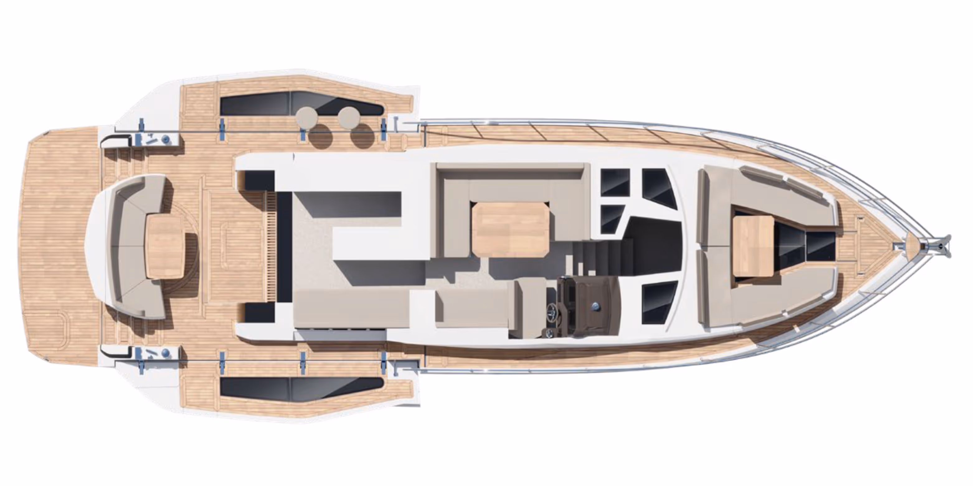 - A versatile foredeck that adapts to sunbathing, dining, or lounging — all at the touch of a button.