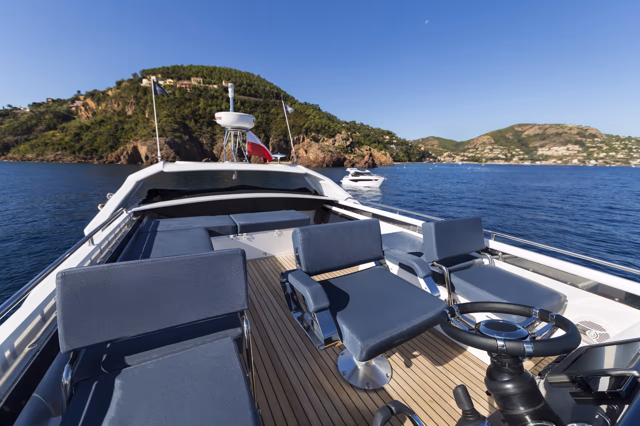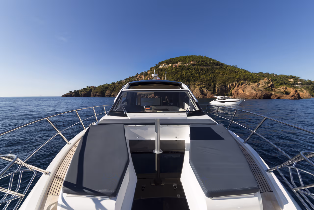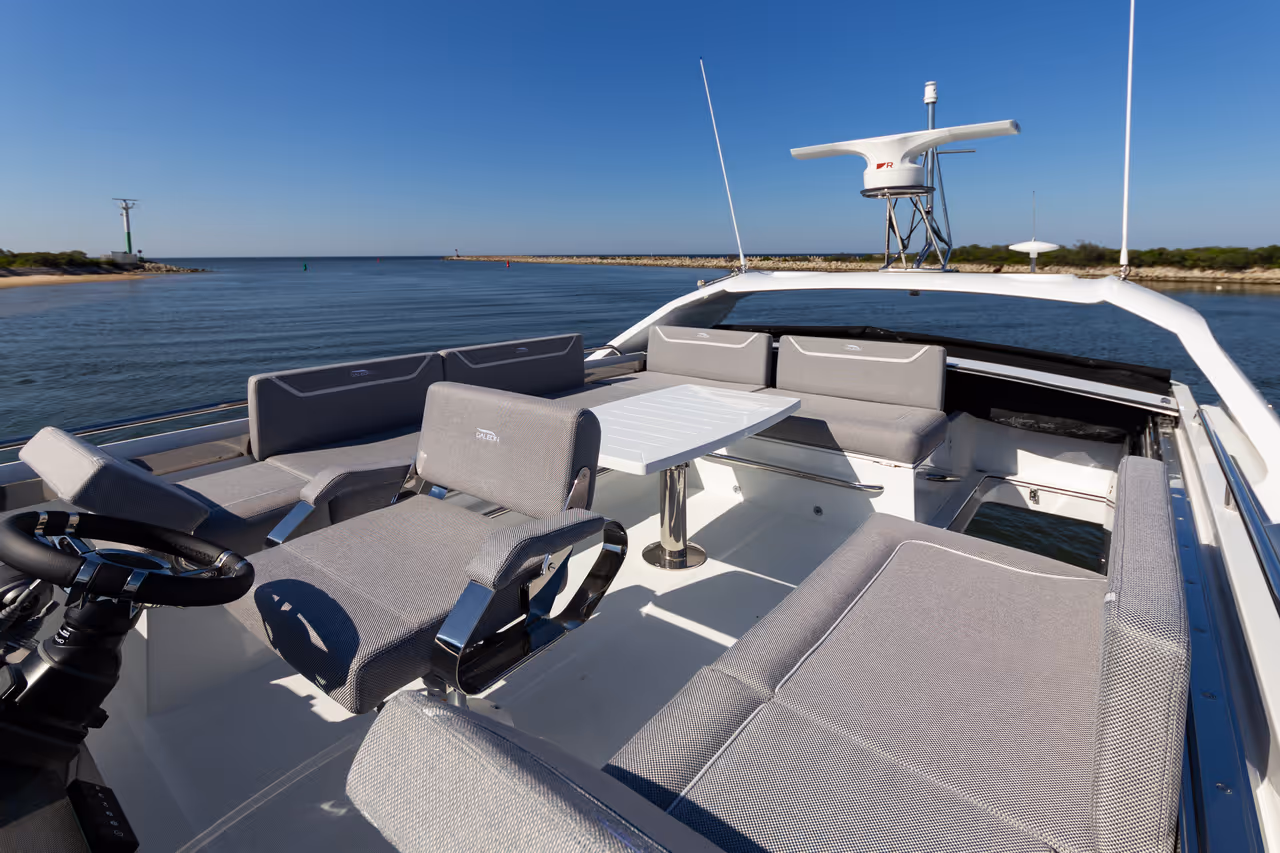 From the moment you step on board this 50-foot beauty, the sea feels closer than ever. The sleek profile hides a fully functional Skydeck, where a U-shaped sofa, companion seat by the helm, and barbecue area create the perfect setting for open-air dining and shared adventures.