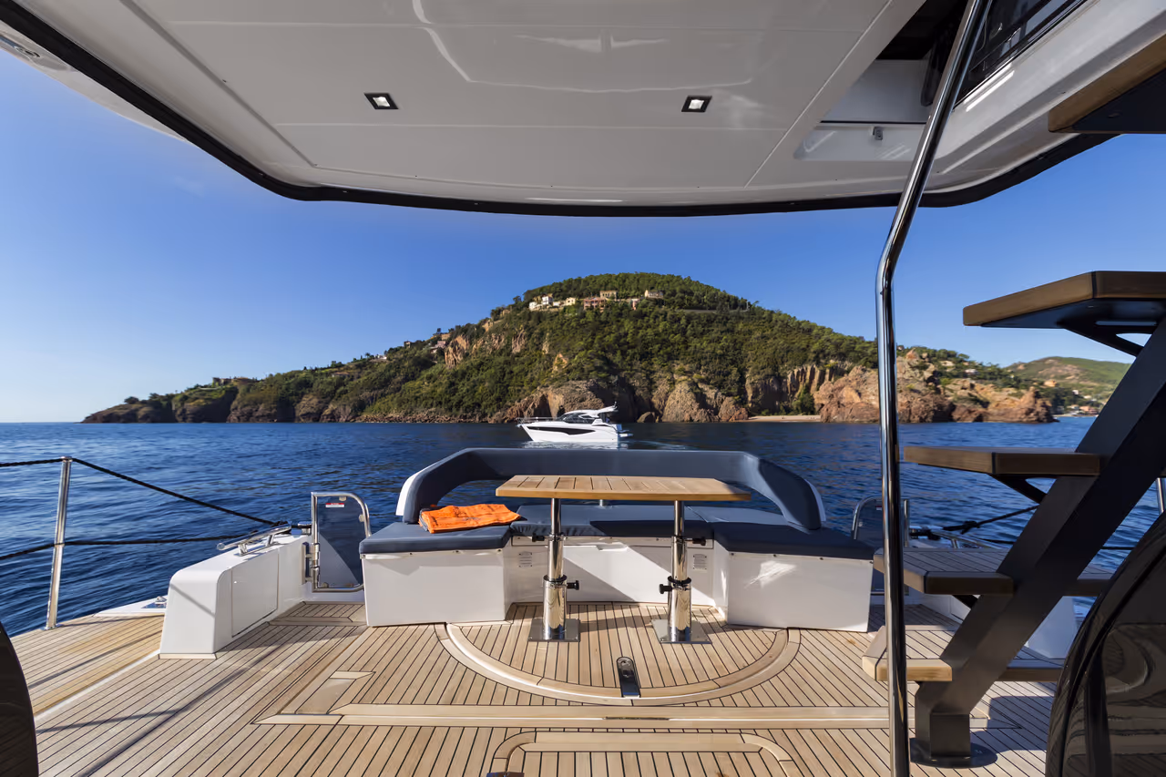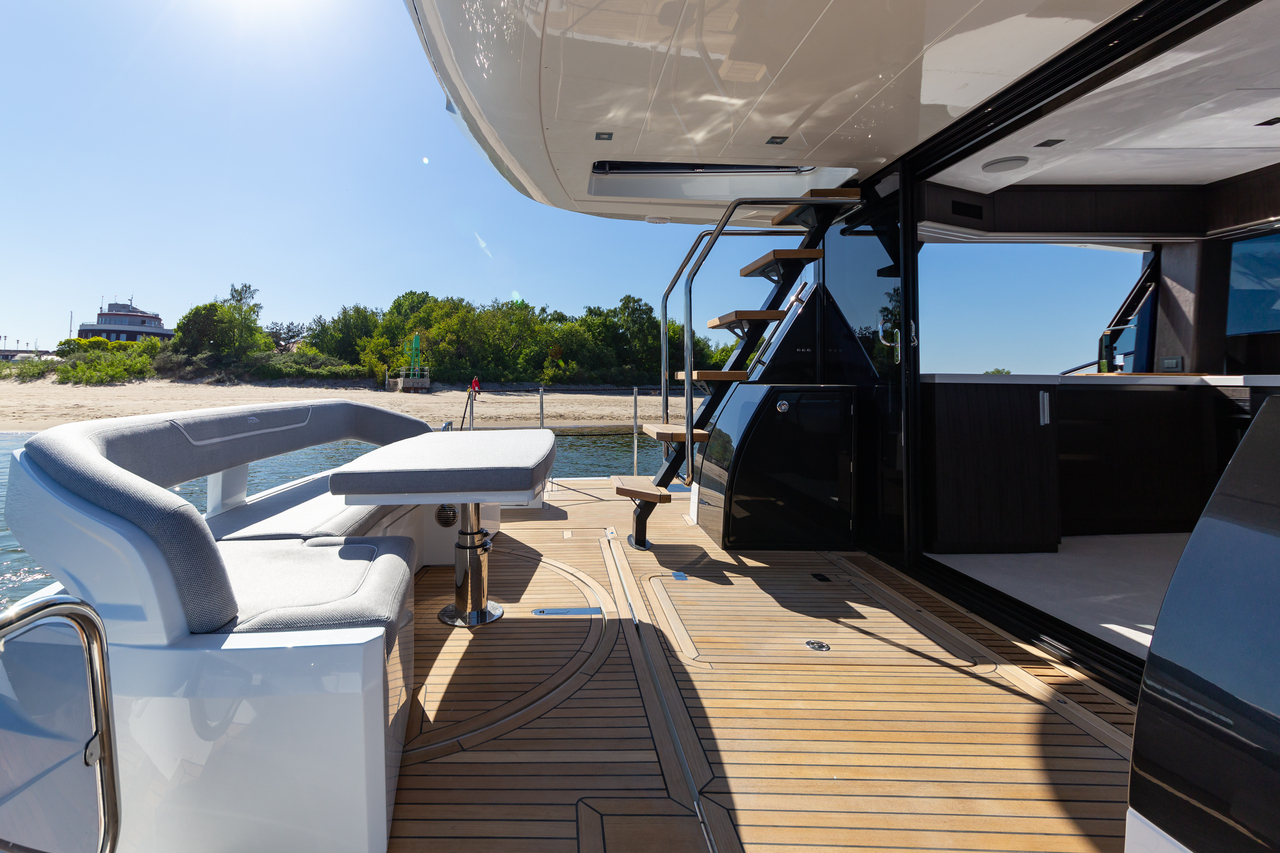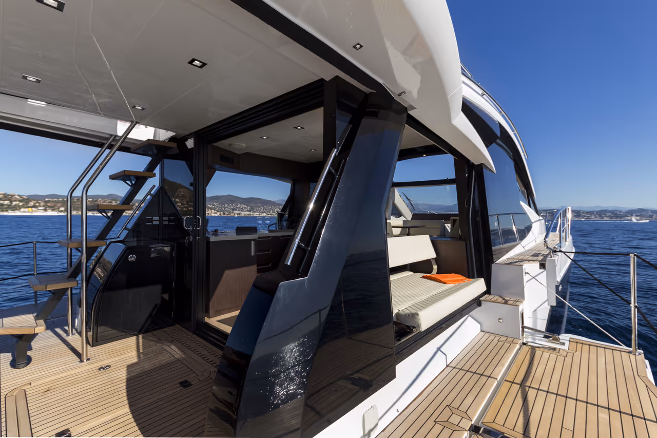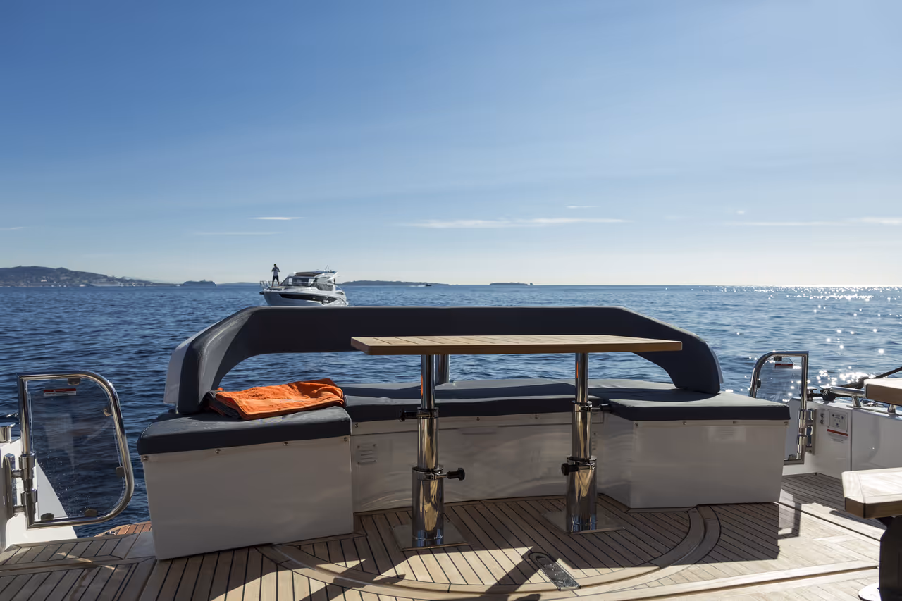At the bow, a generous lounge offers a private escape for sunbathing or quiet moments as the coastline drifts by. Aft, the innovative Beach Mode with fold-down balconies transforms the cockpit into a waterside terrace, while the aft lounge flows seamlessly from the salon, keeping the conversation alive from sunrise to sunset.