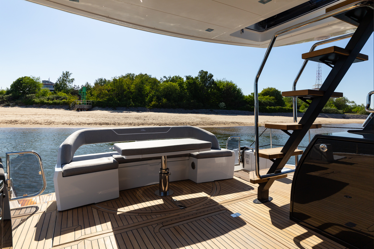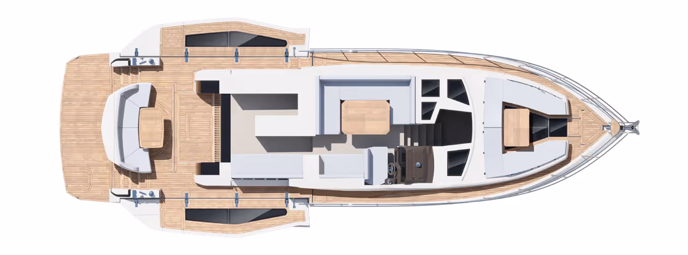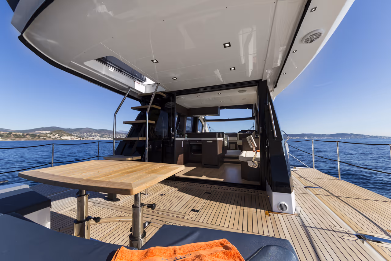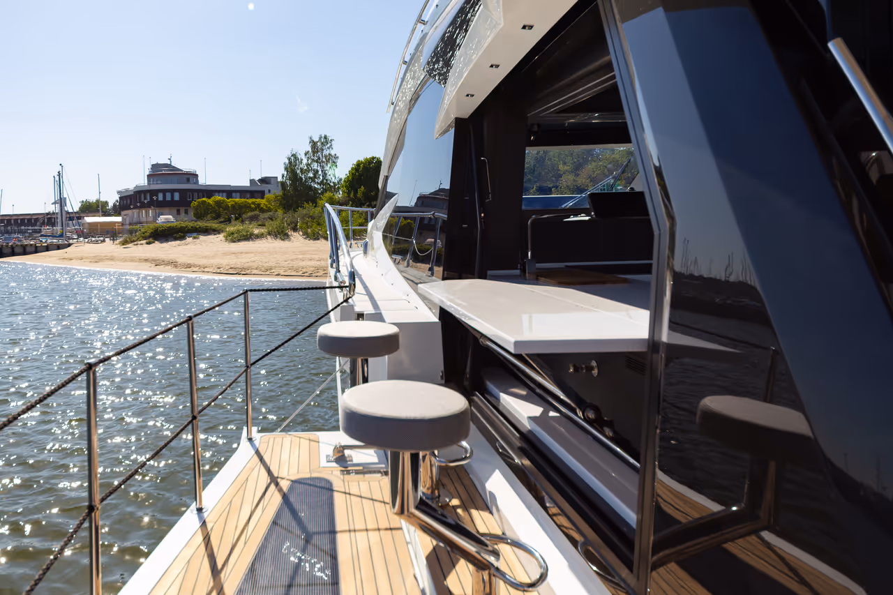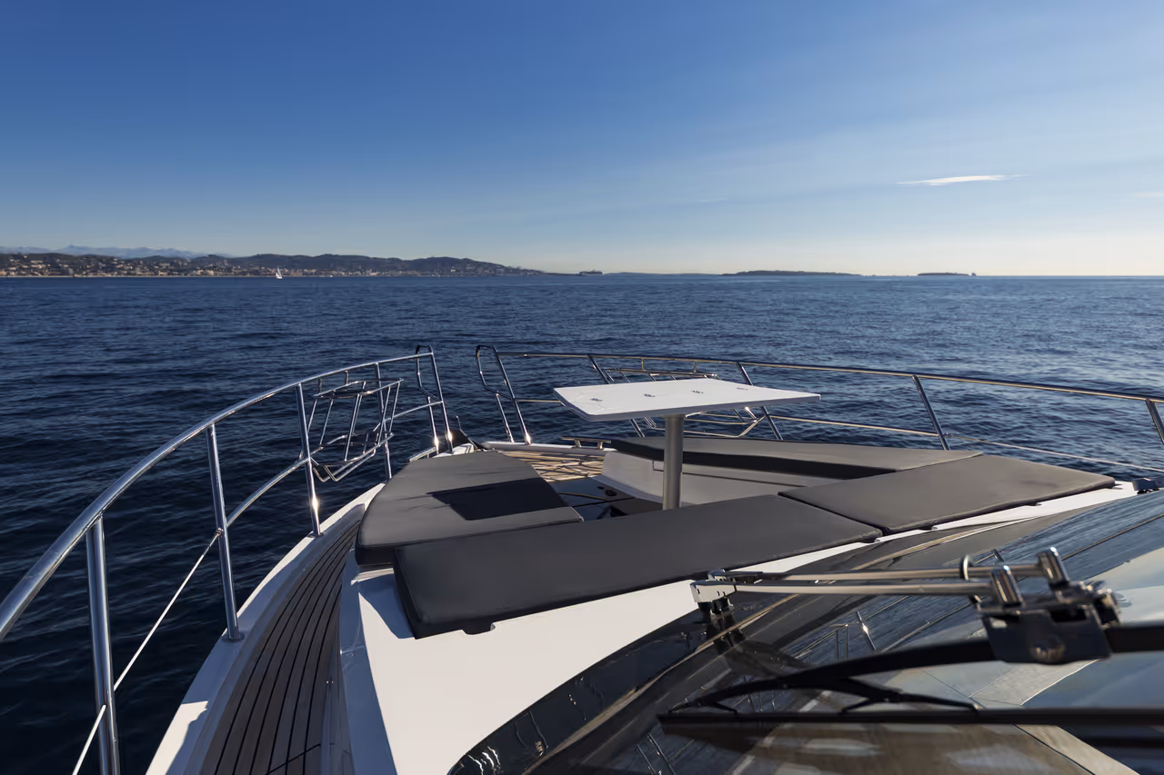 At the bow, a generous lounge offers a private escape for sunbathing or quiet moments as the coastline drifts by. Aft, the innovative Beach Mode with fold-down balconies transforms the cockpit into a waterside terrace, while the aft lounge flows seamlessly from the salon, keeping the conversation alive from sunrise to sunset.