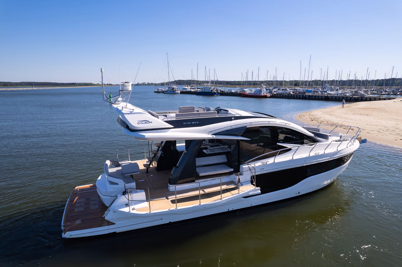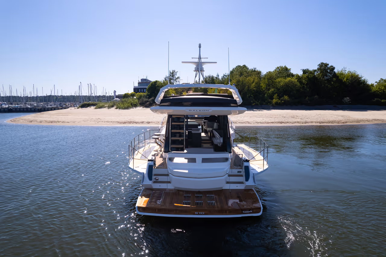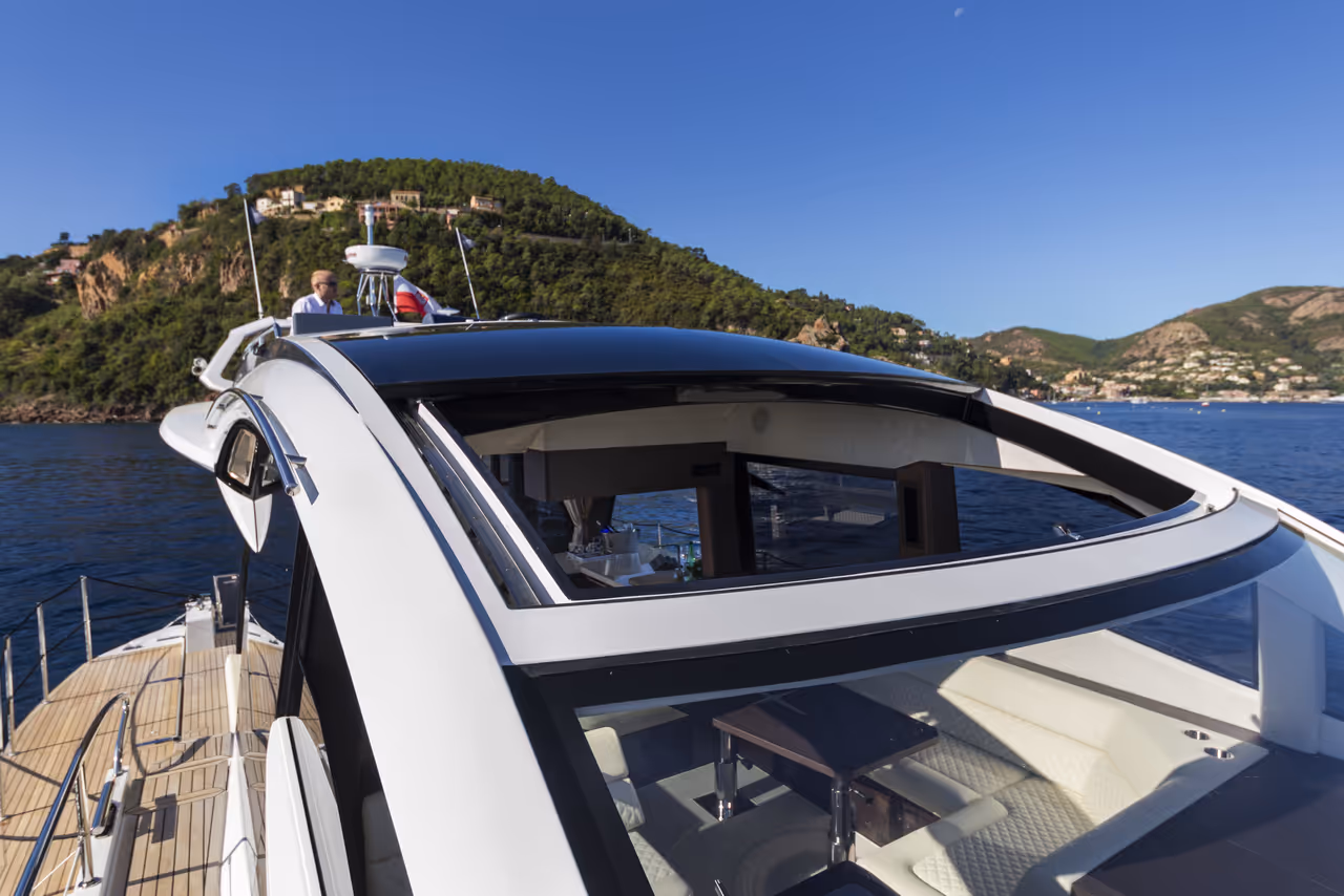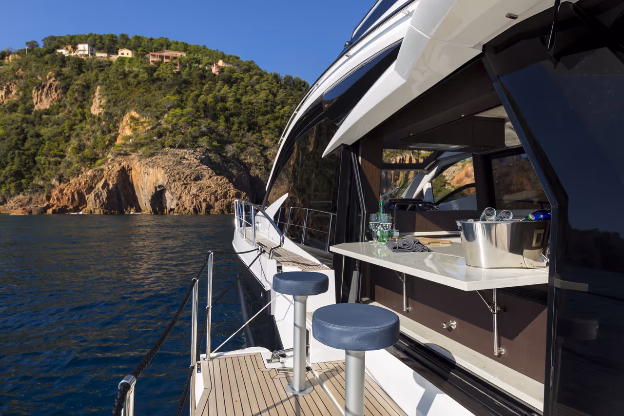 At the bow, a generous lounge offers a private escape for sunbathing or quiet moments as the coastline drifts by. Aft, the innovative Beach Mode with fold-down balconies transforms the cockpit into a waterside terrace, while the aft lounge flows seamlessly from the salon, keeping the conversation alive from sunrise to sunset.