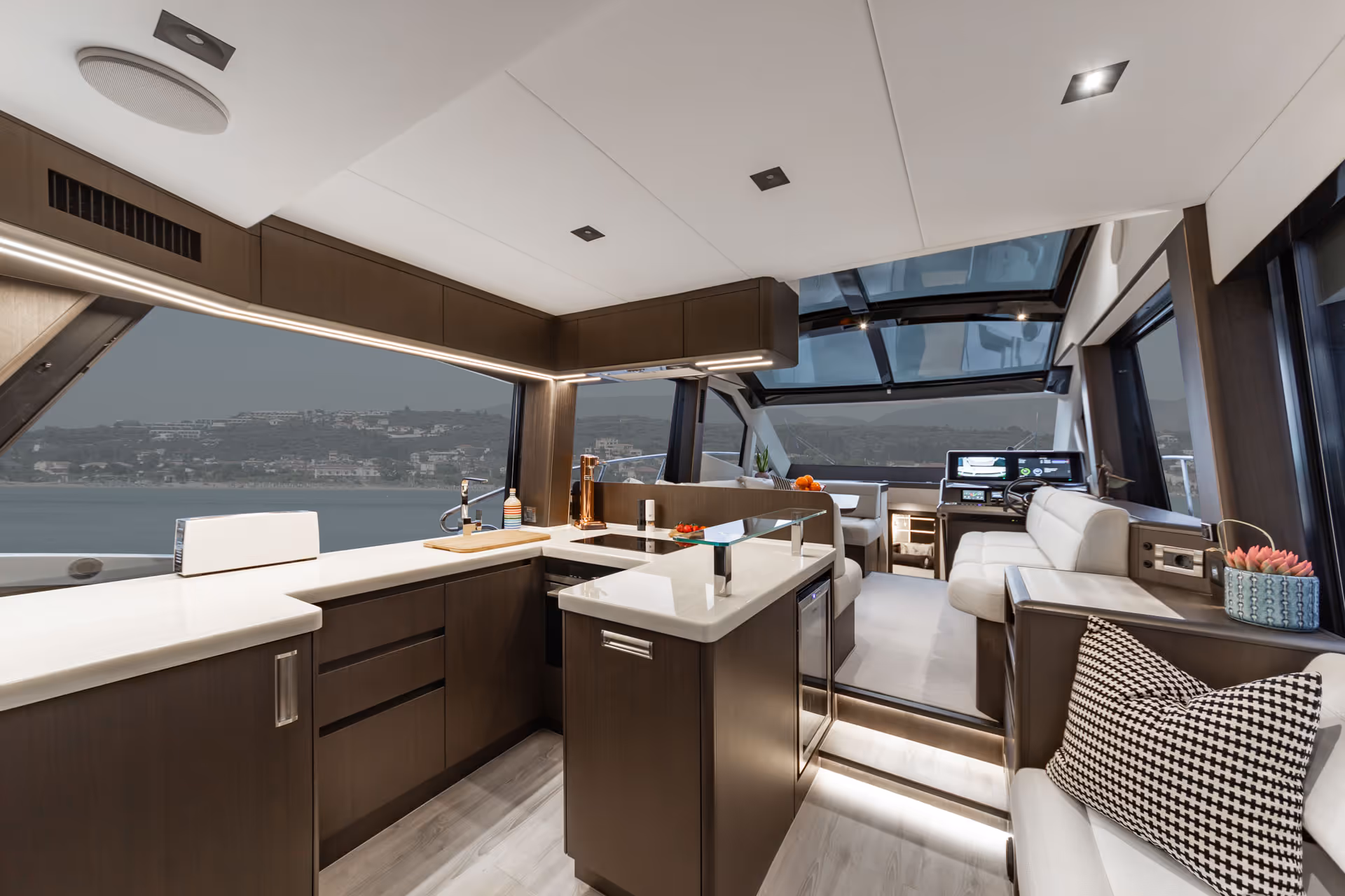Inside this 50-foot masterpiece, light pours through panoramic windows, wrapping every moment in endless sea views. The open-plan salon brings the galley, dining, and lounge together into a single, social space – perfect for lingering breakfasts at anchor or intimate evenings under soft lighting.