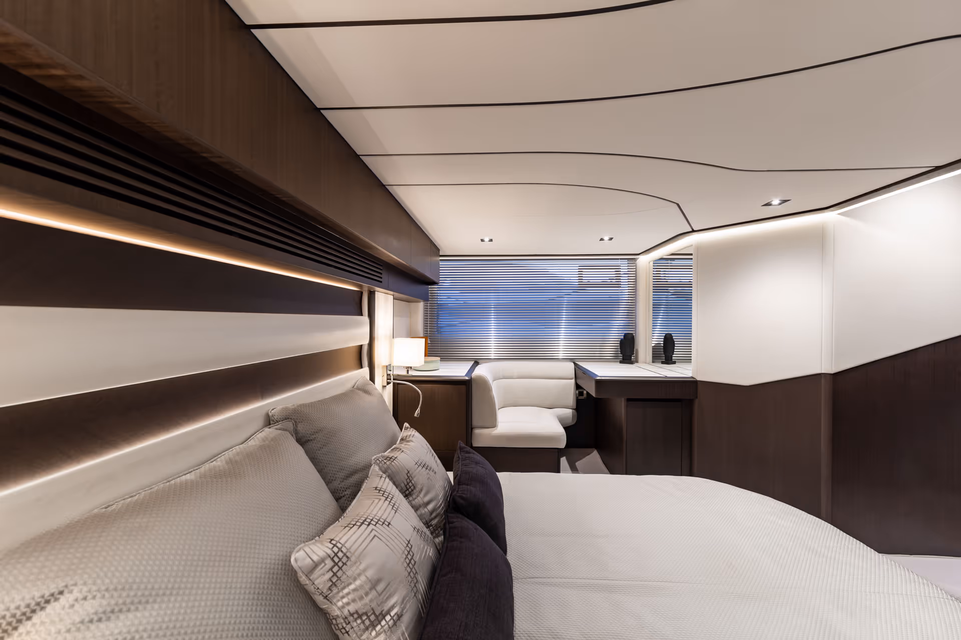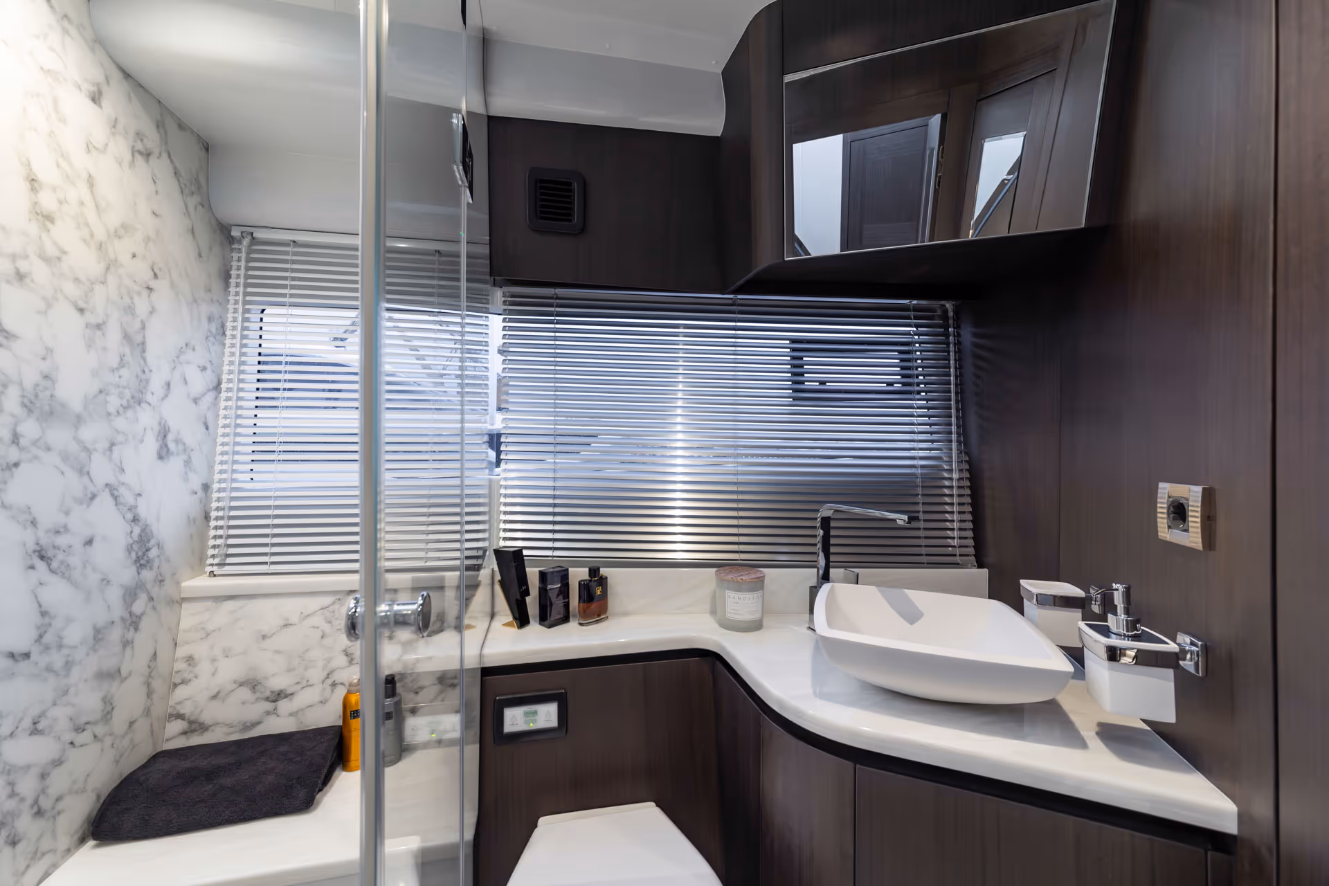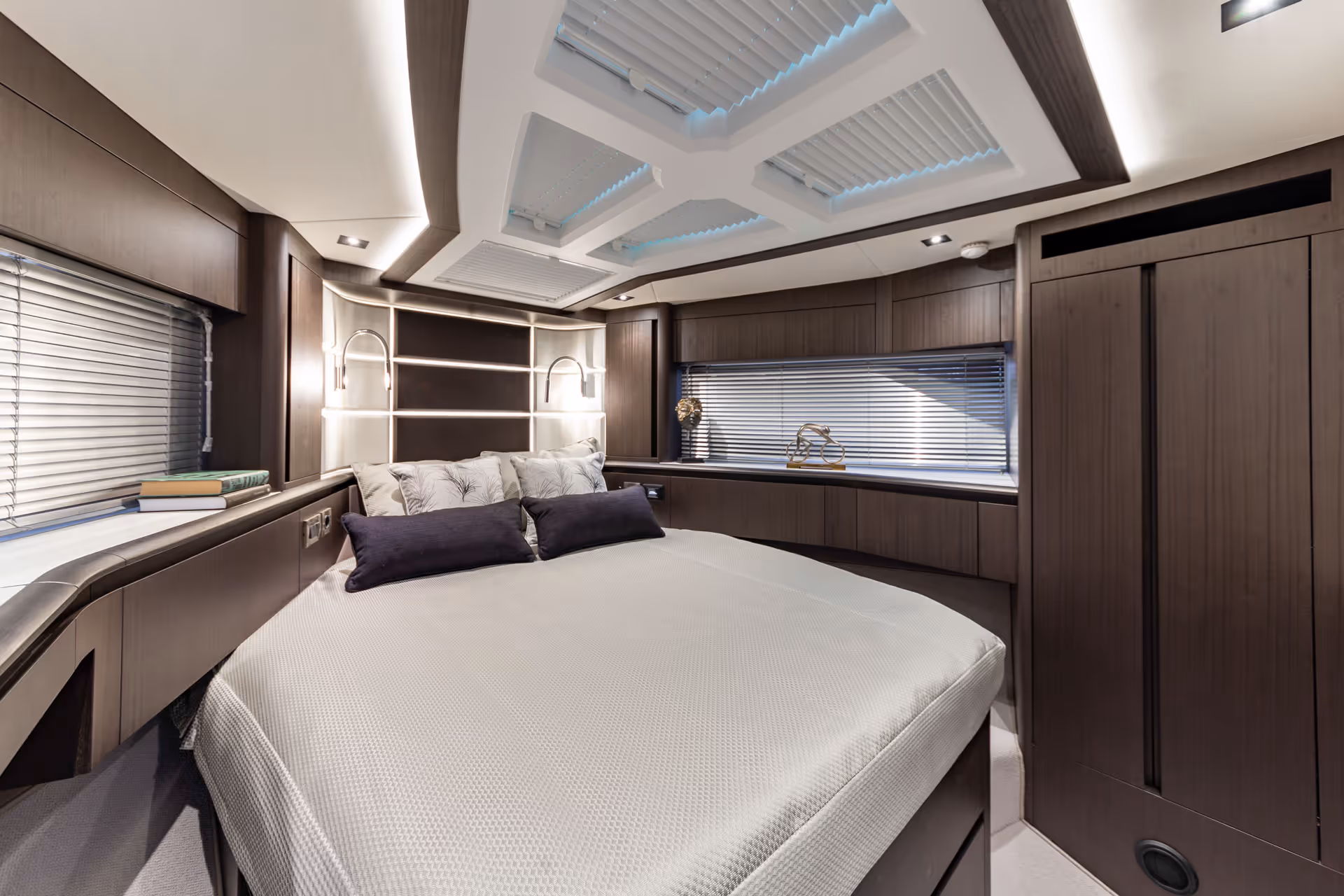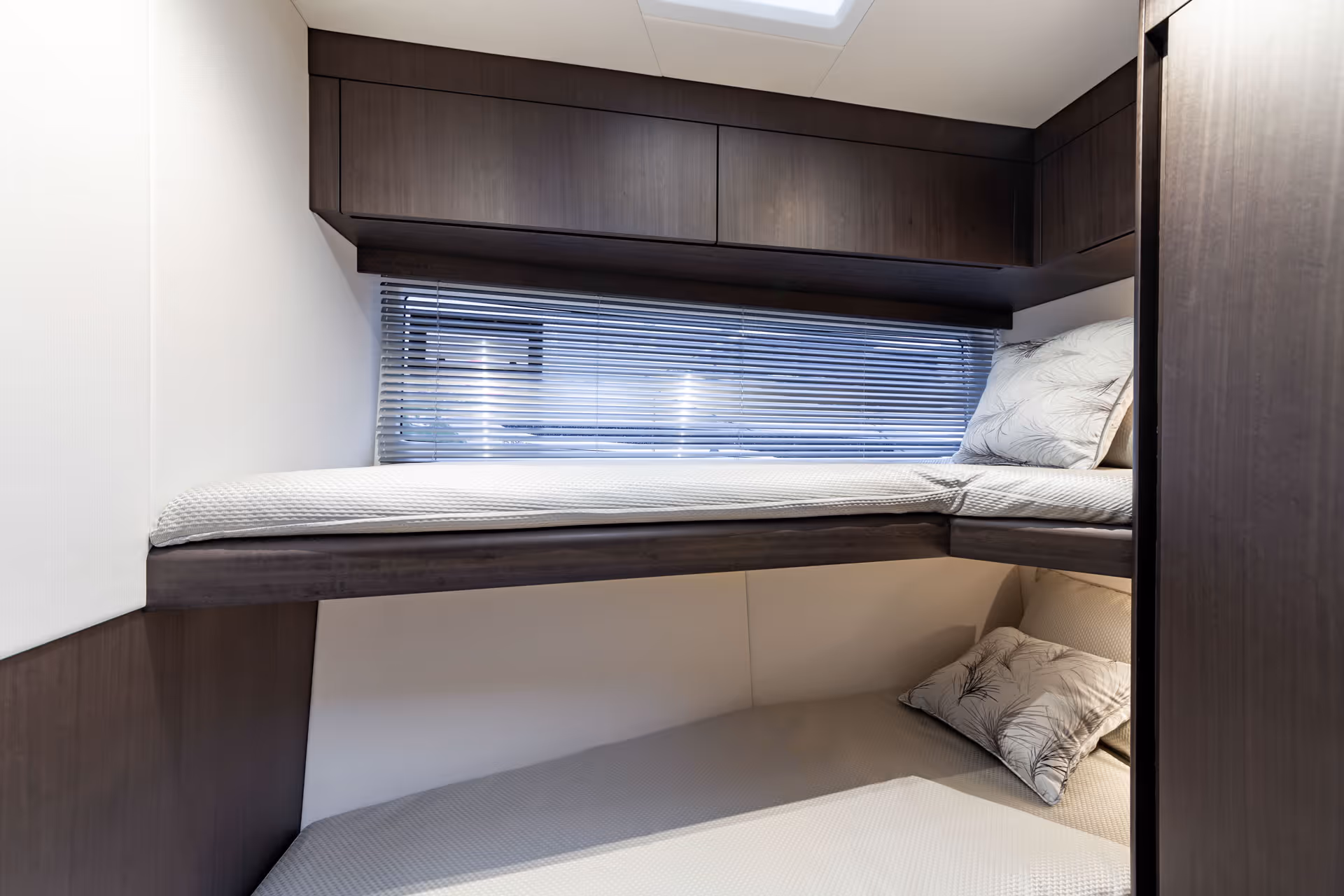 Below deck, three beautifully appointed cabins offer private retreats for you and your guests. The full-beam master suite feels like a boutique hotel at sea, with a king-size bed, walk-in storage, and a private en-suite. Forward, the VIP cabin greets guests with style and space, while the twin cabin ensures everyone enjoys comfort and privacy.