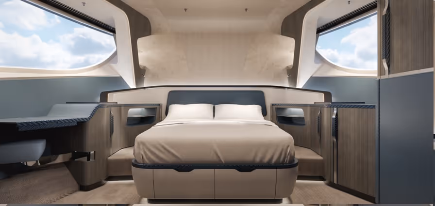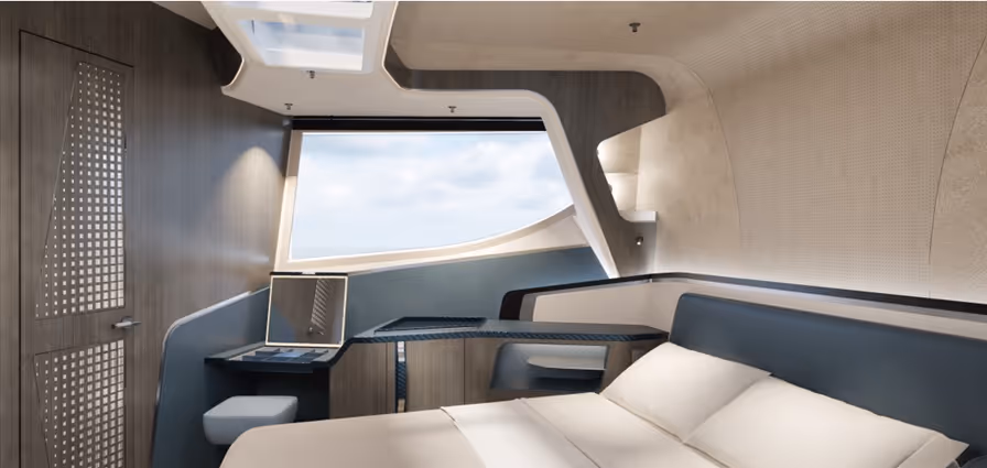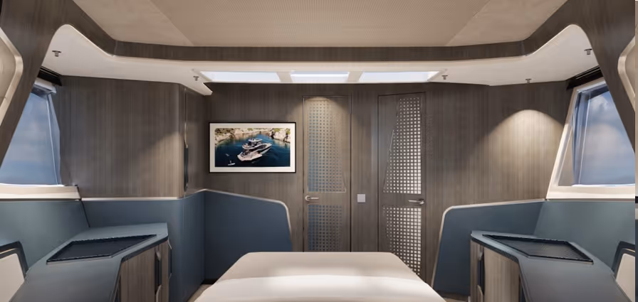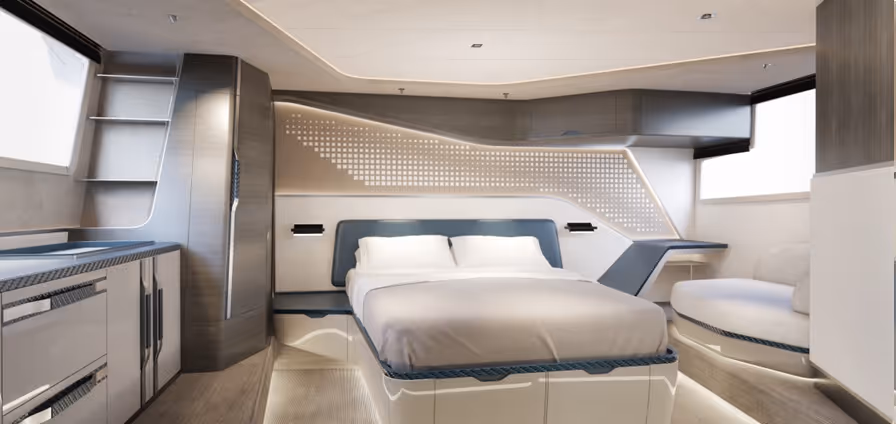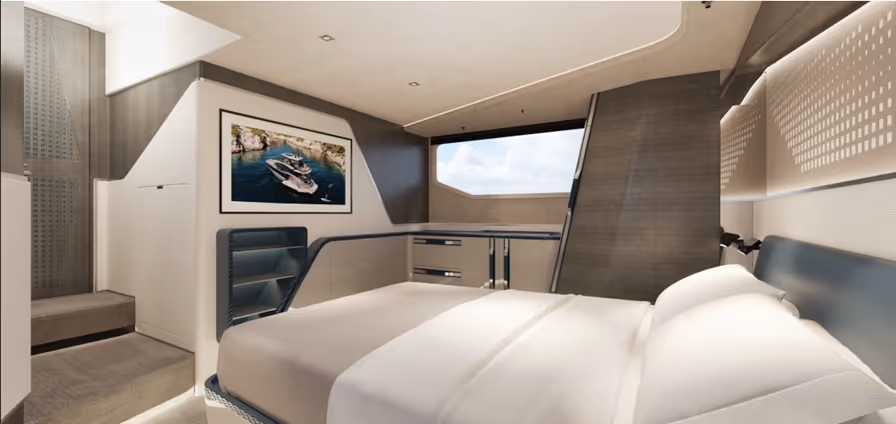 looks. The top deck provides a hidden flybridge area with a full helm, sun loungers, and