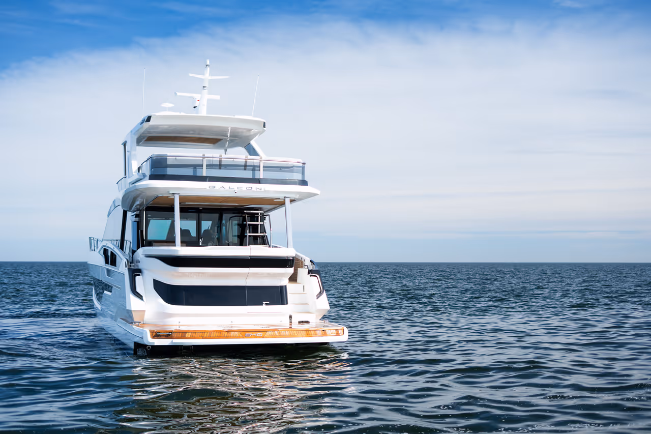 The Galeon 640 Fly commands attention with its bold lines, dynamic profile, and clever use of space. Expansive flybridge areas, a generous bow lounge, and a stylish aft cockpit create multiple zones for entertaining, relaxing, and enjoying the open air.