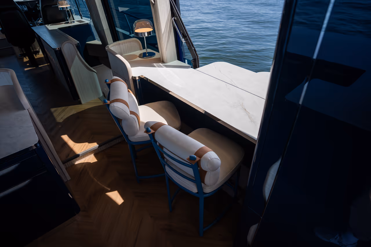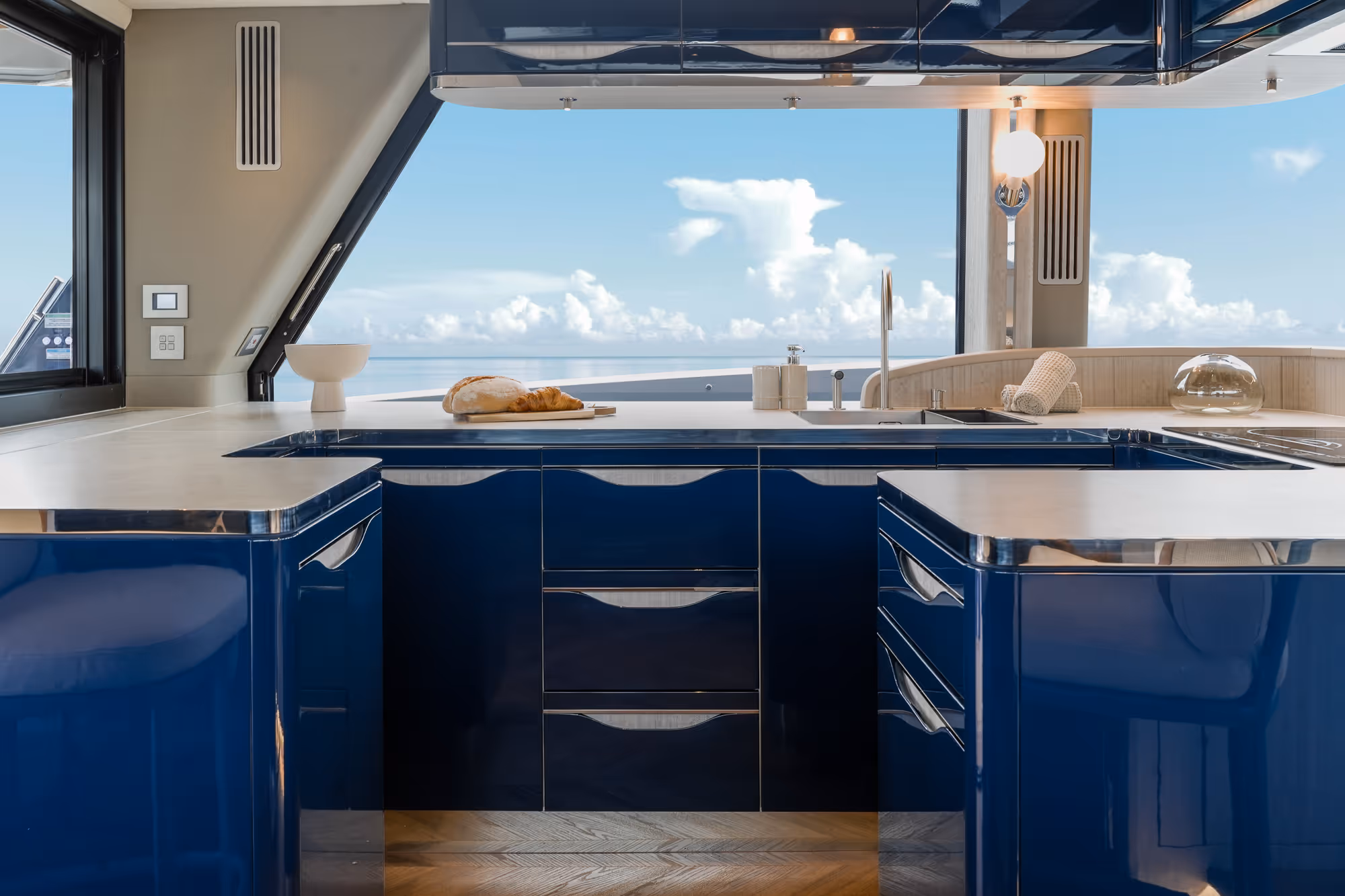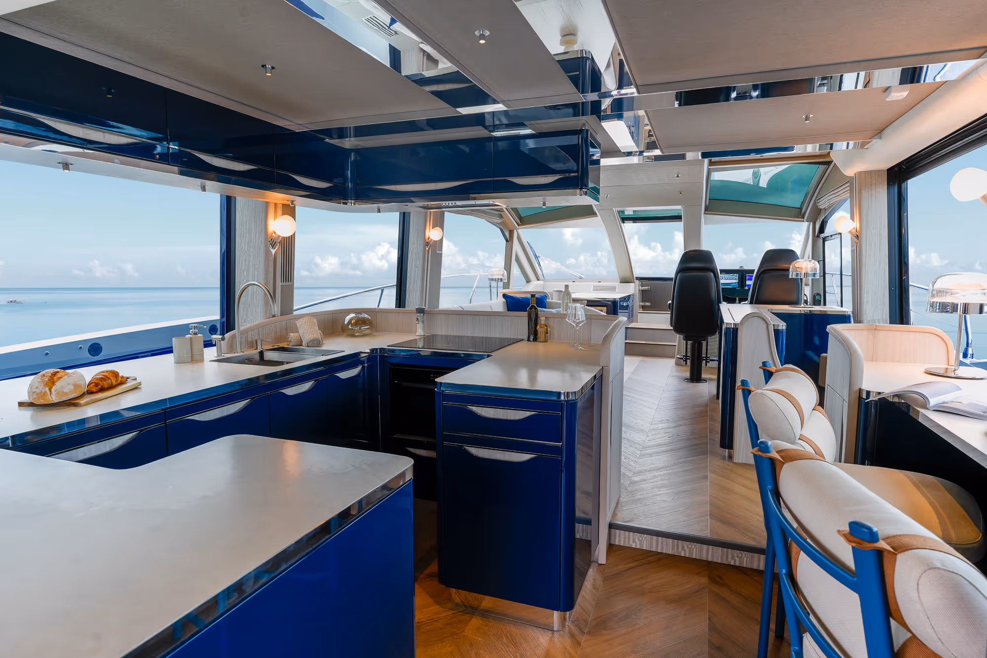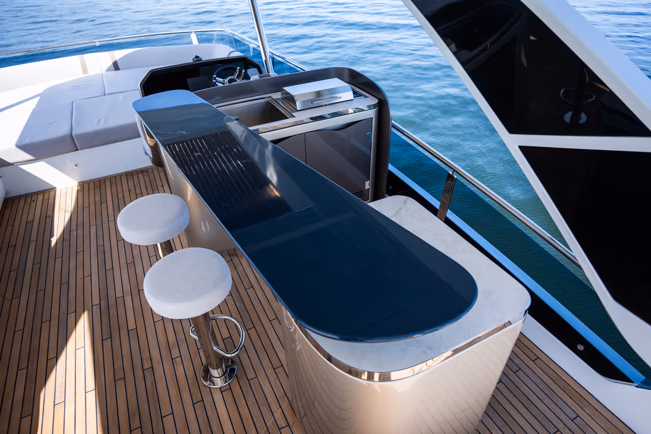 - A fully equipped grill and wet bar area on the flybridge makes outdoor cooking effortless, turning this elevated deck into the ultimate entertaining space with panoramic views.