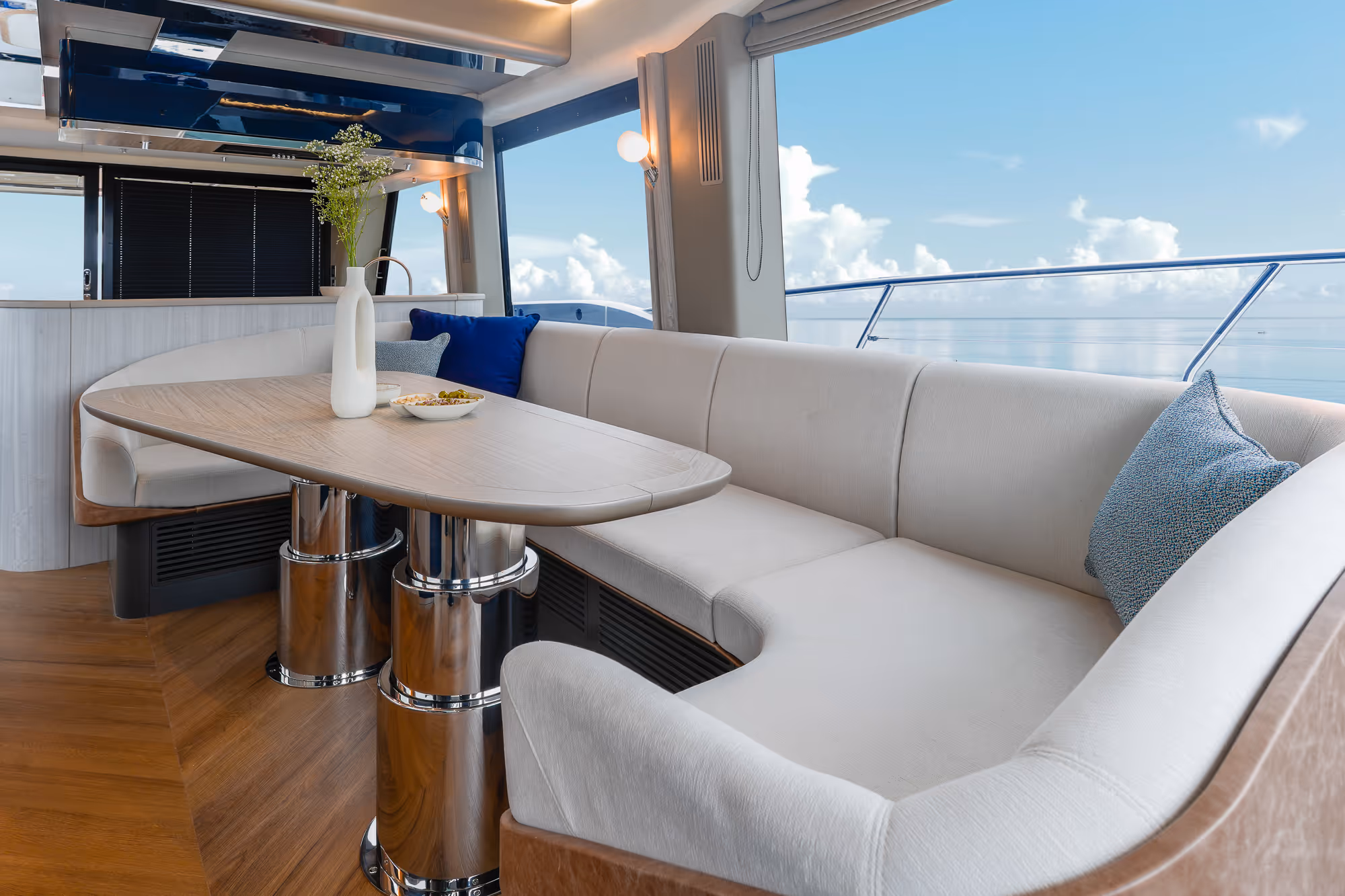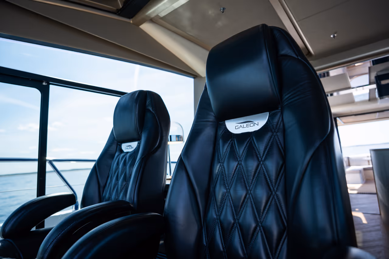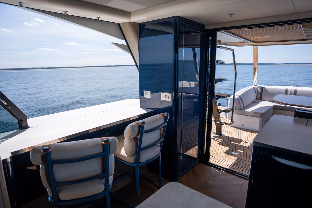 Step inside the Galeon 640 Fly and discover a world of refined comfort. The salon, surrounded by floor-to-ceiling glass, is flooded with natural light and offers 360-degree sea views, creating a bright, inviting atmosphere.