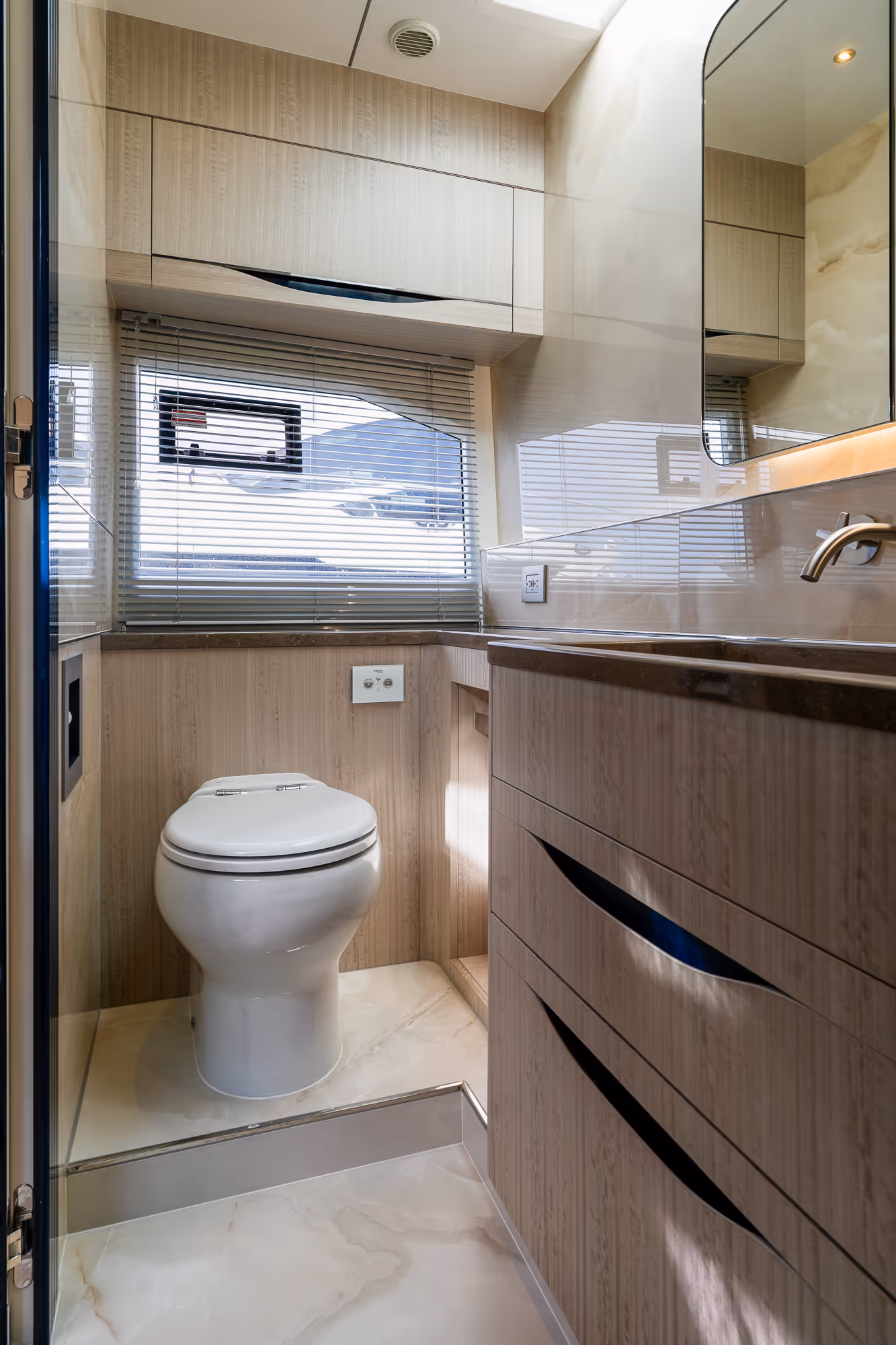 - Spacious forward cabin with premium finishes and en-suite bathroom for guest comfort. Flexible Layout Options