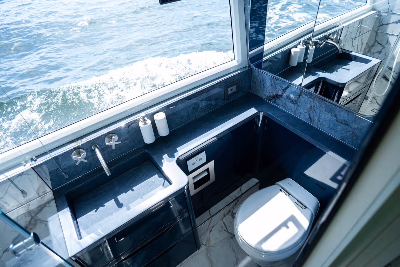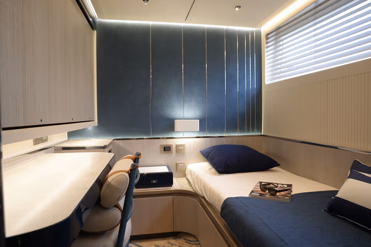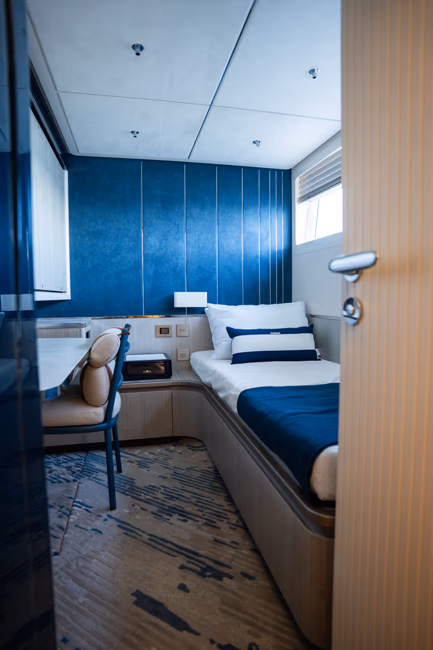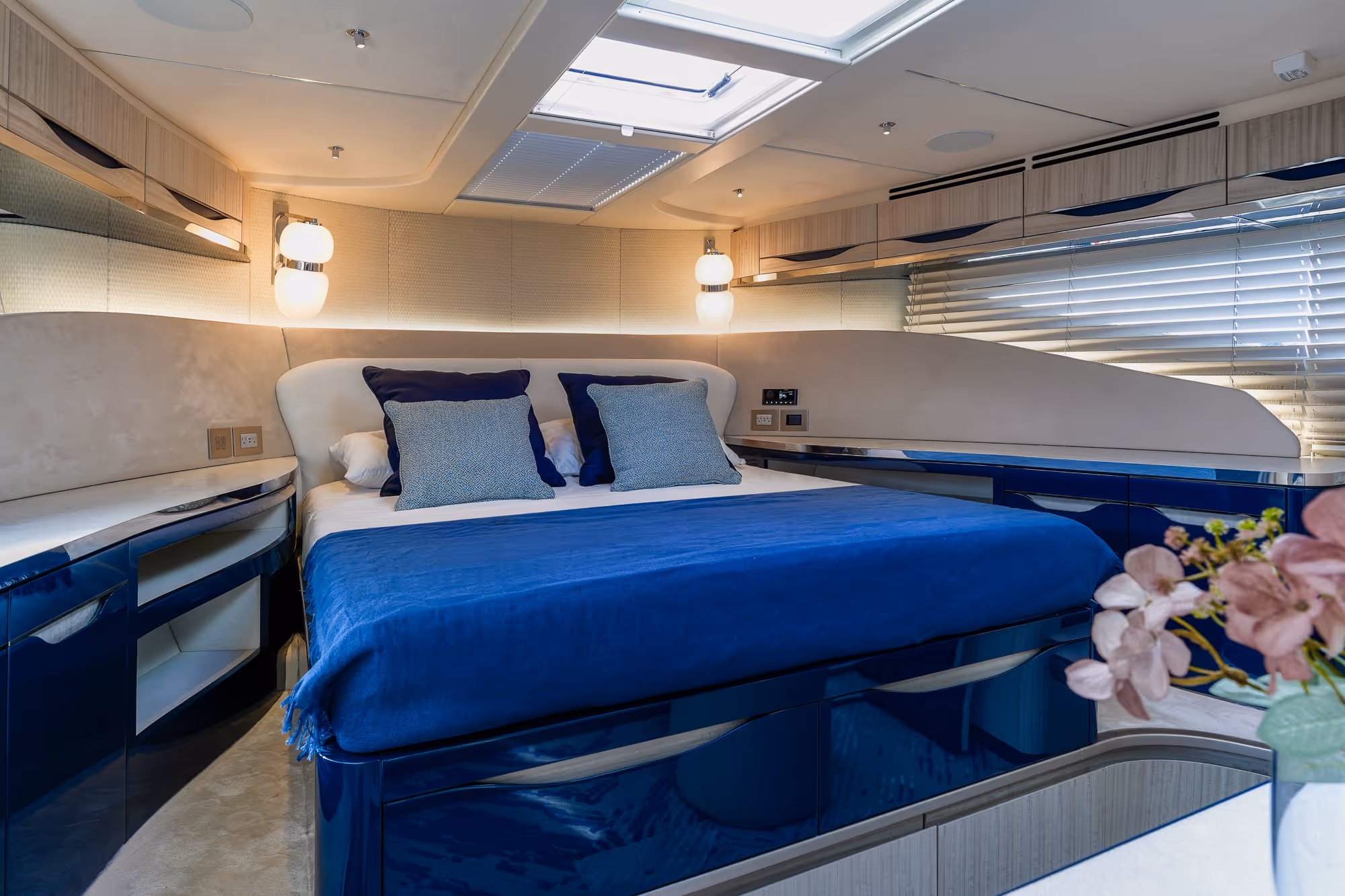 - Luxurious owner’s cabin with panoramic hull windows, king-size bed, walk-in wardrobe, and a private en-suite bathroom.