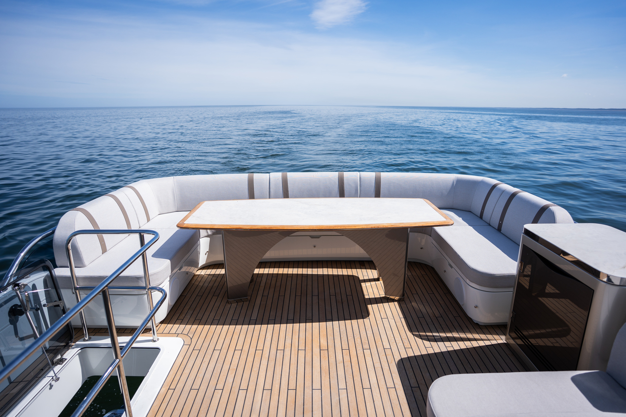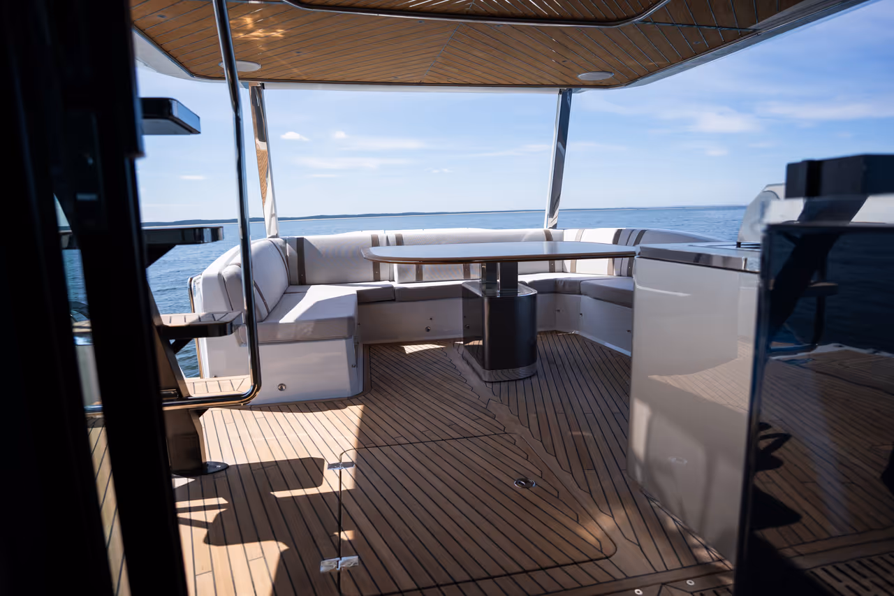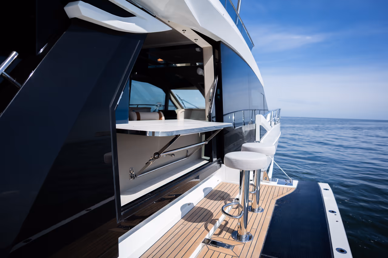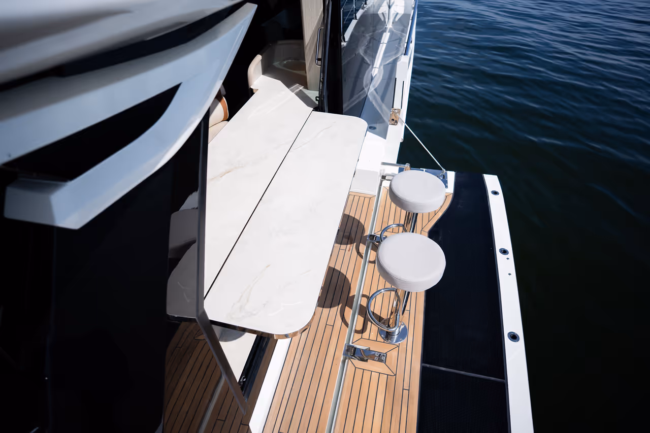 One of its signature innovations is the transformer aft platform — a large, hydraulic swim platform that doubles as a launching area for water toys or a private beach at sea level. Wide walkaround decks ensure safe movement, while the flybridge offers panoramic views, a dining area, and a fully equipped wet bar, making it the perfect setting for memorable moments on the water.