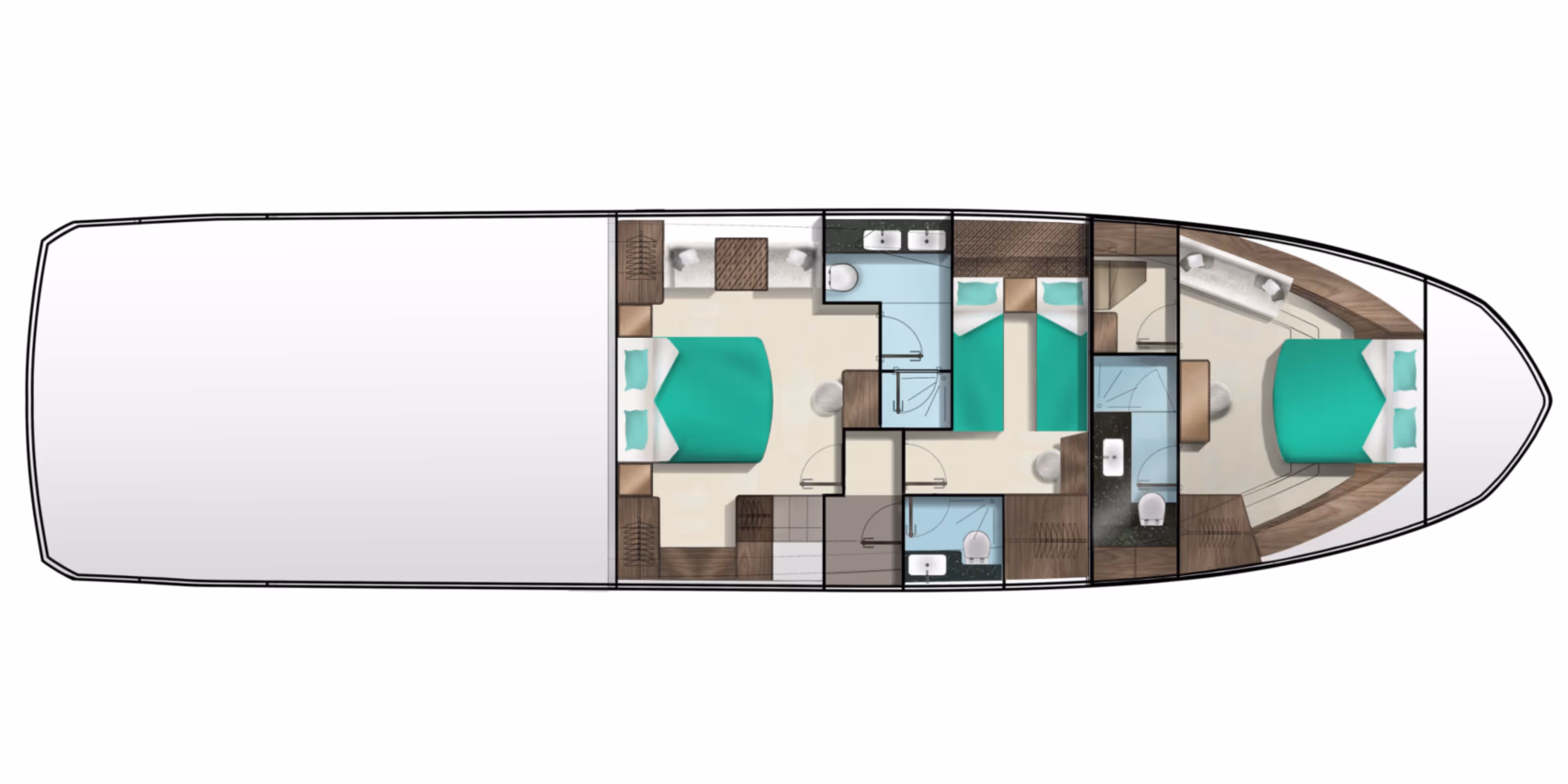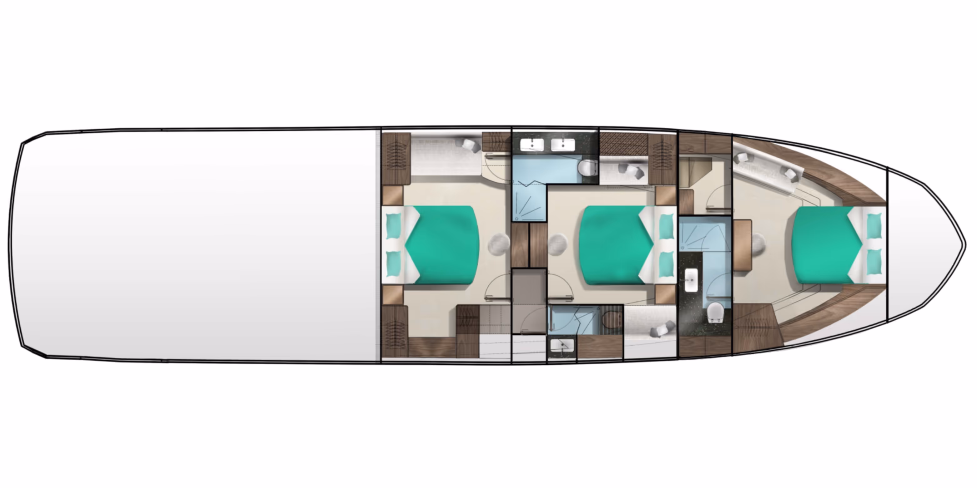 - Choice of 3- or 4-cabin configurations, including a “Supermaster” layout with expanded owner’s suite or additional guest cabins for charter use.