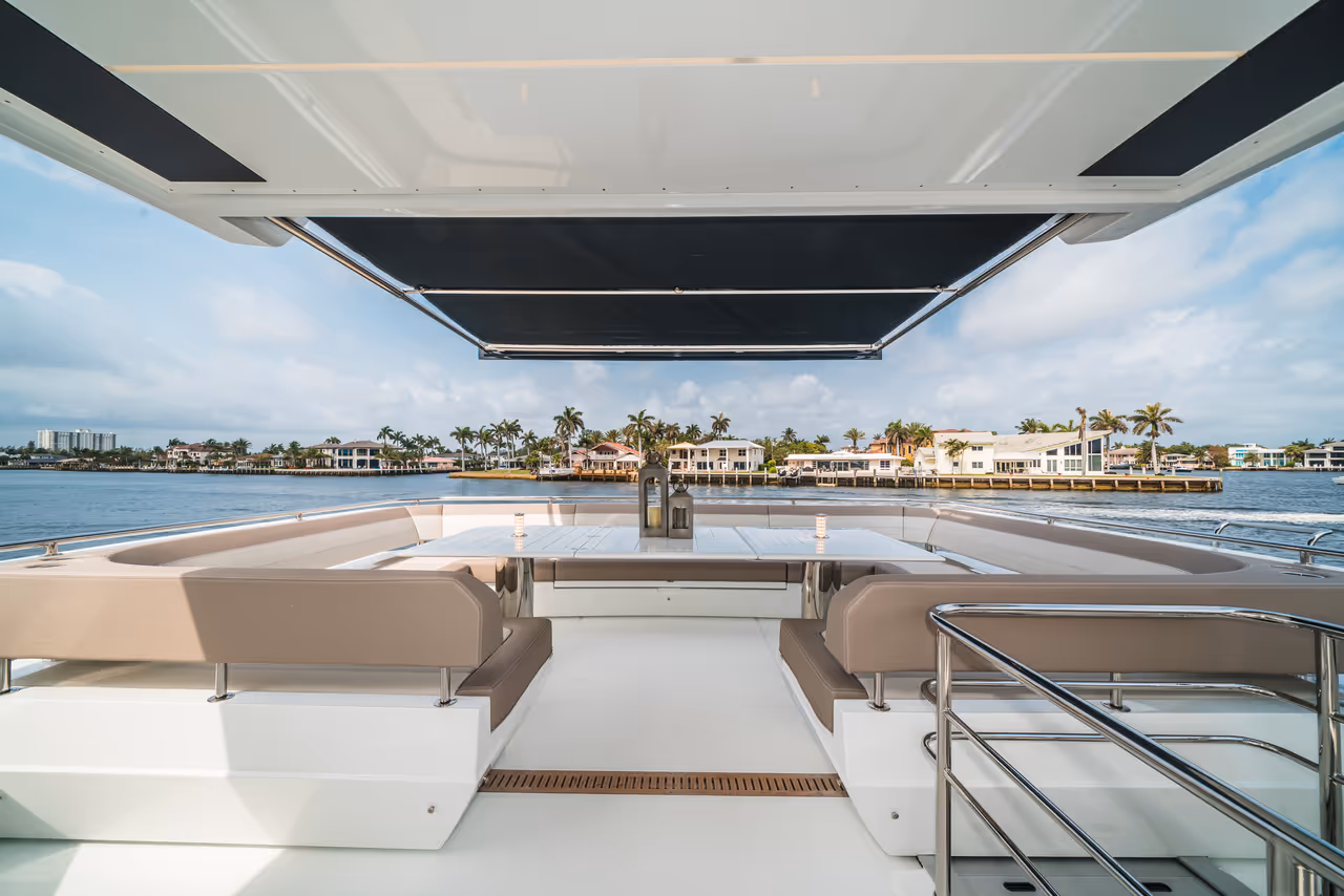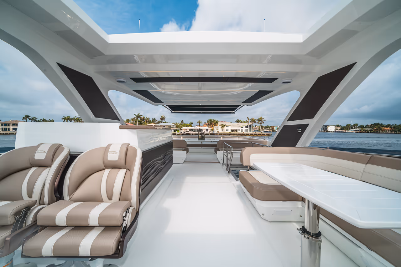 - Elegant cockpit lounge at the stern, featuring comfortable seating and an inviting alfresco dining space—perfect for relaxed gatherings.