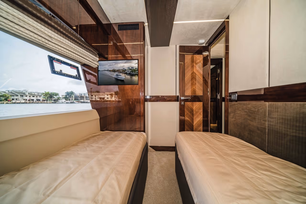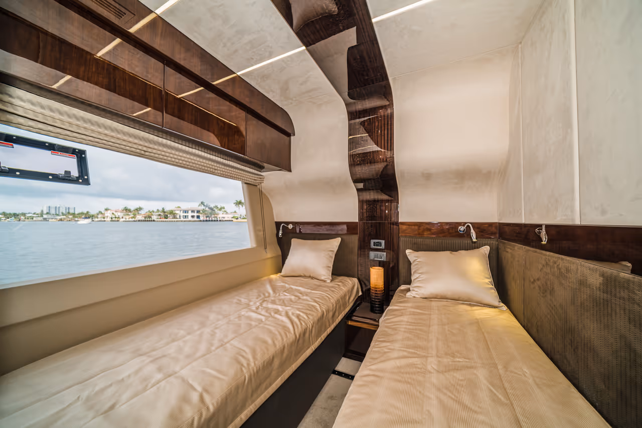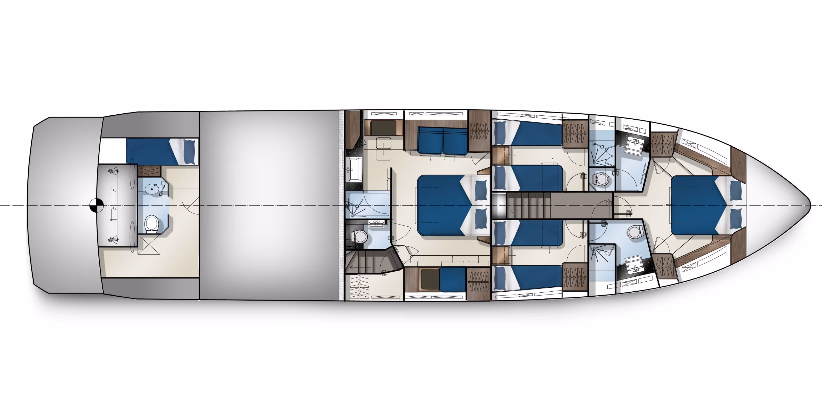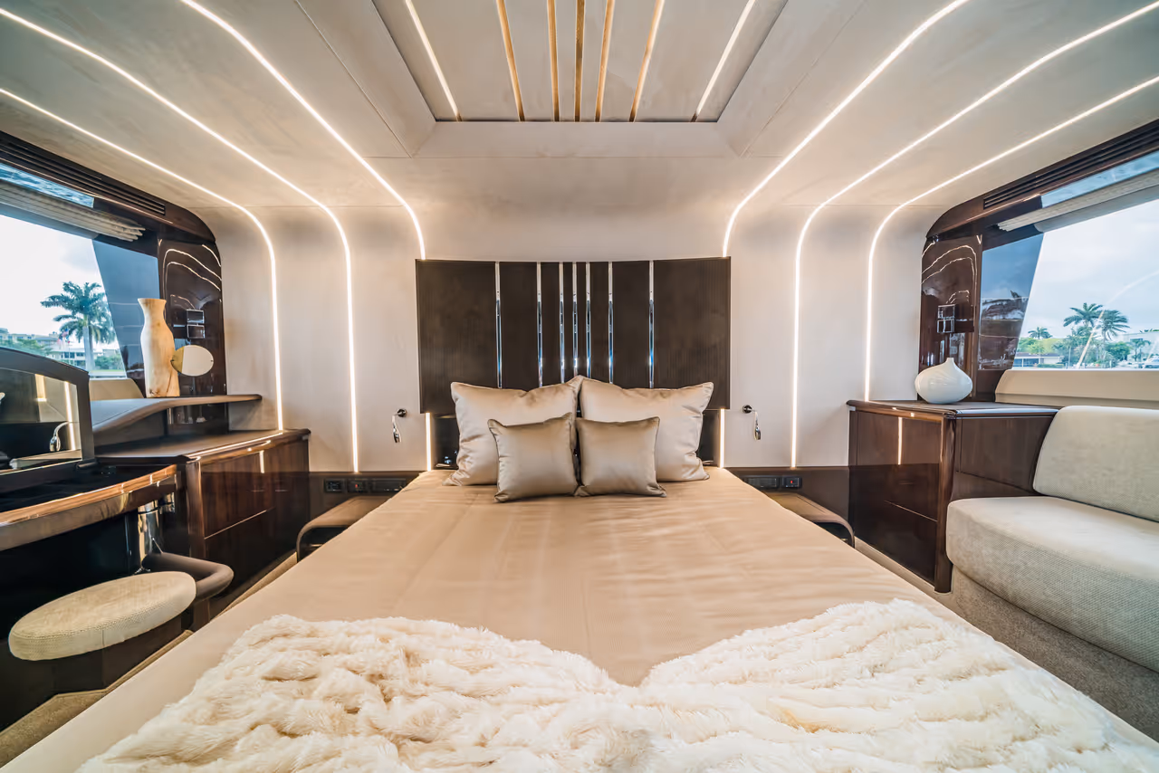 - Expansive midship master cabin featuring a king-size bed, walk-in wardrobe, and lavish ensuite bathroom.
