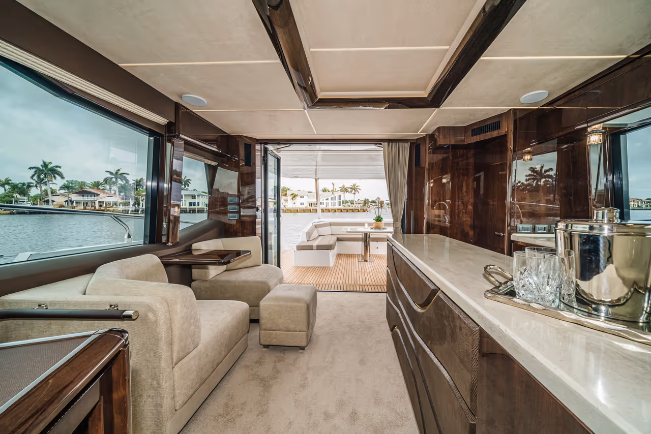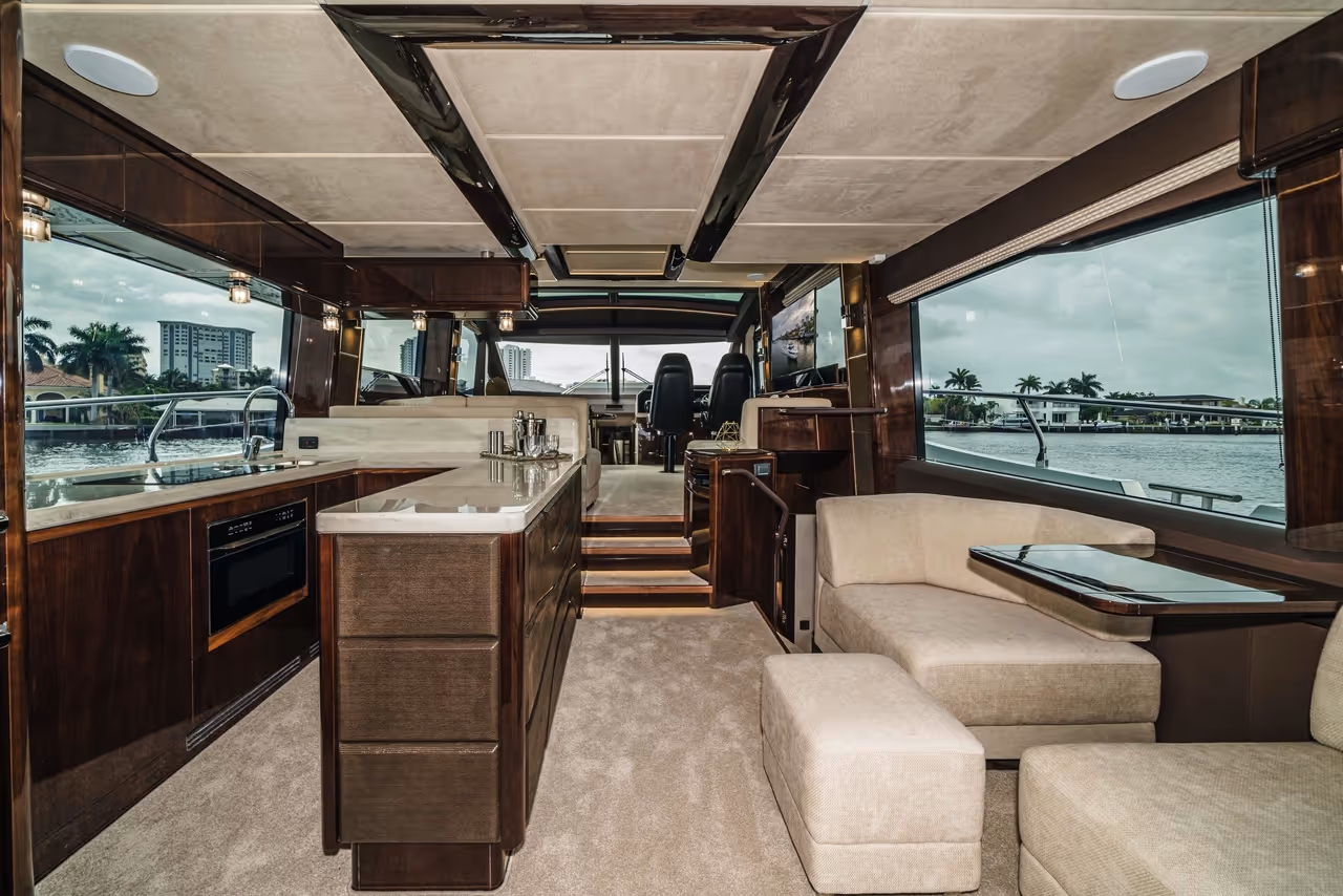 A spacious salon bathed in natural light, framed by expansive windows that blur the lines between sea and sky. Premium finishes—handcrafted wood accents, polished stainless steel, and sumptuous leather upholstery—define modern yacht luxury.