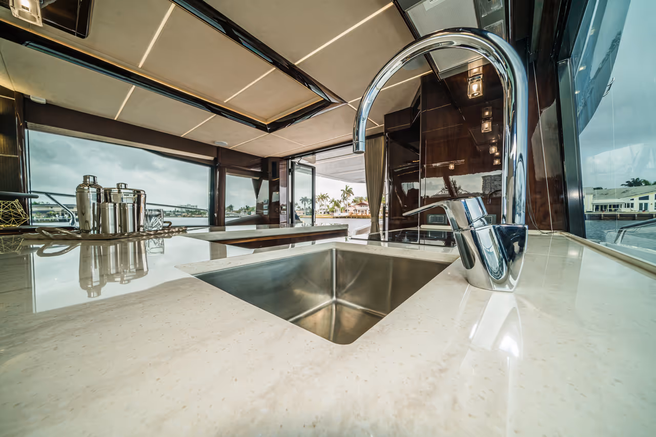 The spacious flybridge is your private sky lounge, offering panoramic vistas and luxurious comfort. Fully equipped with sun loungers, wet bar, and a dining area, it’s the ideal setting to relax or entertain guests under the sun and stars.