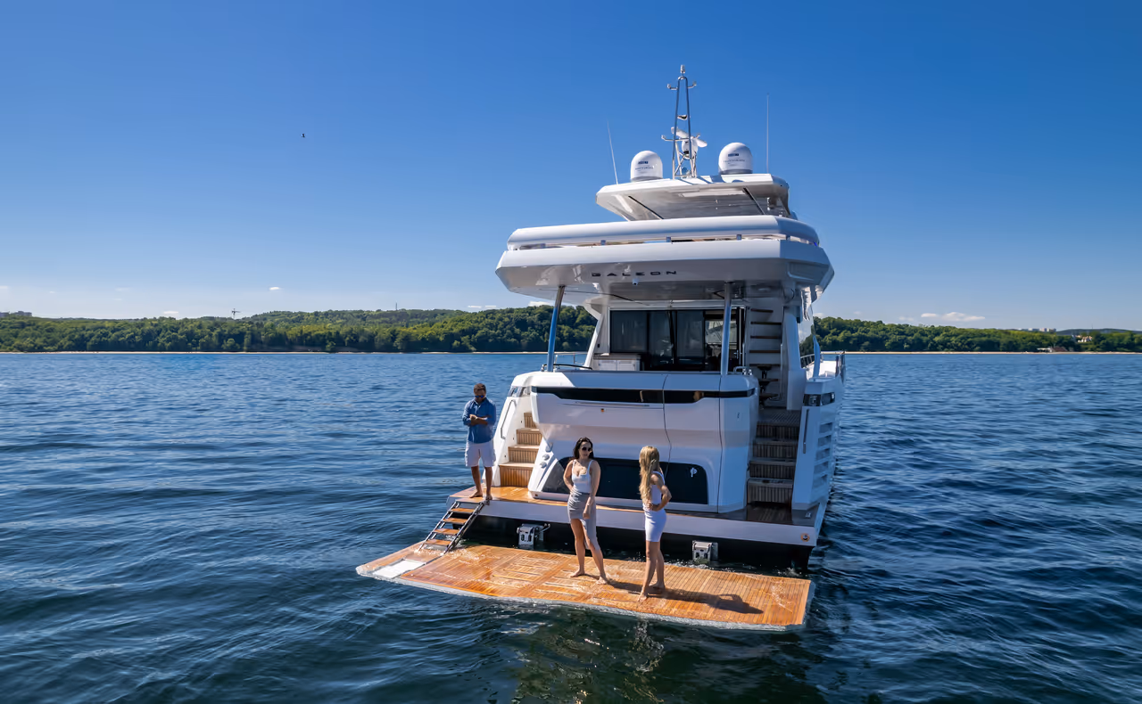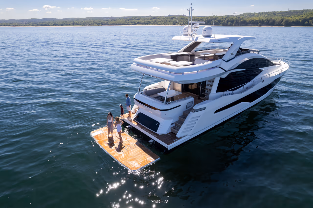 - A large, teak-clad hydraulic swim platform provides effortless access to the water, making it ideal for swimming, launching water toys, or boarding from a tender. When lowered, it becomes a private beach at sea level.