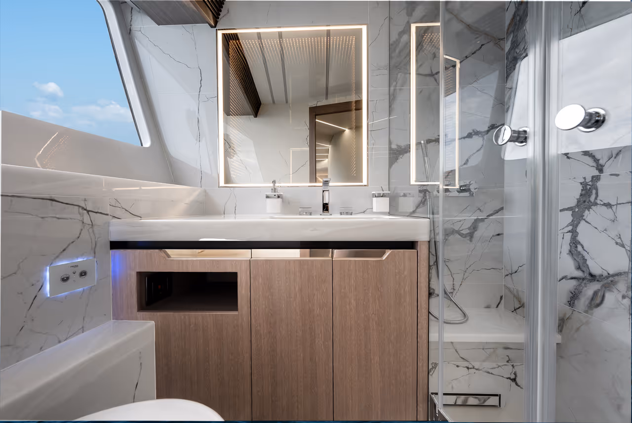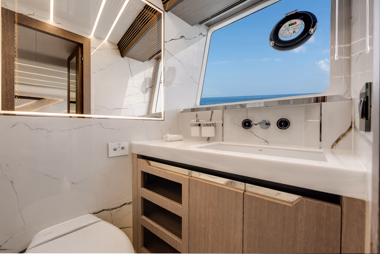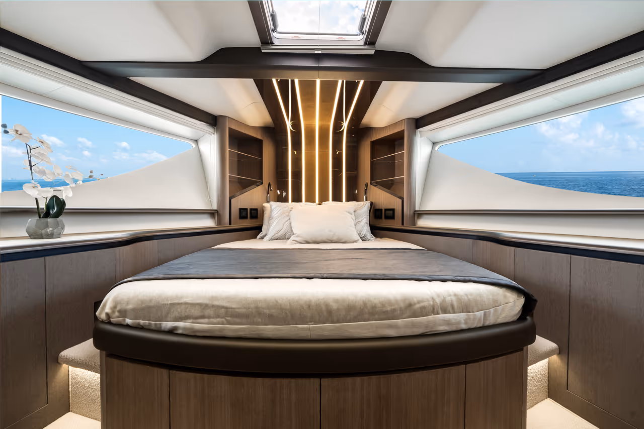 Below deck, the full-beam master suite offers total privacy with king-size bed, walk-in wardrobe, and spa-like bathroom. A spacious VIP cabin with skylights and two guest cabins, each with en-suite, provide refined comfort.