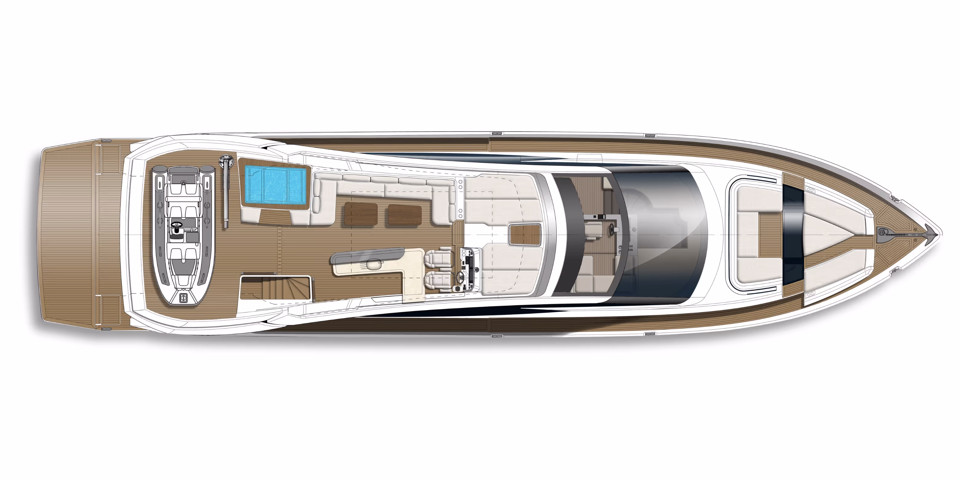 - A forward seating area with sunpads and optional shade – your own private escape for sunbathing, cocktails, or quiet reflection.