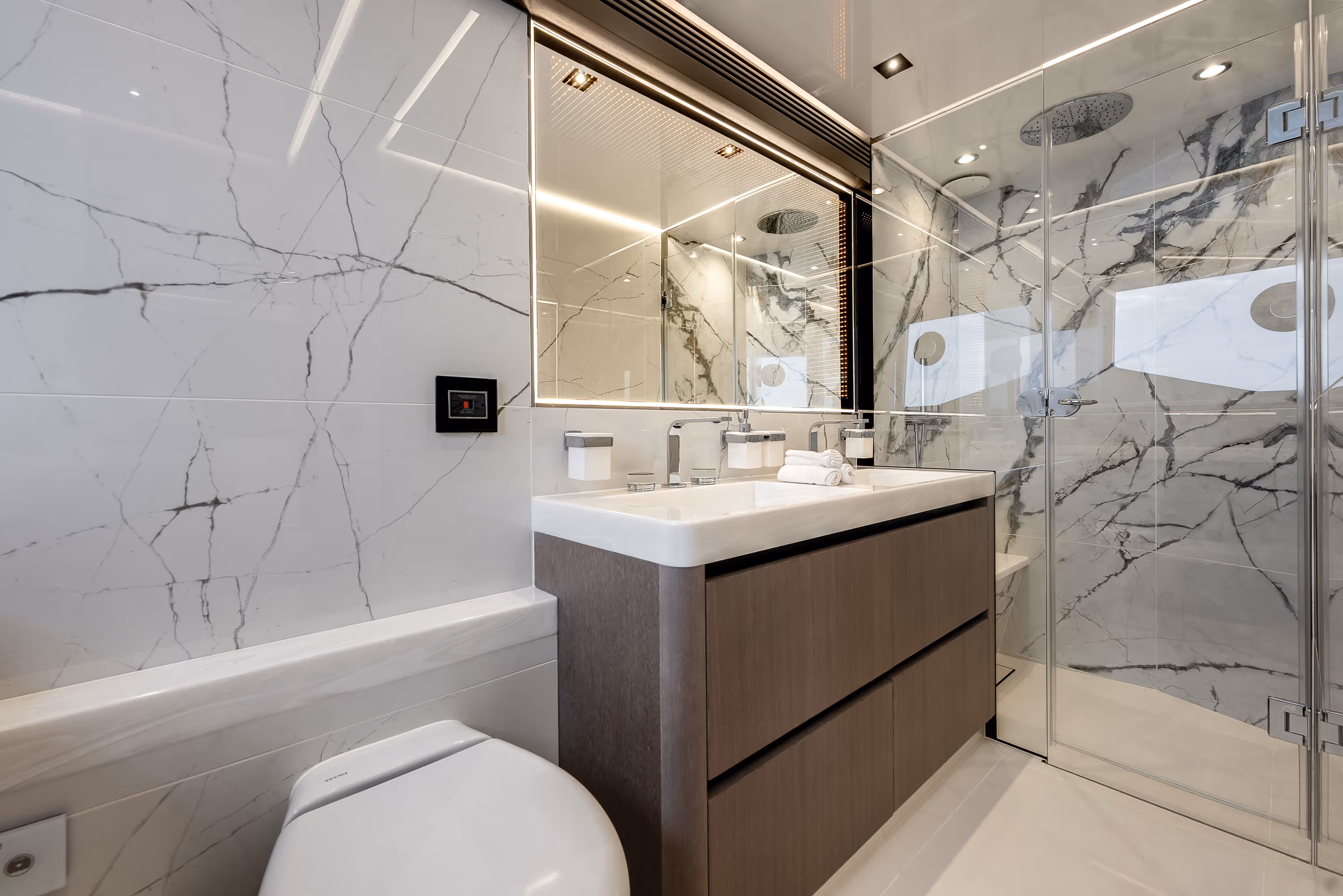 - Premium materials throughout – including natural wood veneers, hand-stitched leather, polished stone, and designer lighting – all available in a range of sophisticated combinations tailored to the owner's taste.