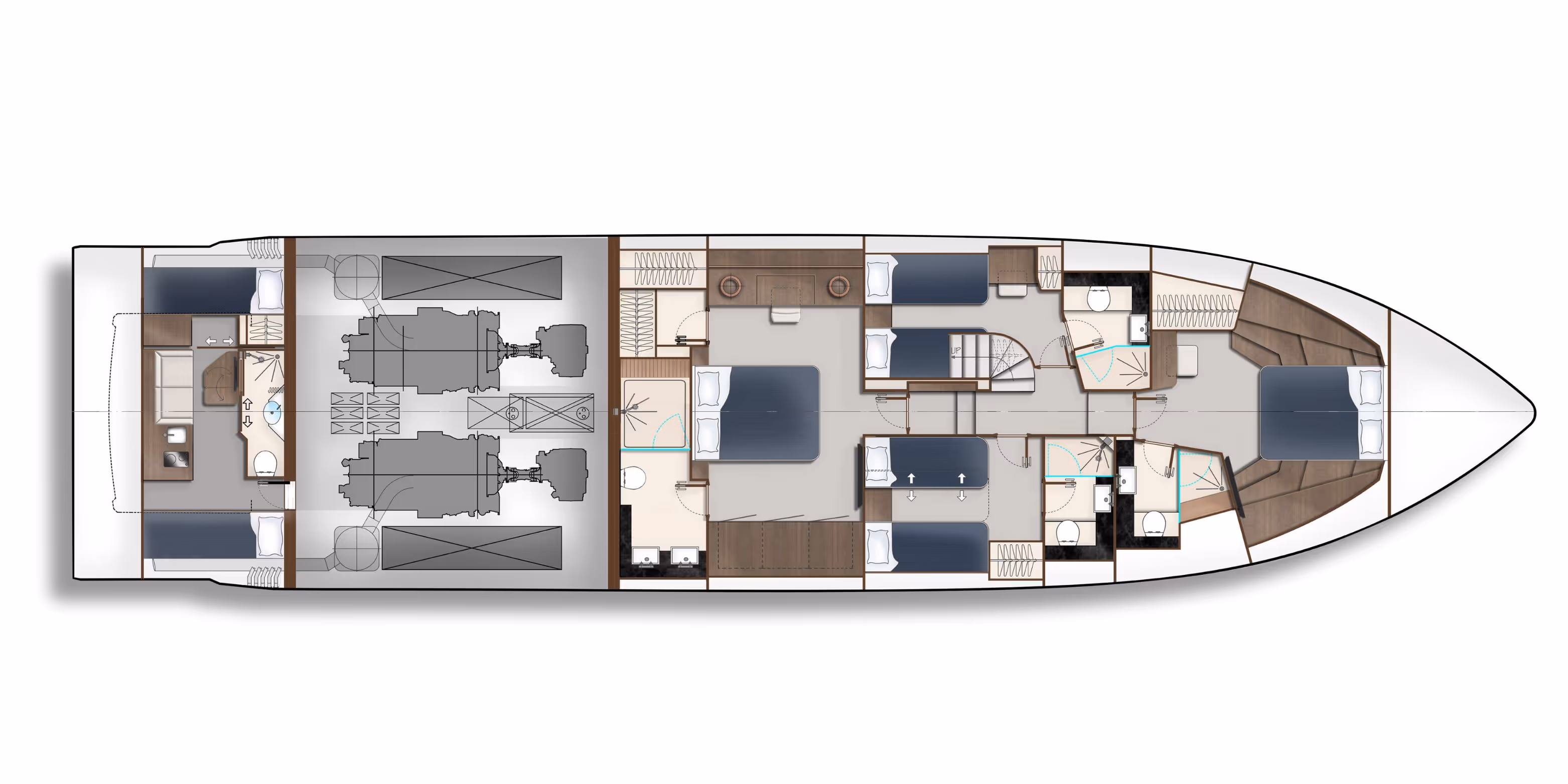 - A luxurious, full-beam owner's cabin located midship, featuring a king-size bed, walk-in wardrobe, private lounge area, and a spa-style en-suite bathroom – accessed via a separate staircase for maximum privacy